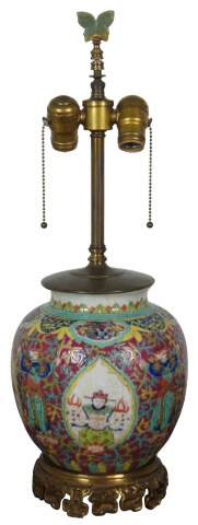 Vintage footed bronze and porcelain ginger jar table lamp featuring enameled figures with tongues of fire alternating with a dancing figure with the head of a chicken or bird. Features a jade butterfly finial and greek key boarder.
