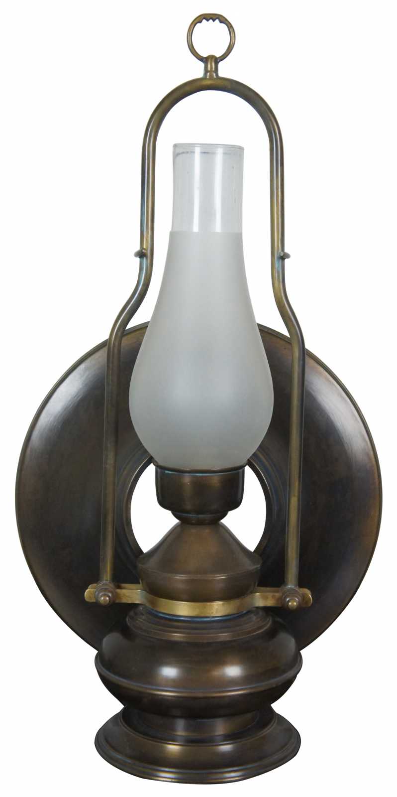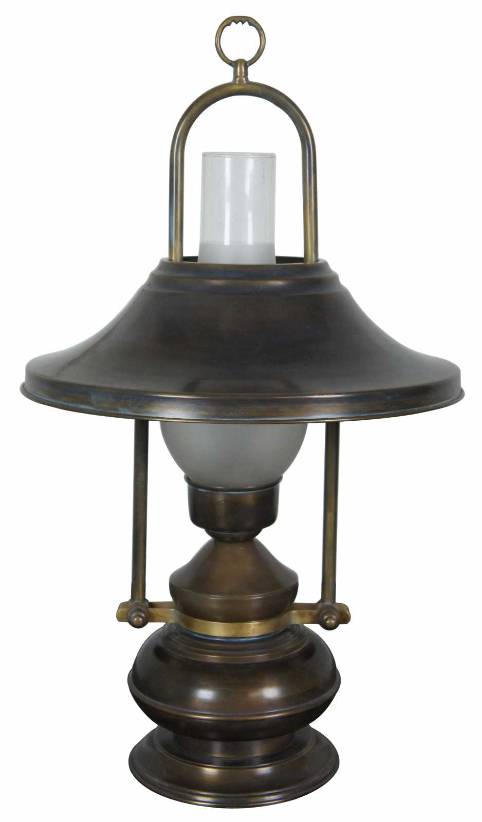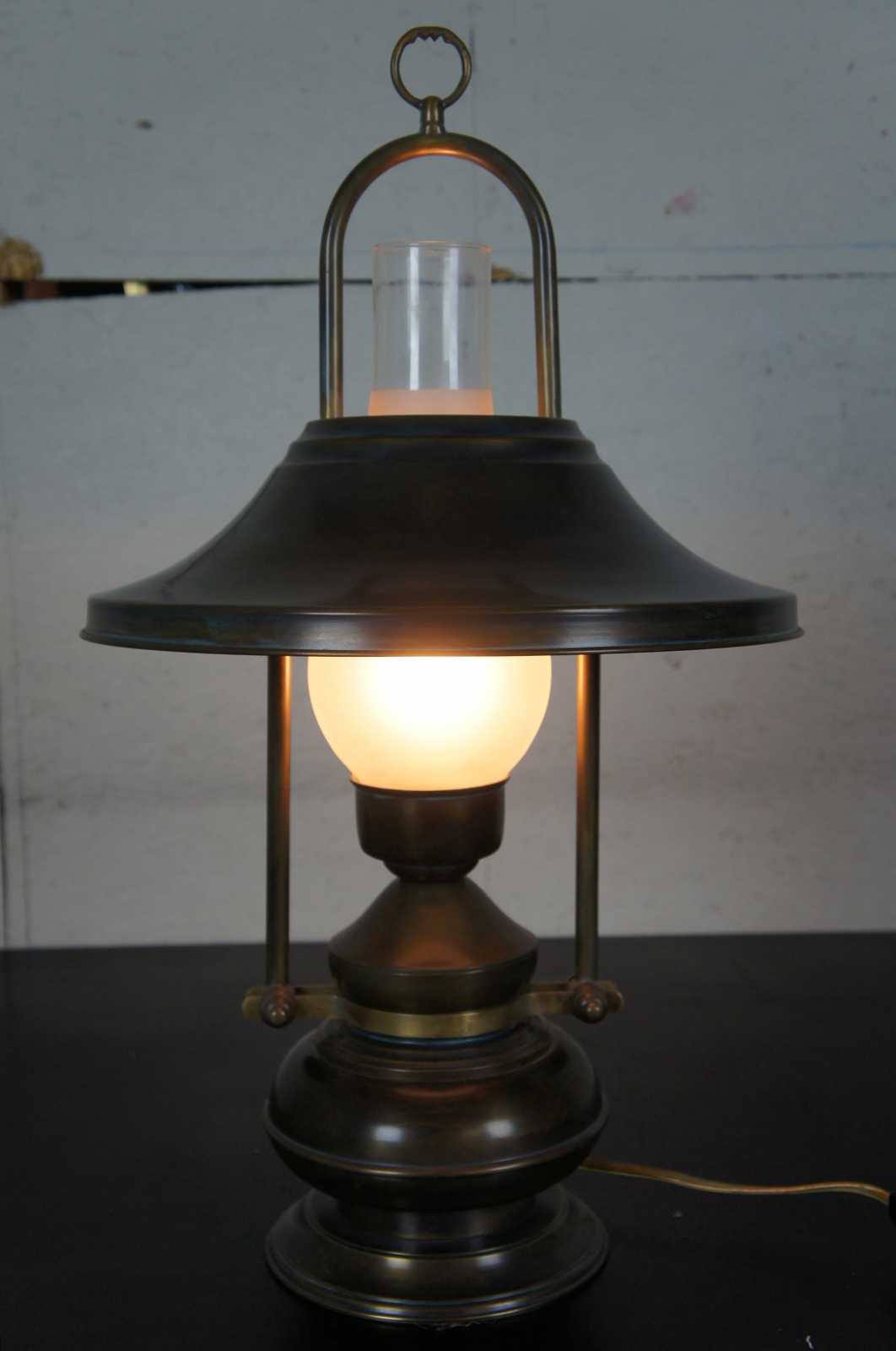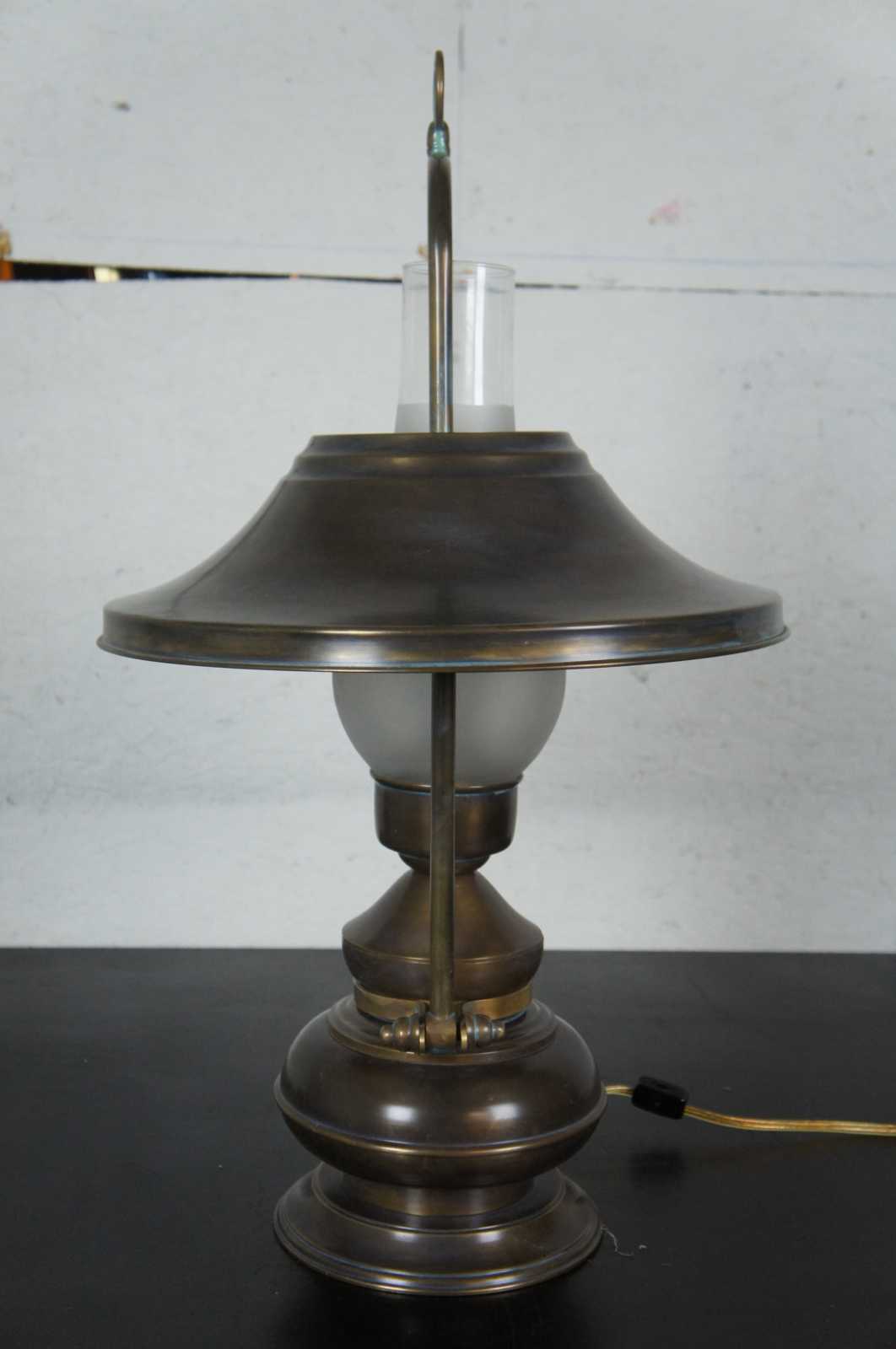 Vintage table lamp shaped like a converted oil lamp complete with glass hurricane and matching metal shade, with a antiqued brass finish.