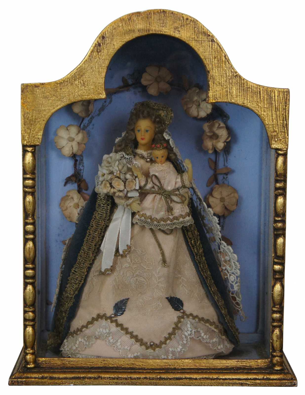 Vintage gilded tabletop display curio shrine case containing the figure of the Virgin Mary dressed as the Queen of Heaven, holding a bouquet of flowers and the Baby Jesus, surrounded by an arch of flowers.