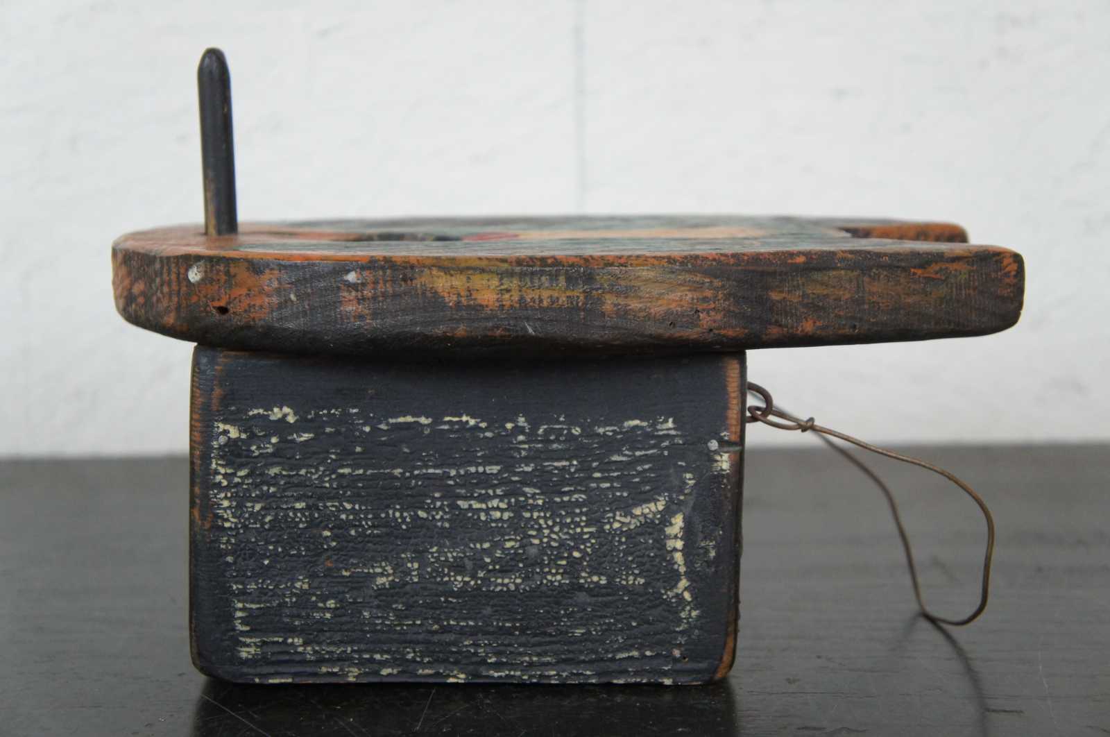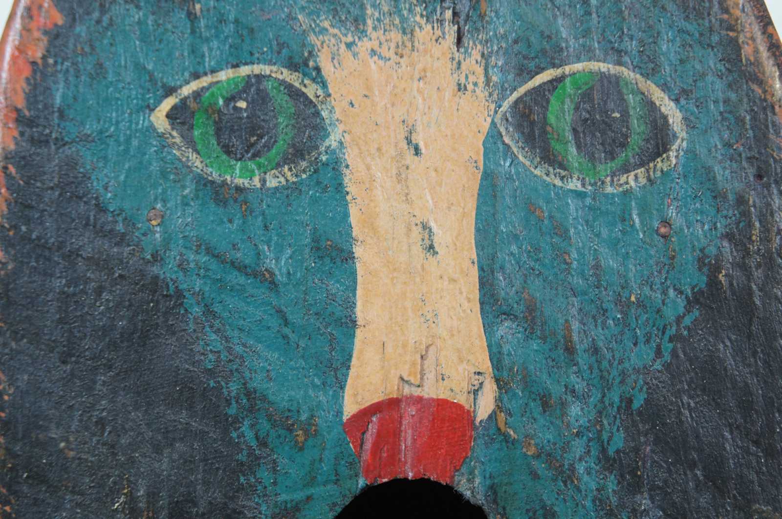 Hand made antique folk art painted wooden birdhouse shaped like a blue, white and black cat’s face.