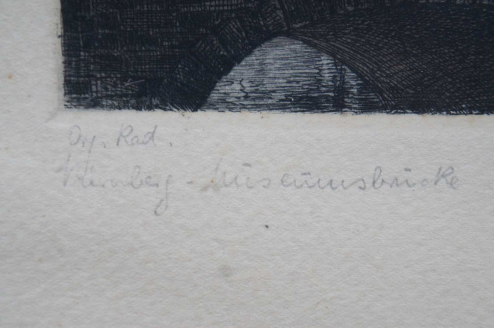 Set of three small antique colored etchings of a European cityscape and river or canal, pencil signed along the bottom.