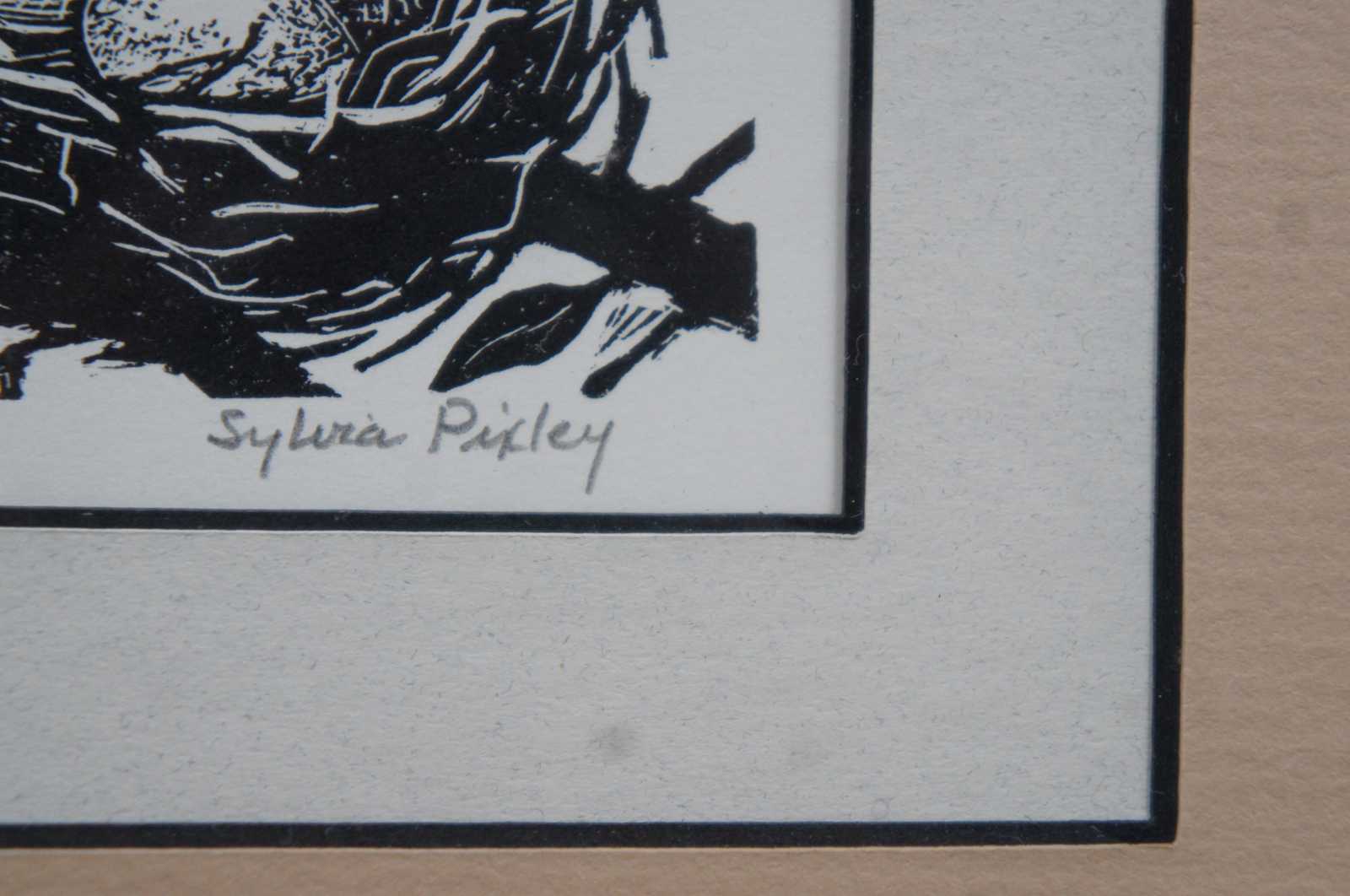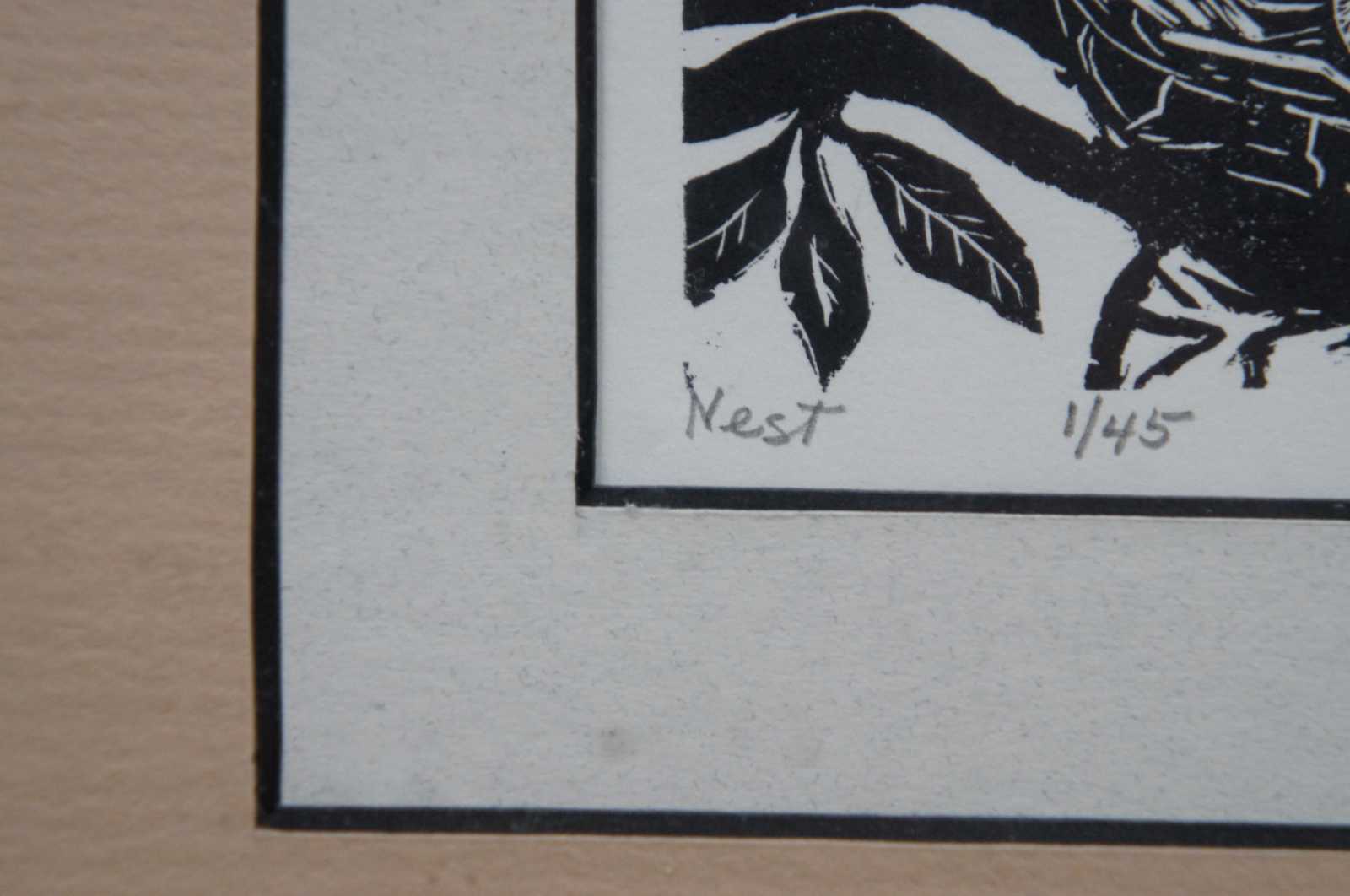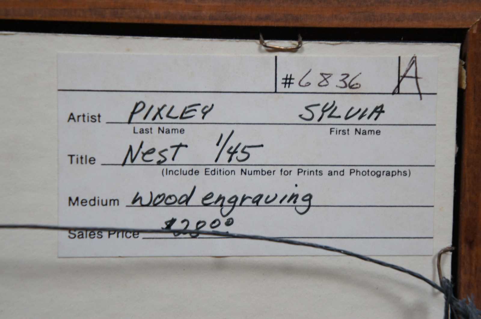 Vintage miniature wood engraving titled “Nest” signed by artist Sylvia Pixley and numbered 1/45. “Sylvia Pixley is an award winning artist who has worked in wood block reduction block prints and is now primarily working in wood engravings. Her themes most often deal with the beauty of nature with subjects ranging from intimate portraits of flowers, small animals and birds to tranquil wooded settings and grand landscapes. She is based in Monroe Michigan.