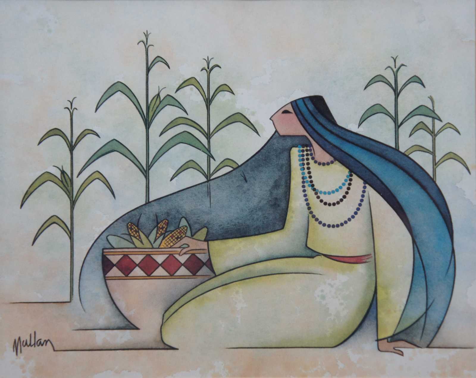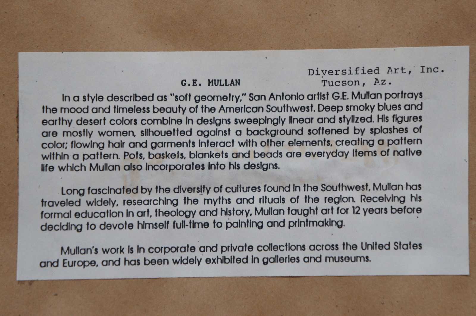 Vintage southwestern style print by G.E. Mullan showing a Native American woman harvesting corn. G.E. Mullan lived from February 13, 1943 - October 27, 2015. The unique painting style of G. E. Mullan is noted for its lyrical line set against an ordered and complex geometry of interdependent shapes. His technique of precise color overlaid on fluid washes and splatters of color creates a visual excitement that involves the viewer and invites close study of the technical excellence of the work. In other media, such as Prismacolor, lithography, and collage, the artist employs a variety of techniques suitable to each distinct medium to achieve the same texture and visual activity.