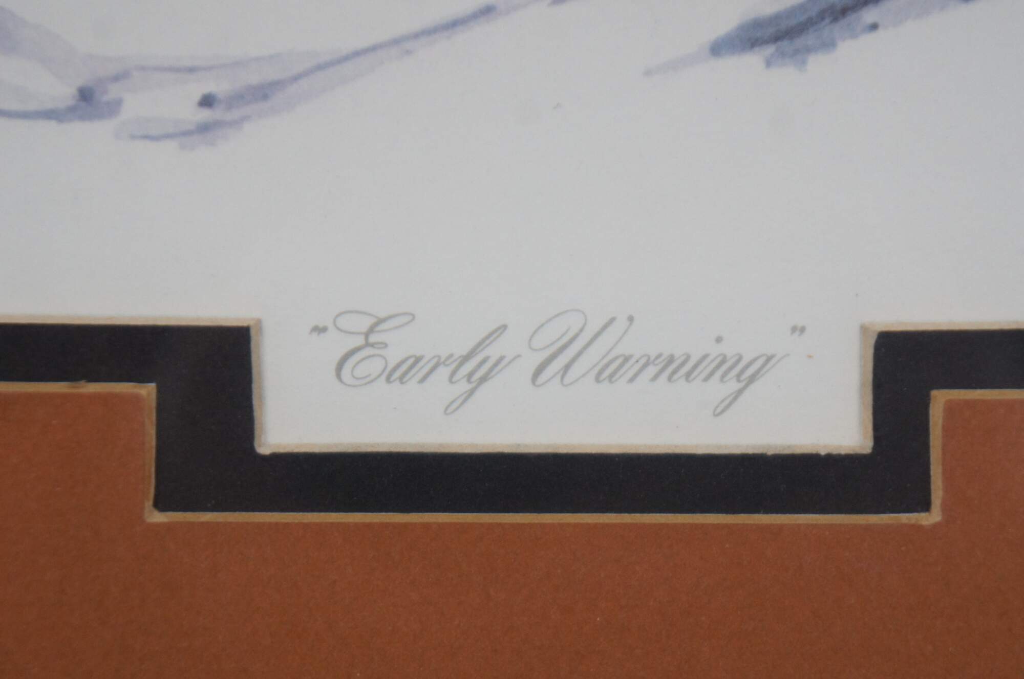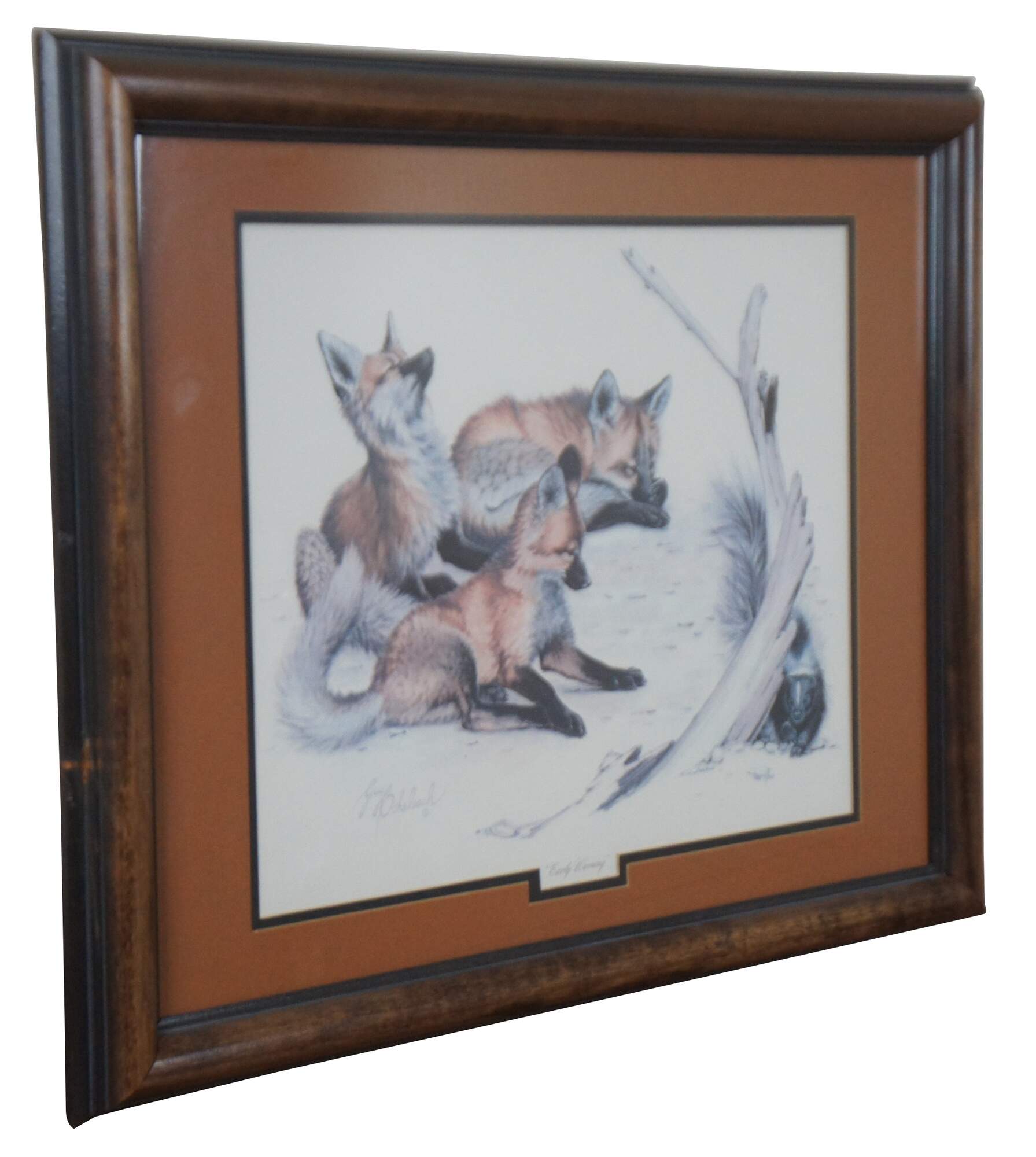 Vintage lithograph print by Guy Coheleach titled “Early Warning,” showing three red foxes being rebuffed by a defensive skunk. Impressed logo by the publisher in the lower left. An imprint is faintly visible next to the printed artist’s name, resembling his signature. “Guy Coheleach was born in New York City in 1933, and graduated from Cooper Union in 1956 after a military interruption serving in Korea with the 65th Combat Engineers from 1954-'55.