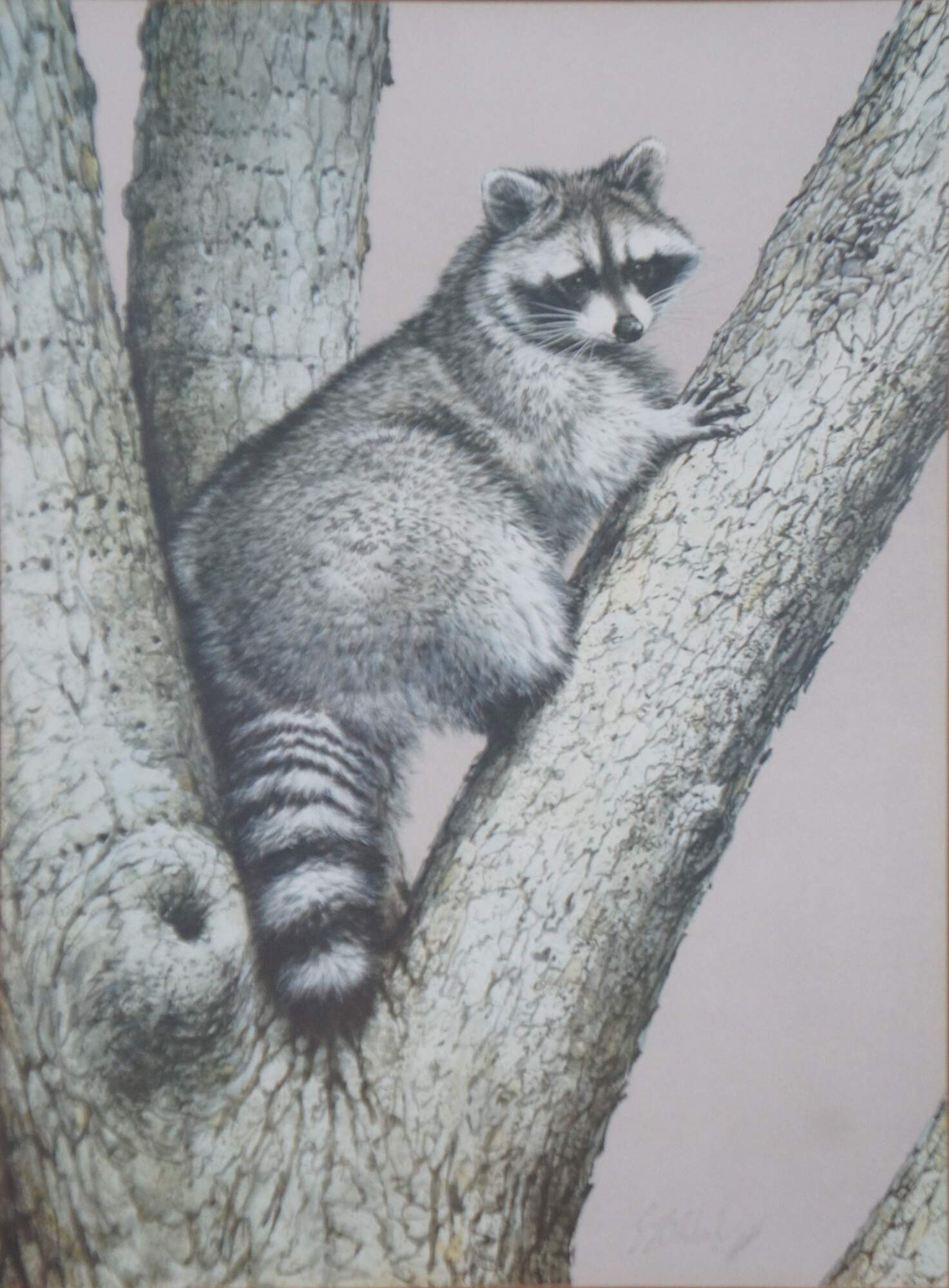 Vintage pencil signed lithograph print by Guy Coheleach titled “Up a Tree, “ featuring a raccoon perched between the limbs of a tree. “Guy Coheleach was born in New York City in 1933, and graduated from Cooper Union in 1956 after a military interruption serving in Korea with the 65th Combat Engineers from 1954-'55.