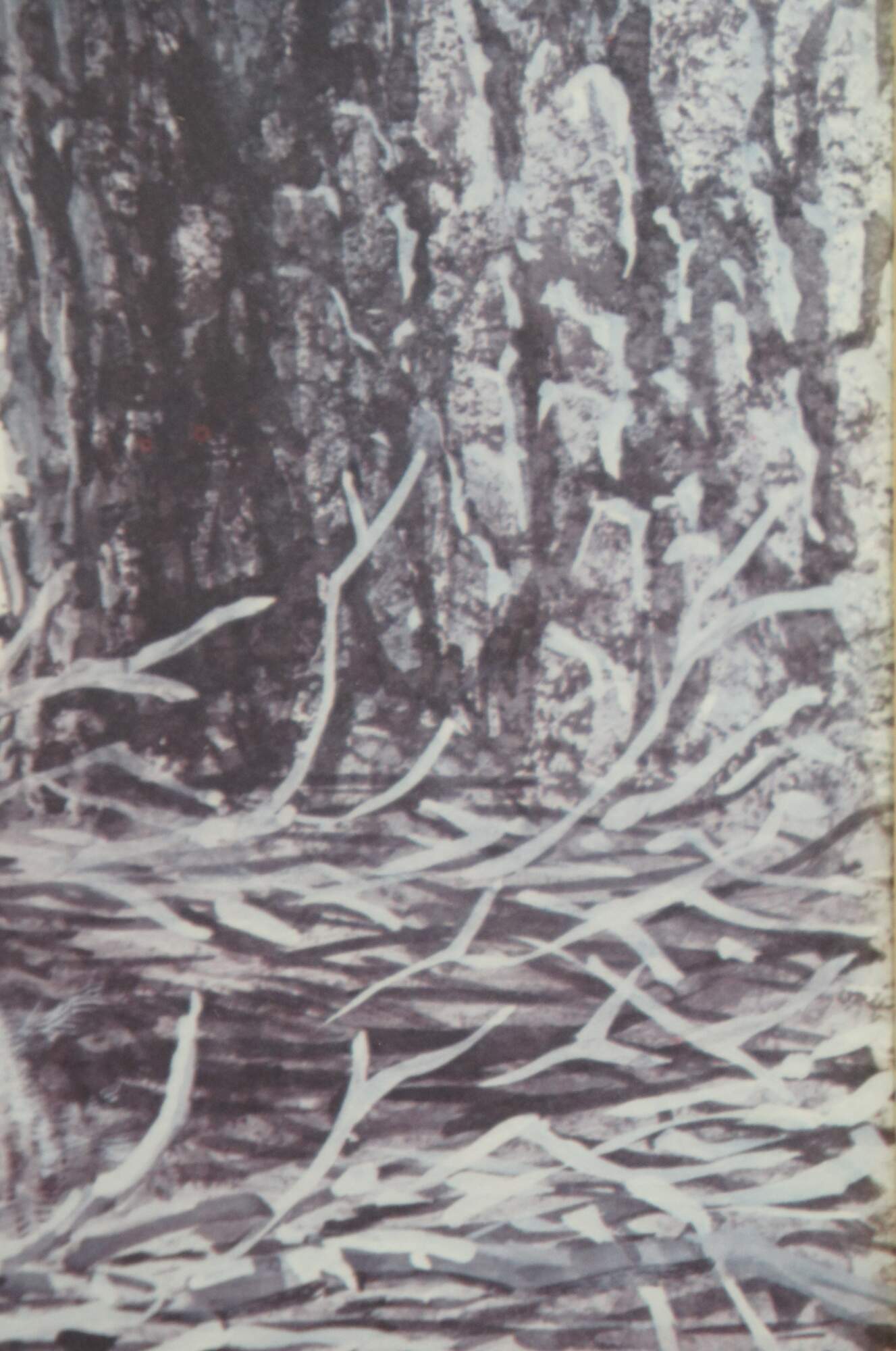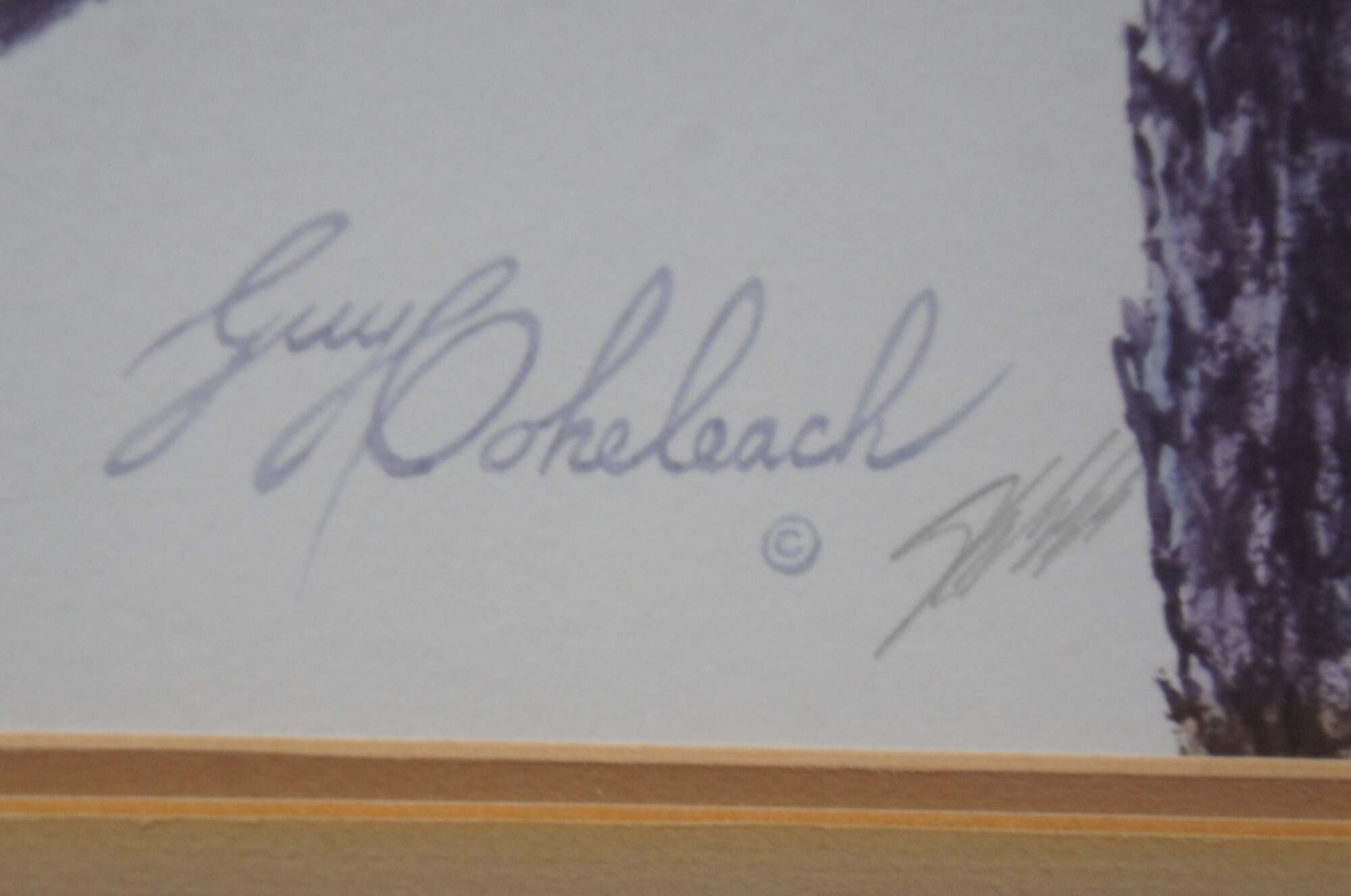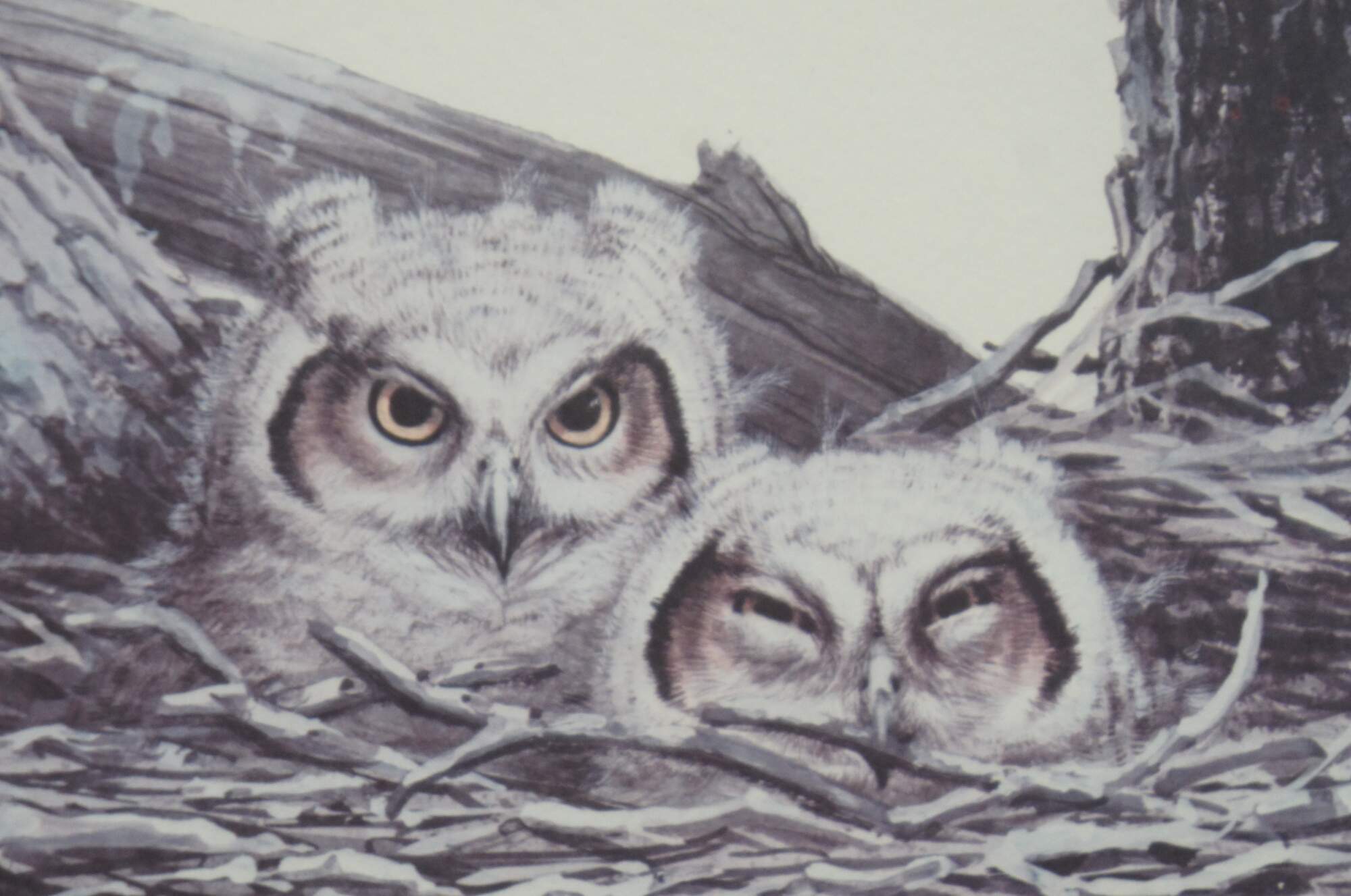 Vintage pencil signed lithograph print by Guy Coheleach titled “Young Great Horned Owls,” showing four of the birds nestled in a nest and perched in the branched of a tree.“Guy Coheleach was born in New York City in 1933, and graduated from Cooper Union in 1956 after a military interruption serving in Korea with the 65th Combat Engineers from 1954-'55.
