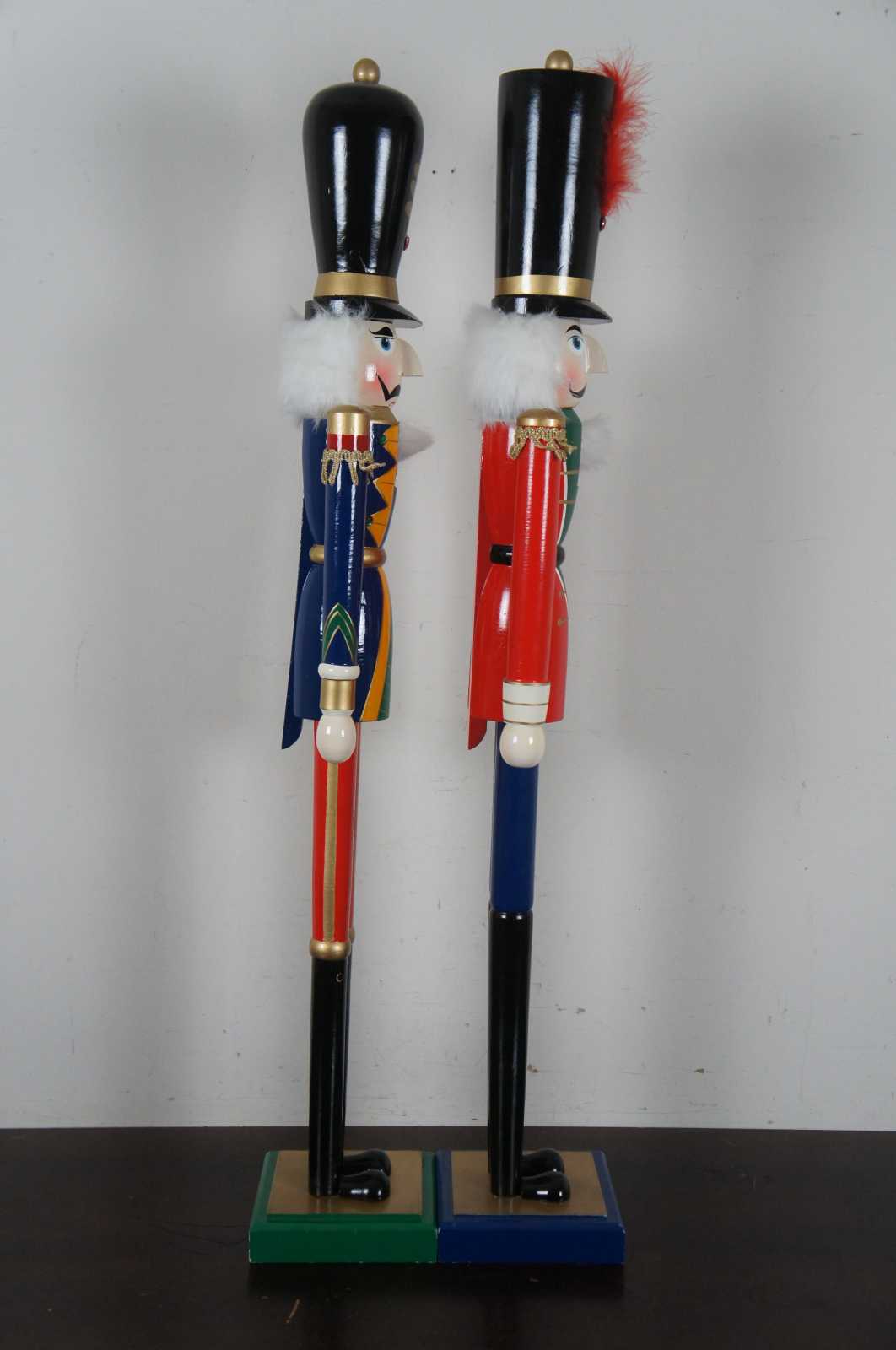 Pair of two whimsicle nutcracker figurines. Features two tall and skinny hand painted nutcrackers with functional mouths.