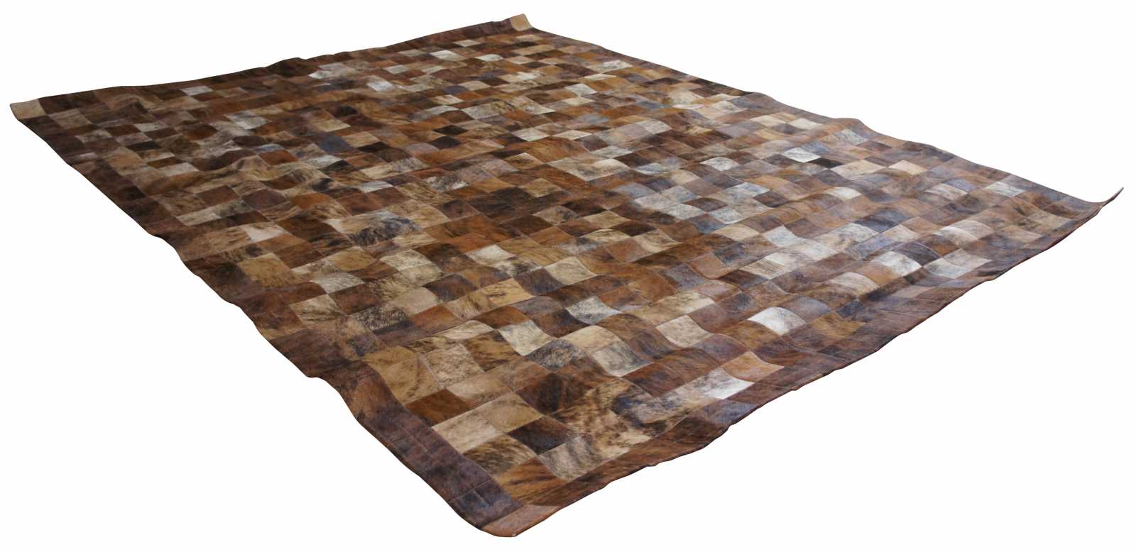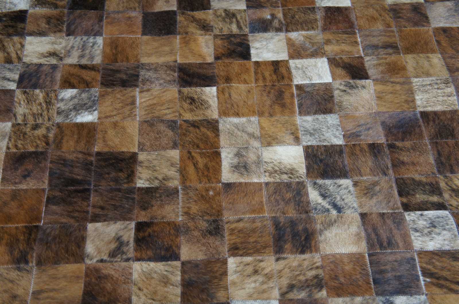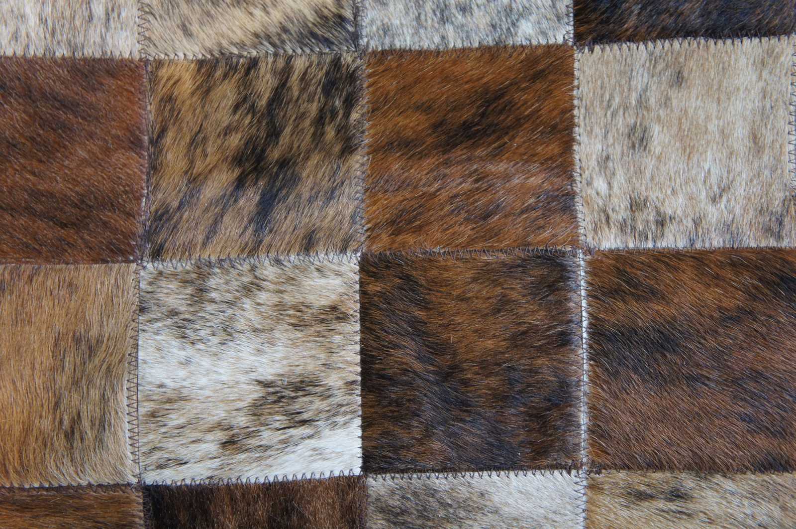 Vintage cow hide patchwork area rug featuring geometric squares of brown, white and black.