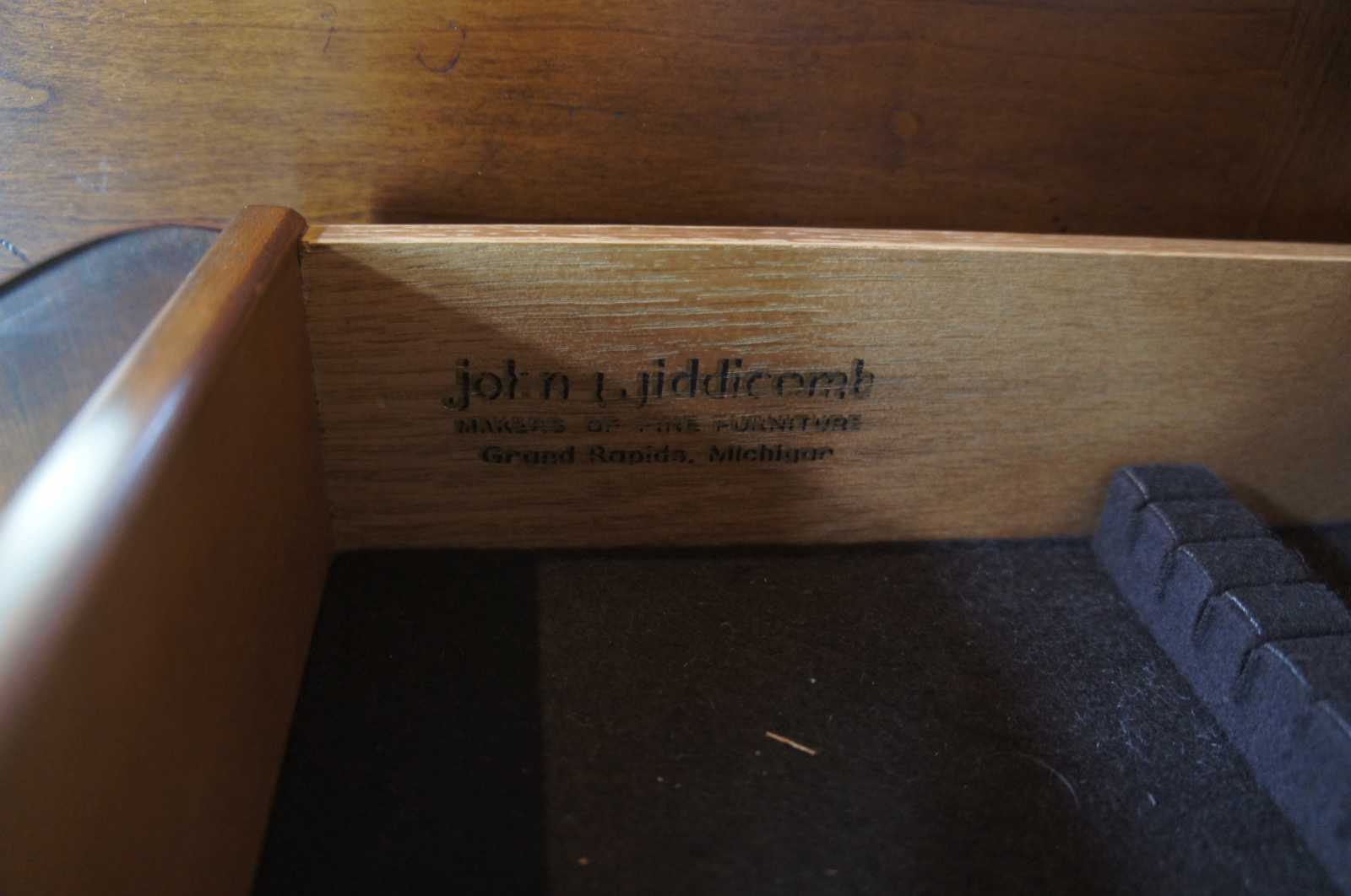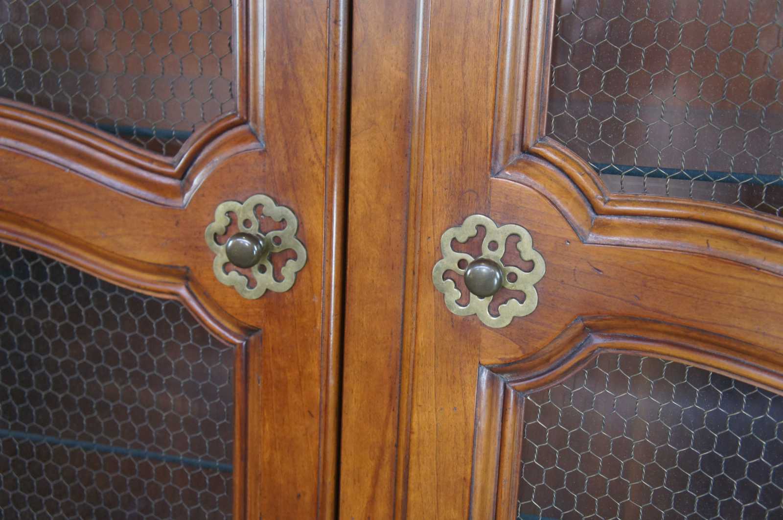 Circa 1980s John Widdicomb china cabinet. Made from walnut with serpentine shape, mesh / wire doors with three illuminated glass shelves, four silverware drawers and a cabinet. Draws inspiration from Louis XV and French Country / Provincial Styling. John Widdicomb of Grand Rapids, Michigan operated from 1897-2002.
