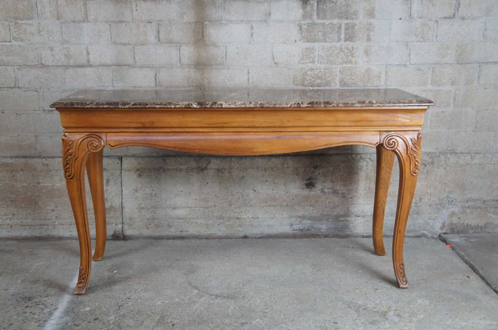 Thomasville Furniture French Country sofa table, 27131-722. Circa 1990s. Made of oak with serpentine form and cabriole legs. Features two drawers and a brown / tan / white marble top.