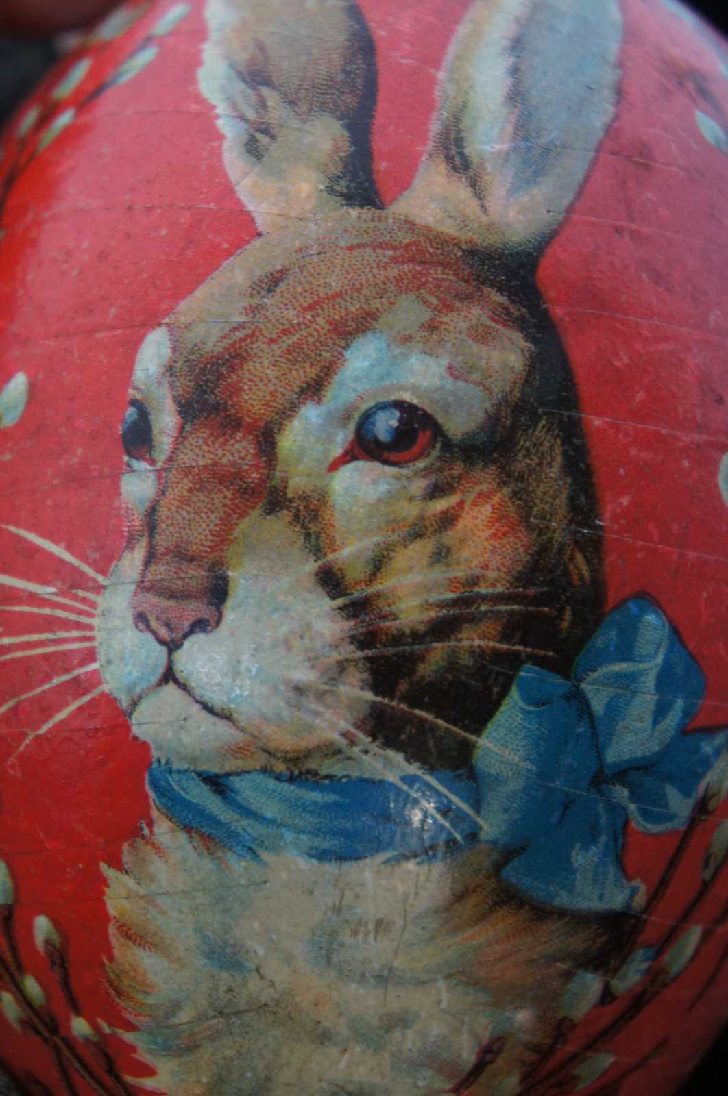 Antique German red paper mache Easter egg candy container, featuring a lithograph of a rabbit wearing a blue bow, framed by pussy willows, with paper lace trim around the inside edge.