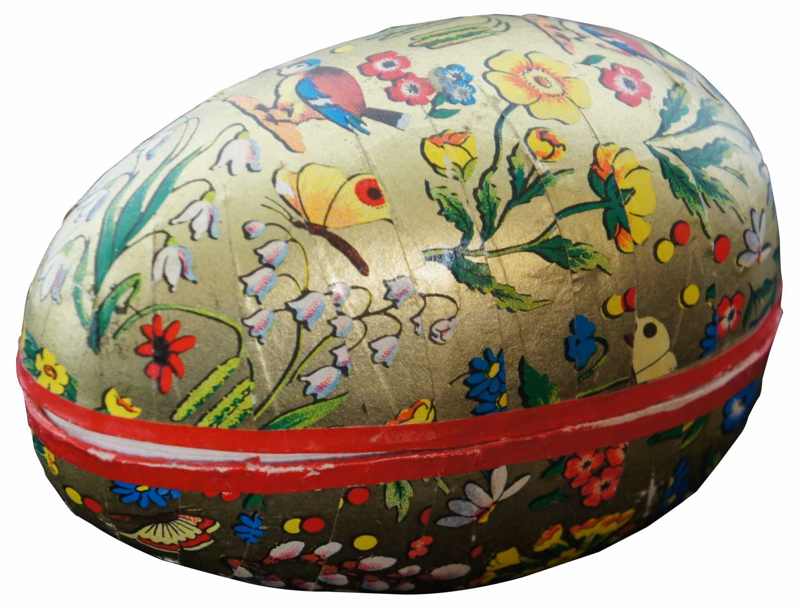 Antique West Germany paper mache Easter egg candy container in metallic gold with images of butterflies, birds, lily of the valley, pussy willows, and other flowers.