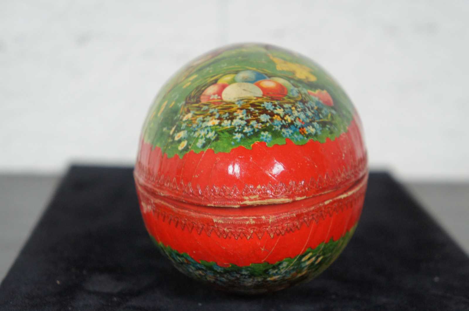 Antique German paper mache Easter egg candy container, featuring a lithograph landscape of a rabbit leaping beneath lily of the valley blossoms, past a chick by a nest of Easter eggs.