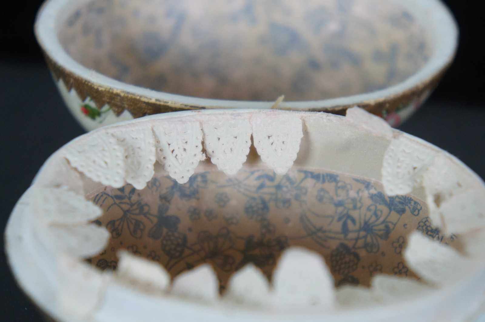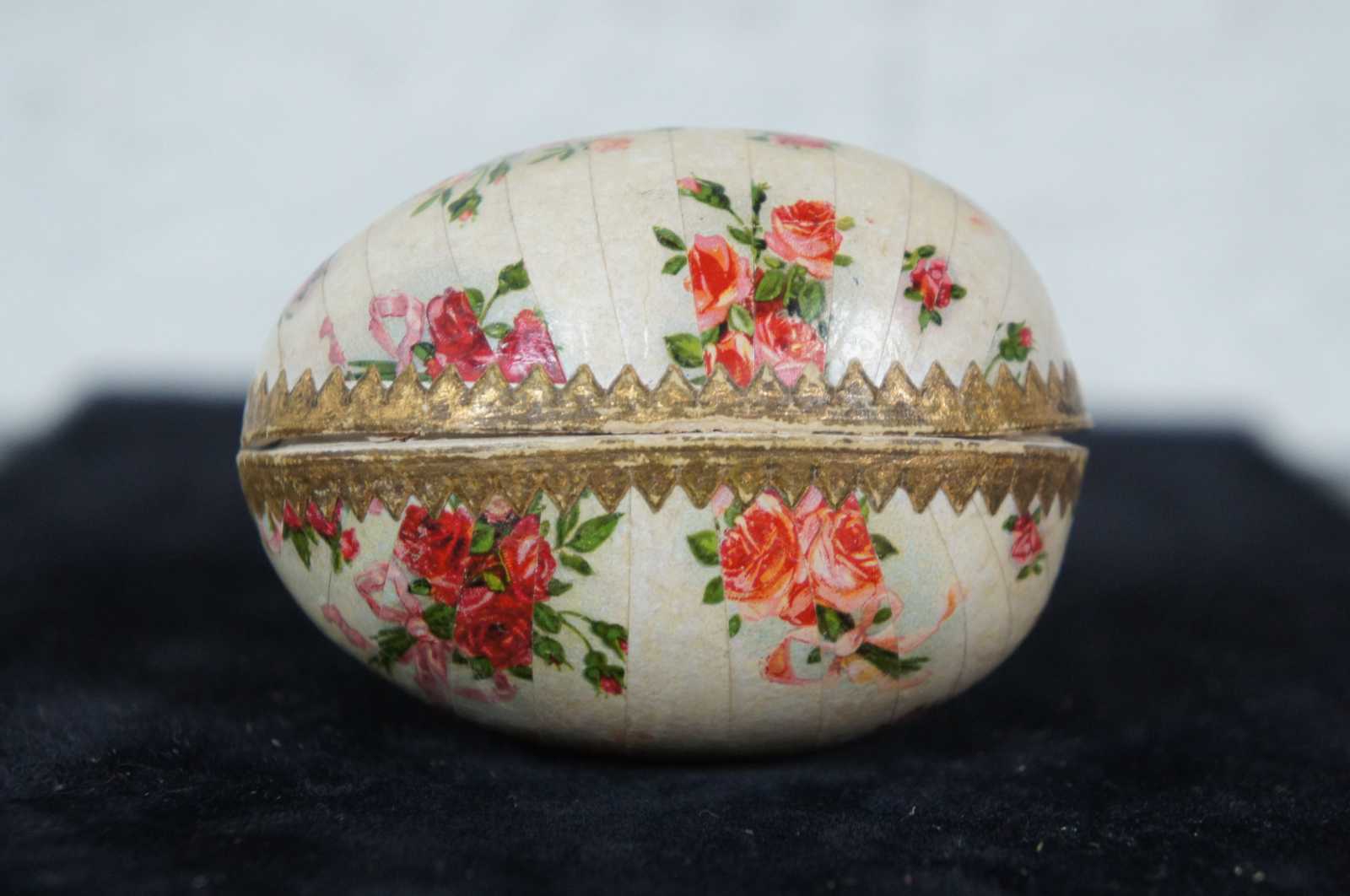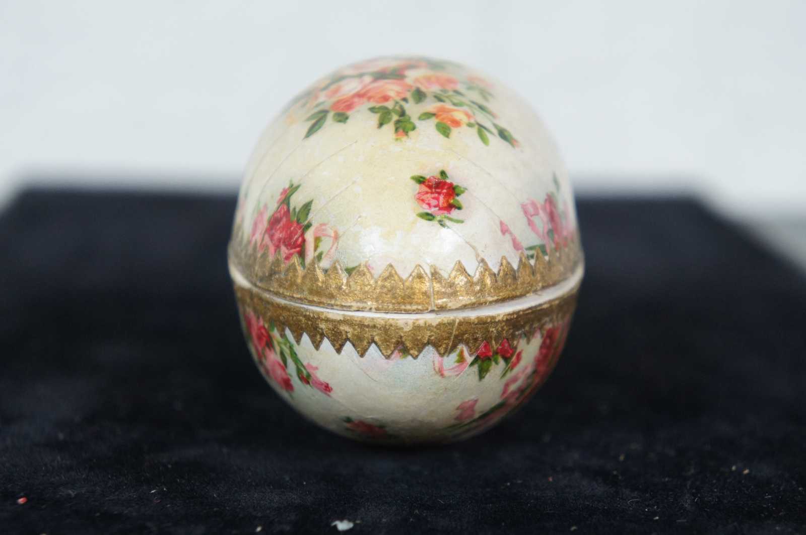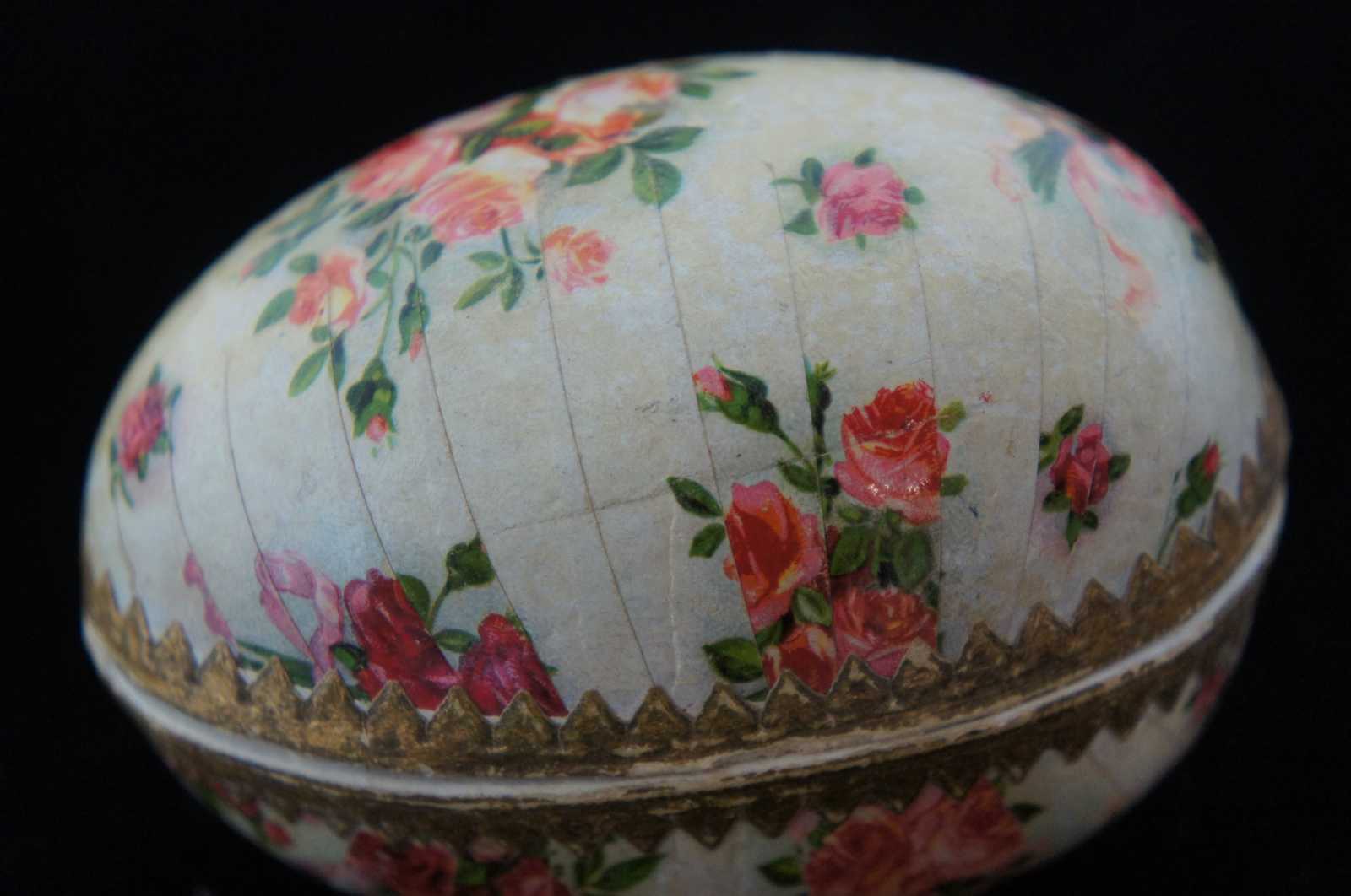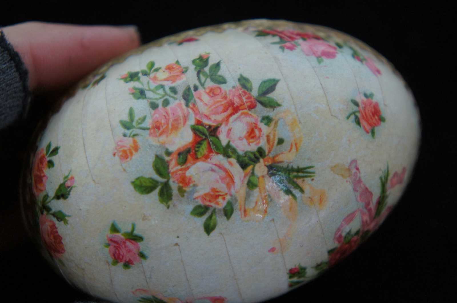 Antique German paper mache Easter egg candy container, featuring a lithograph pattern of pink and peach roses, with paper lace trim around the inside edge.