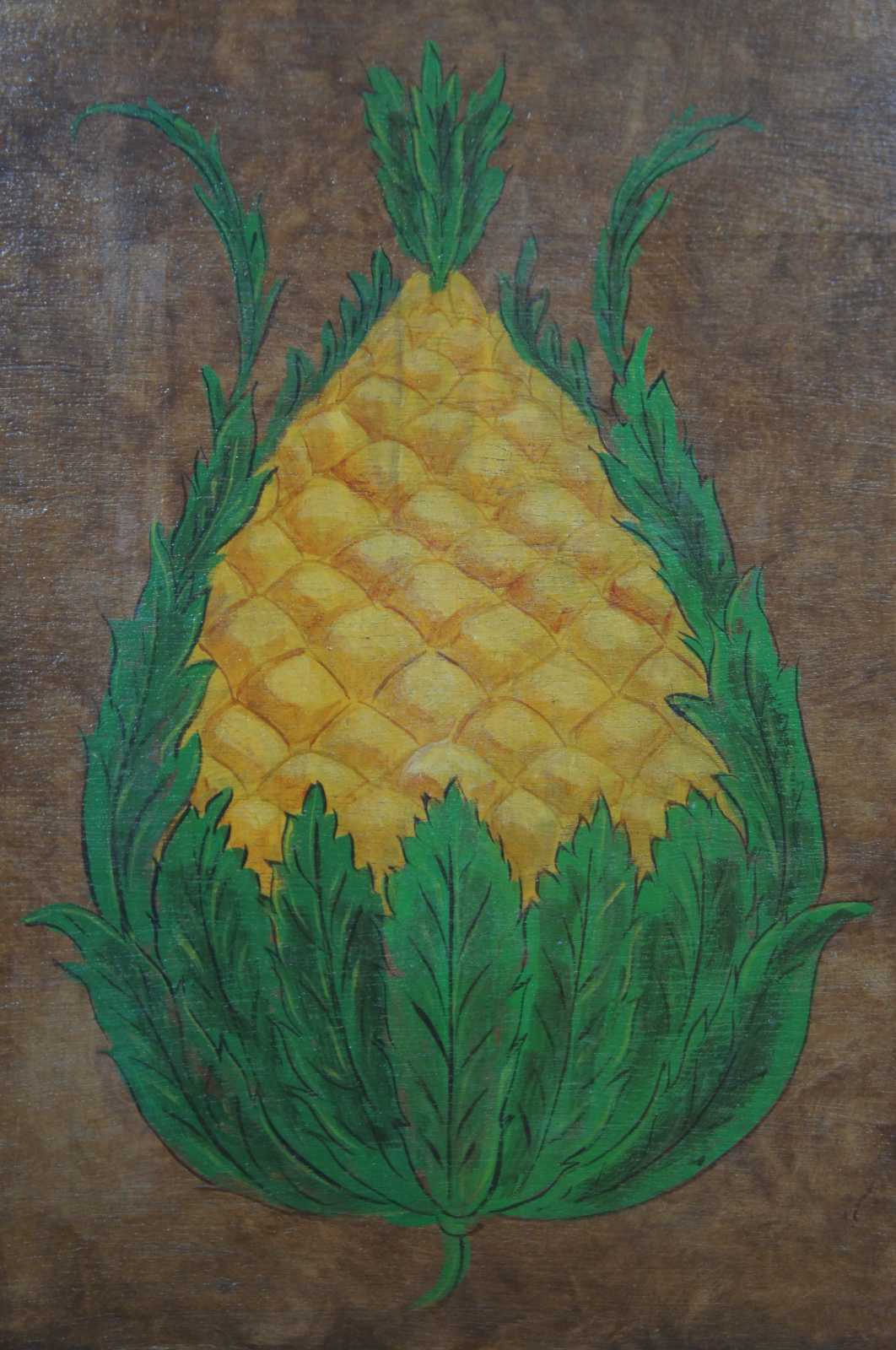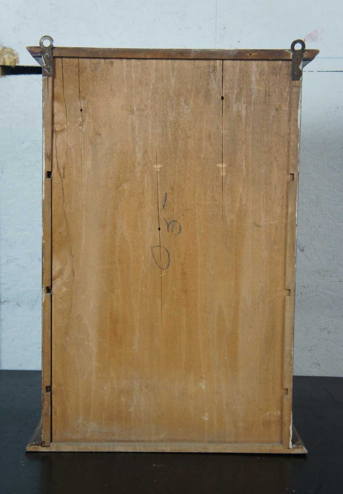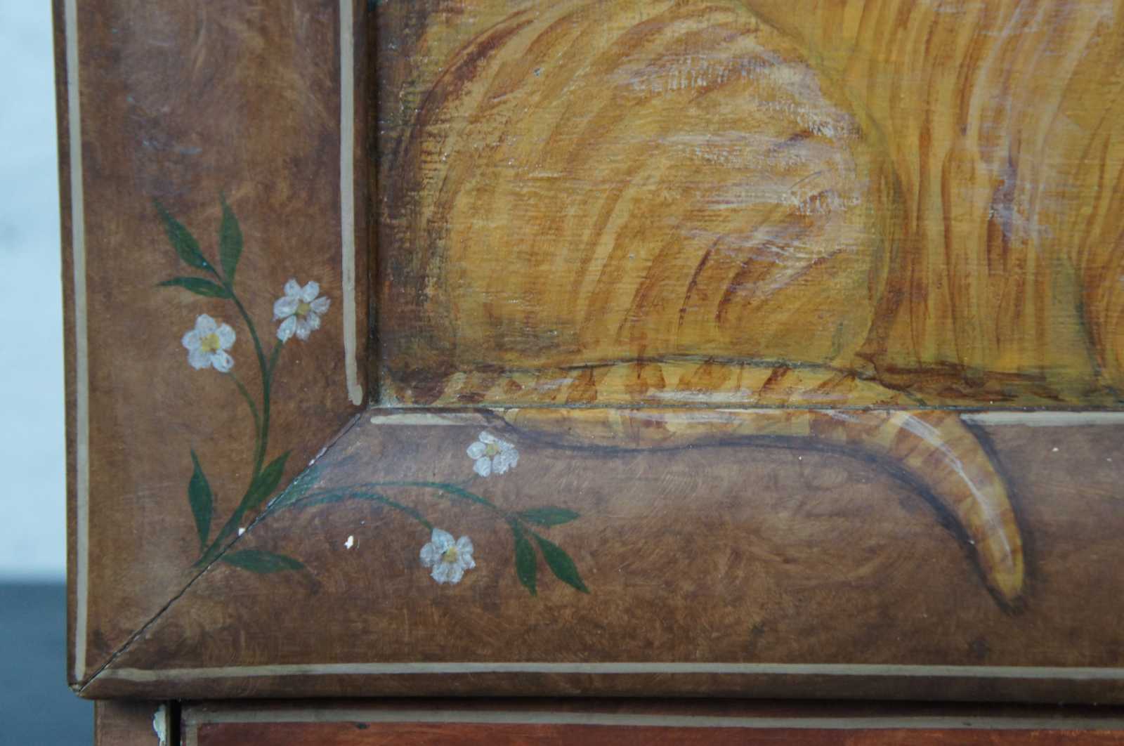 Antique wooden wall hanging medicine cabinet painted with flower accents and a central panel painted to look like the cabinet is full of objects and a sleeping cat. Interior is painted blue with a pineapple on the back of the door.