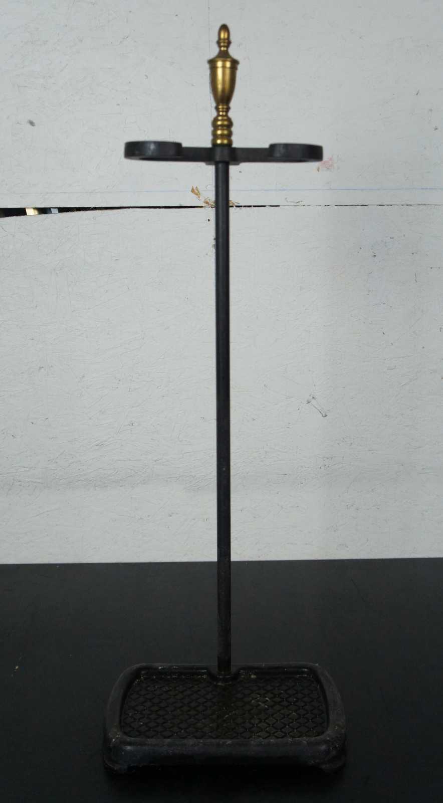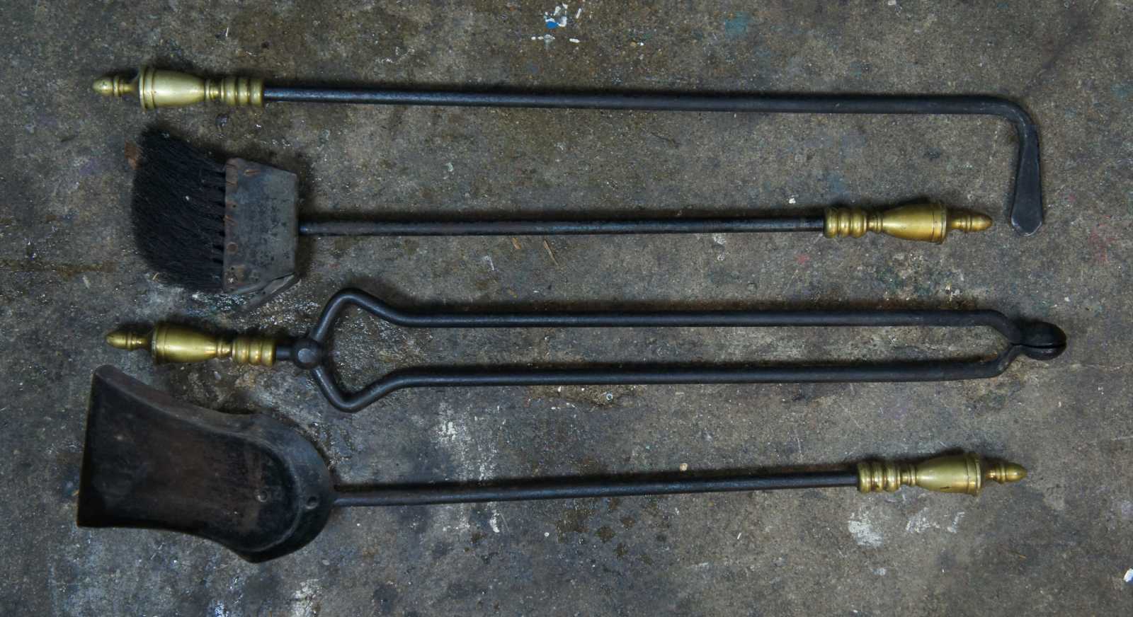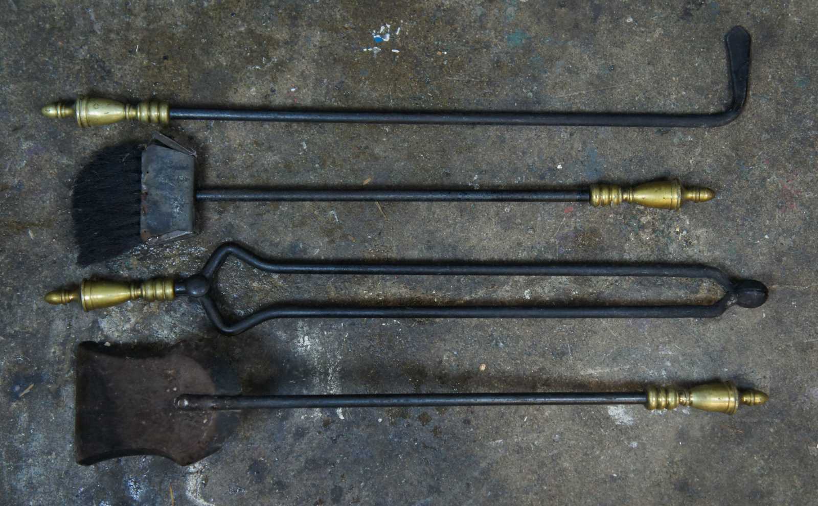 Mid century cast iron and brass fireplace tools with federal style finials.