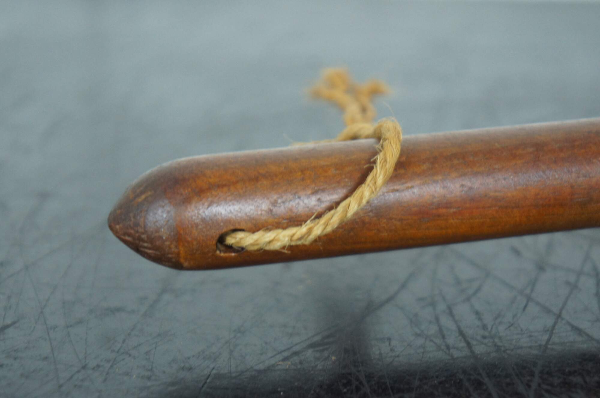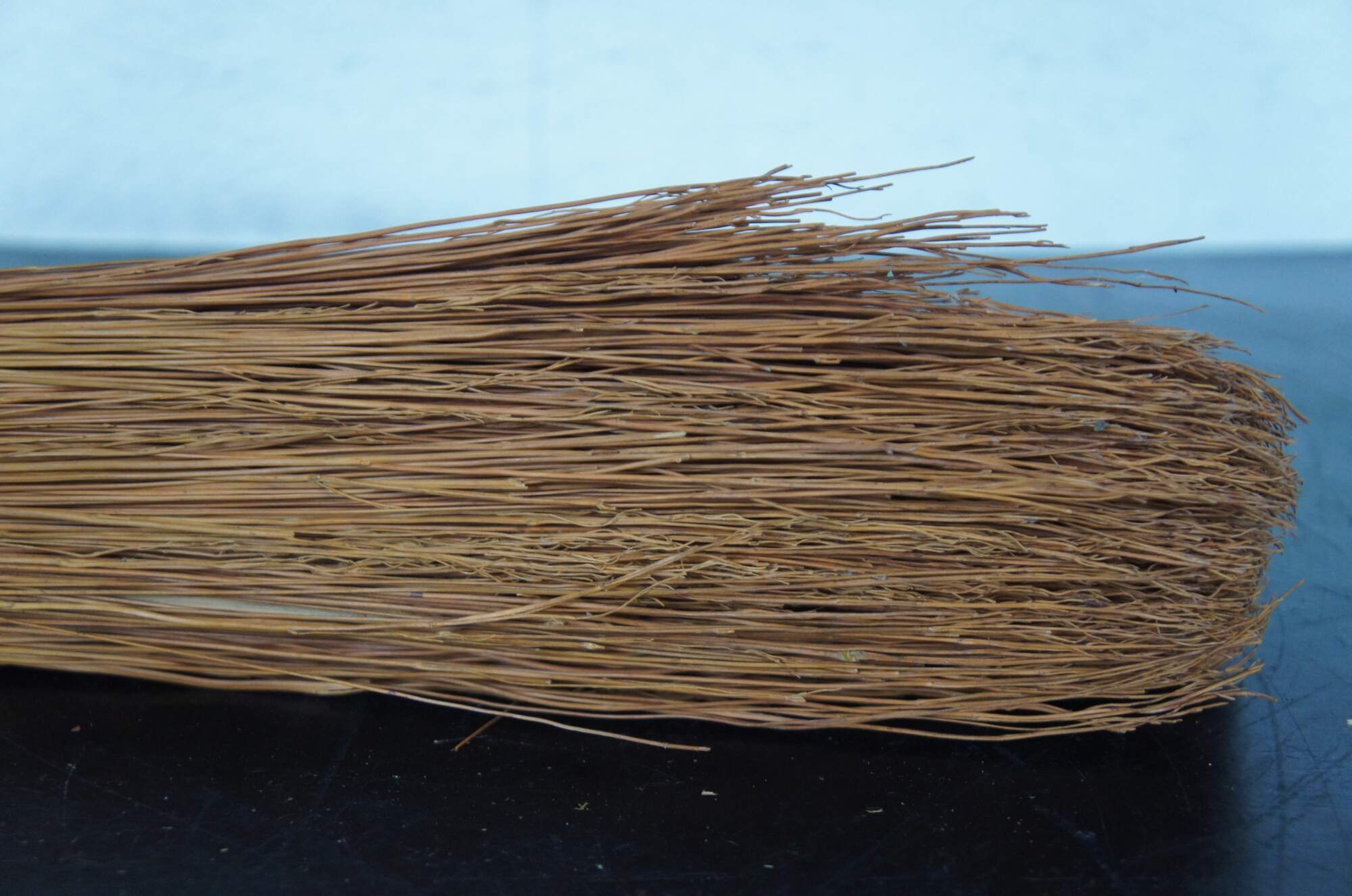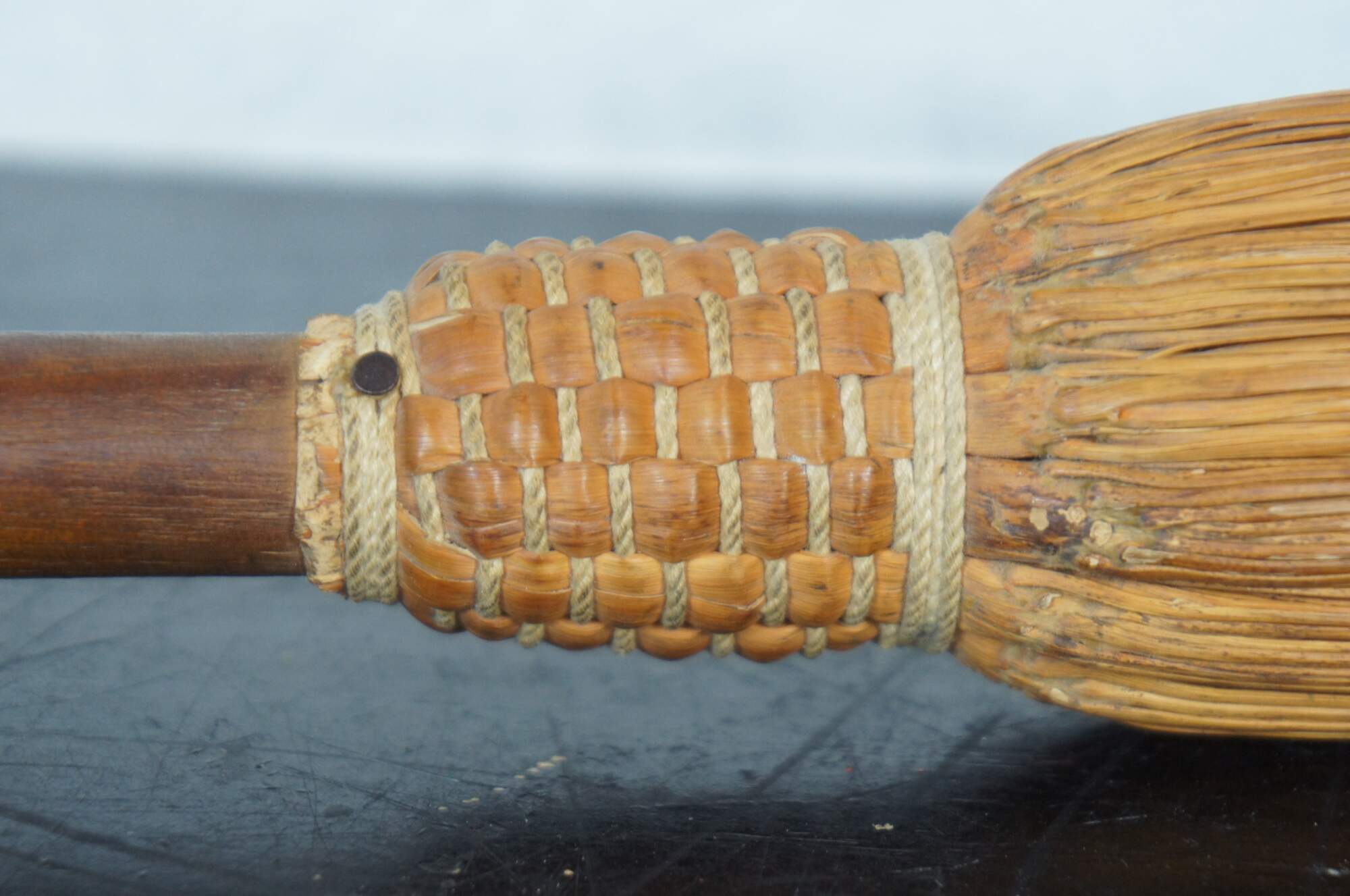 Vintage hand made straw and wood broom with a smooth handle and woven design at the base of the bristles, fashioned by Berea College Student Industries of Berea, Kentucky.