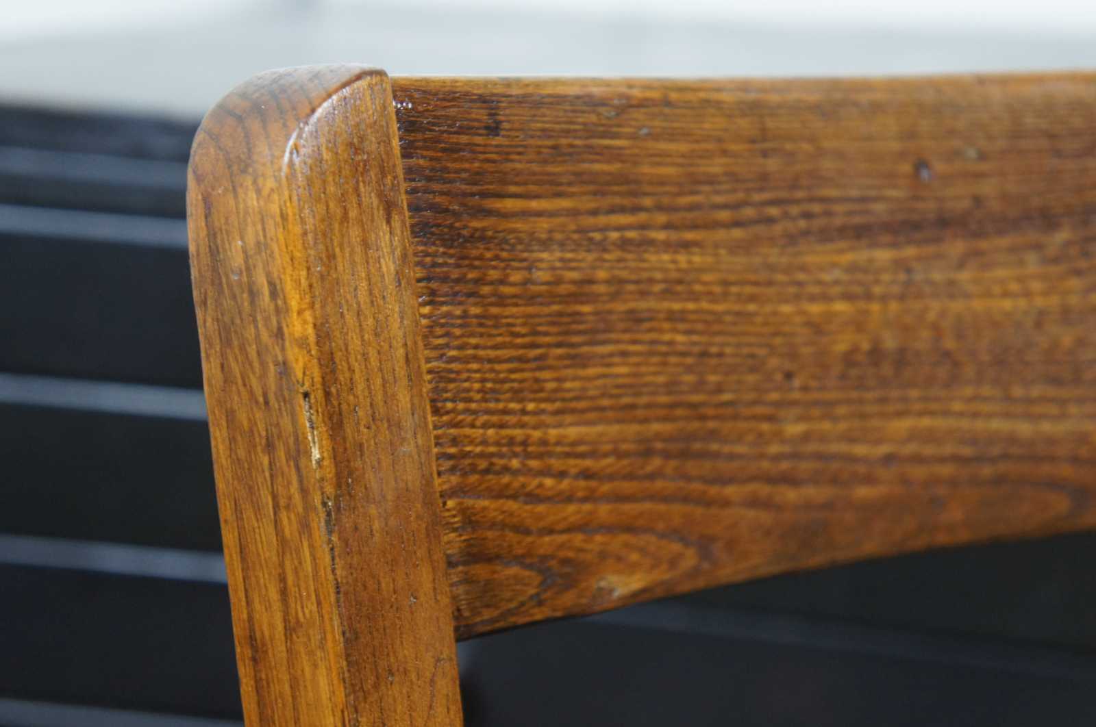 Antique country style oak counter or bar stool. Marked Rec Ins along the back of seat.