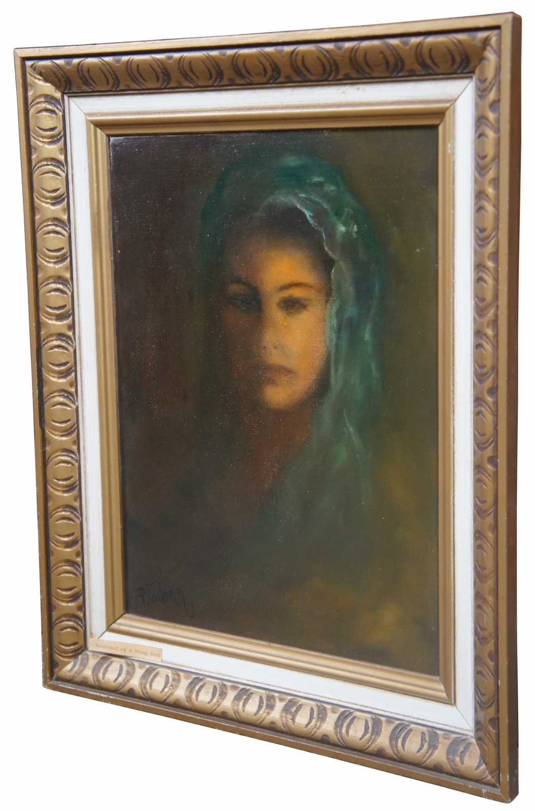Vintage Giclee print on canvas titled “Portrait of a Young Girl” and signed P. Todora showing a young woman with a tear on her cheek and wearing a teal veil.