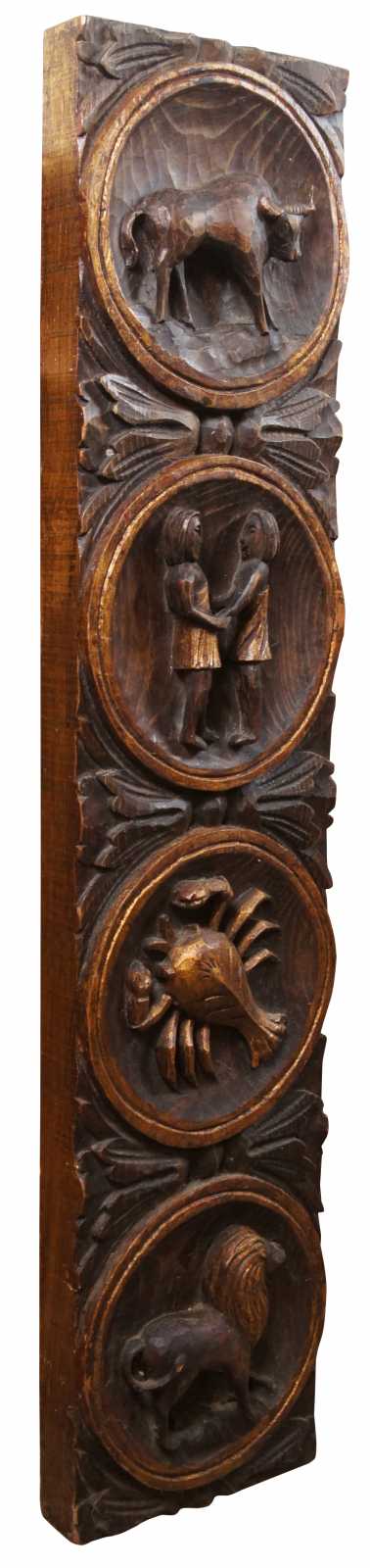 Made in Spain, vintage hand carved wooden Zodiac wall plaque featuring four Greek astrological symbols – Taurus the Bull / Ox, Gemini the Twins, Cancer or Scorpio the Scorpion / Crab / Lobster, and Leo the Lion.
