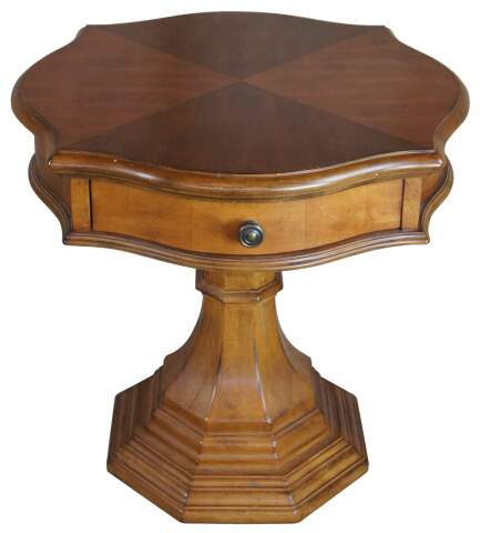Late 20th century serpentine side table. Made from birch with a two tone matchbook veneered top over octagonal base. Includes a drawer central drawer with oak construction.