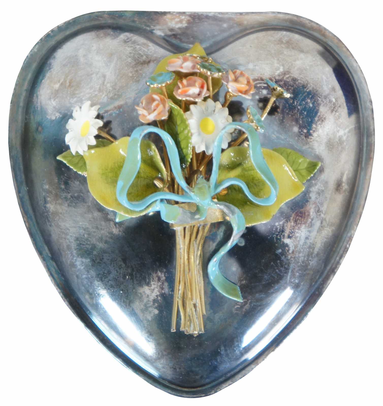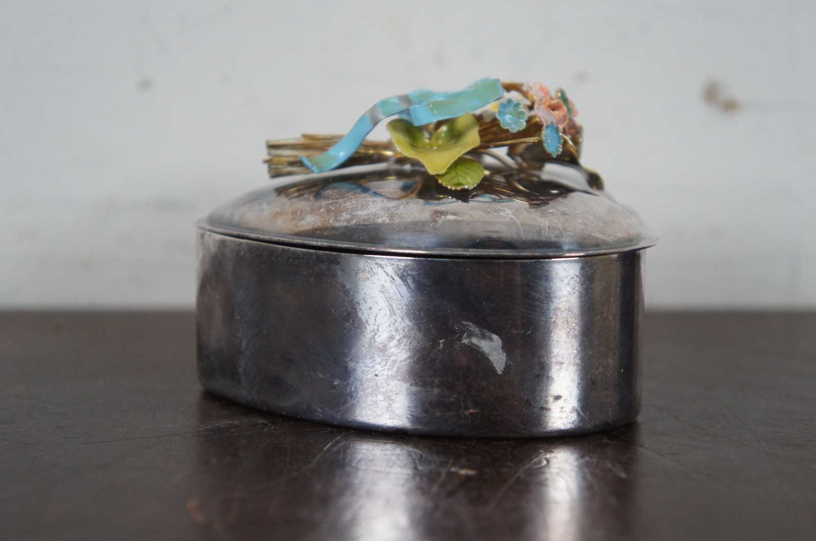 Vintage Gorham silver platee heart shaped trinket or keepsake box YC88, decorated with a bouquet of enameled flowers and lined in baby blue velvet. Comes with original purchase box from Jaccards.