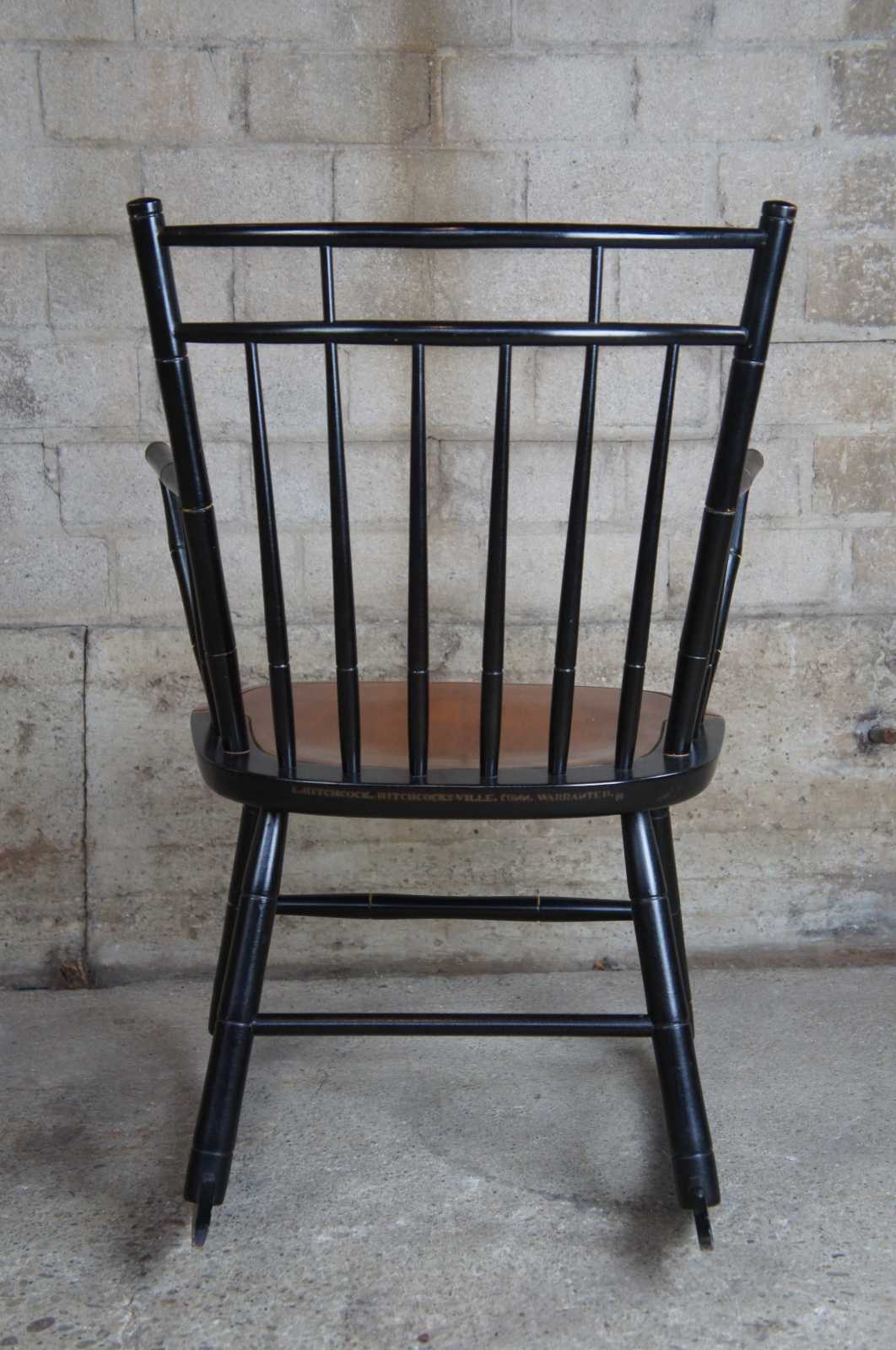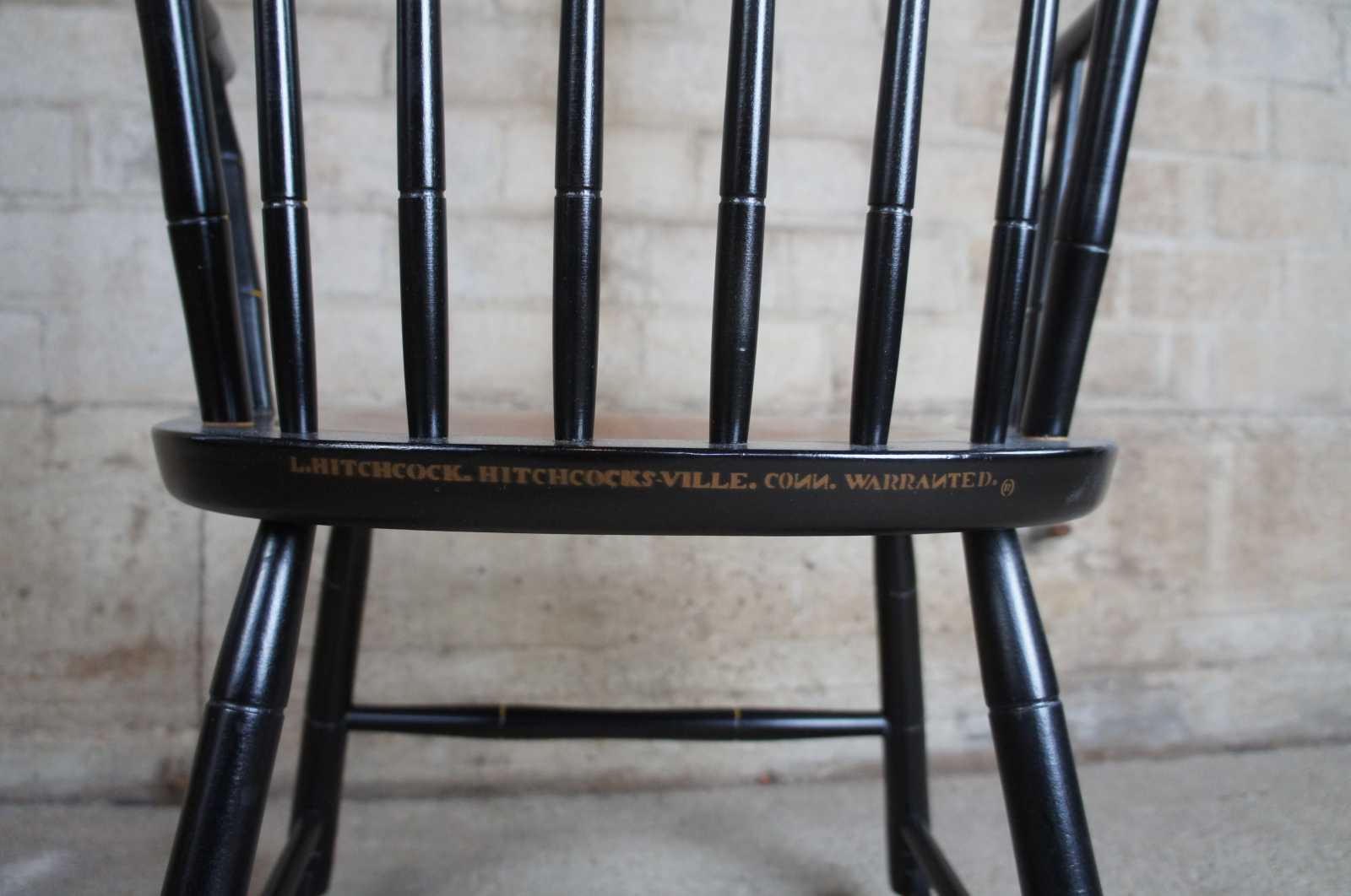 Vintage Hitchcock rocking chair or rocker. Features black ebonized and maple with stenciled slats. Made in Hitchcocksville Connecticut.