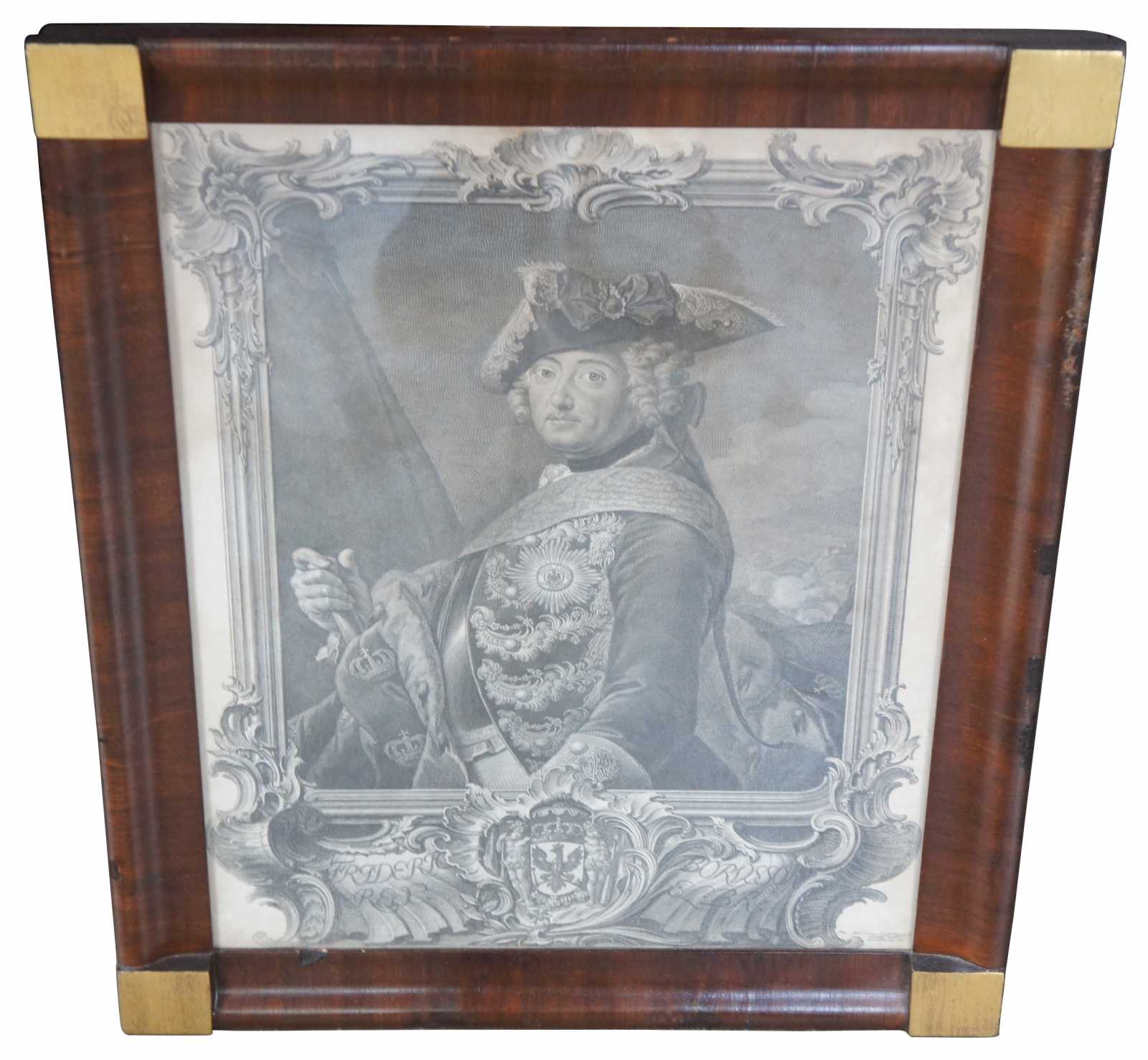 Antique mahogany framed engraving featuring a portrait of Frederick II, The Great (1712-86), engraved by Kilian, Phillip Andreas.