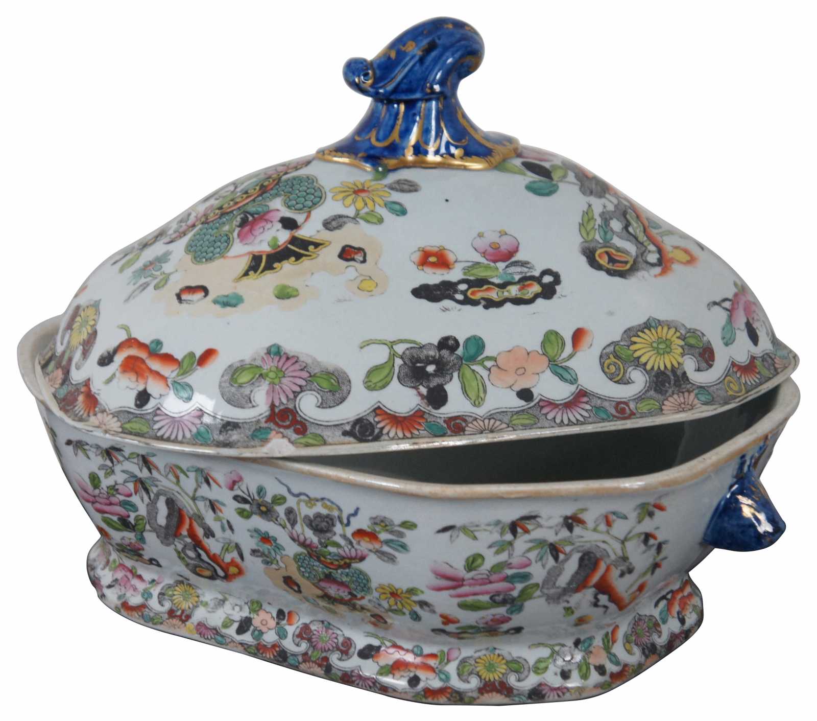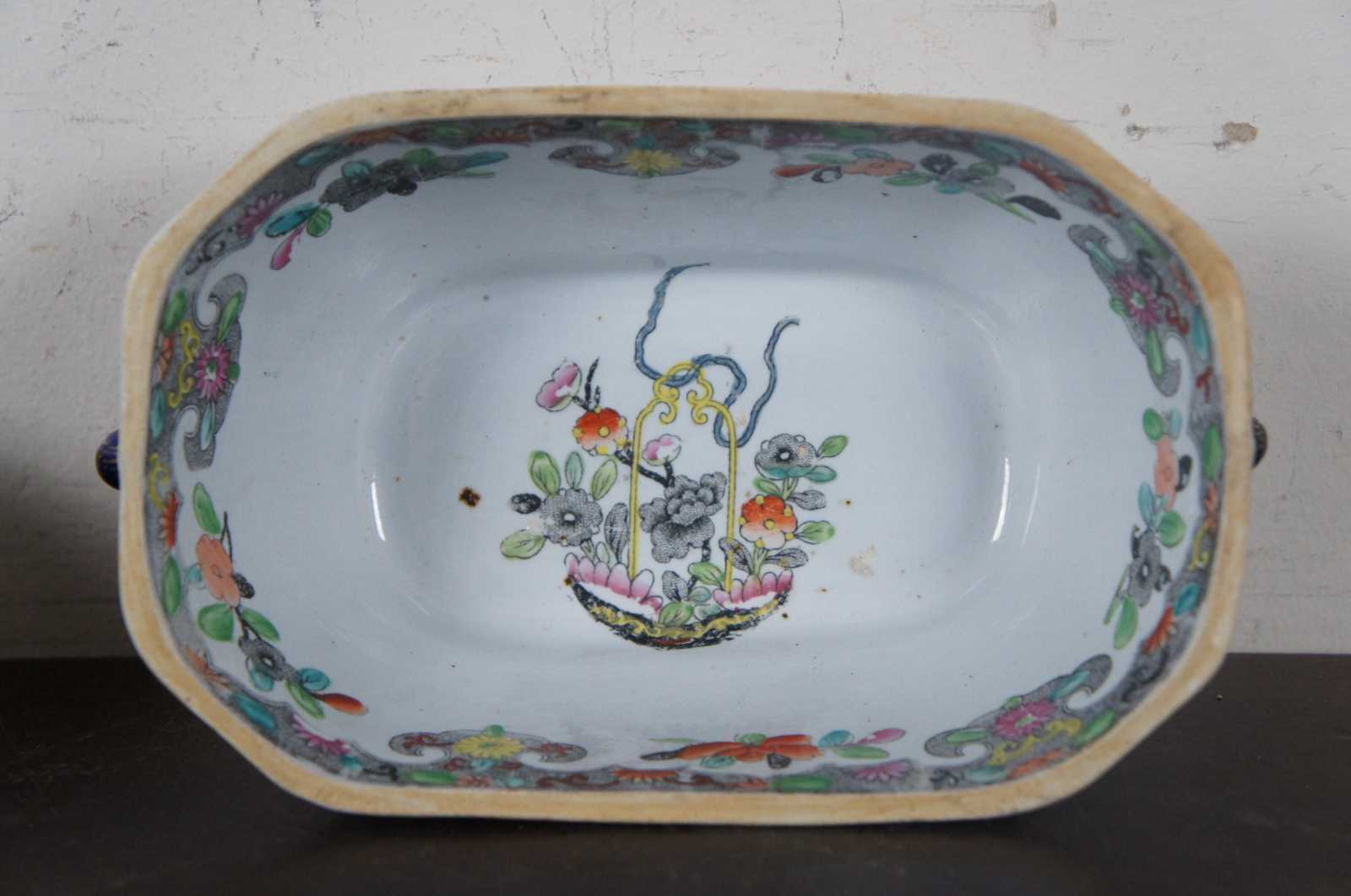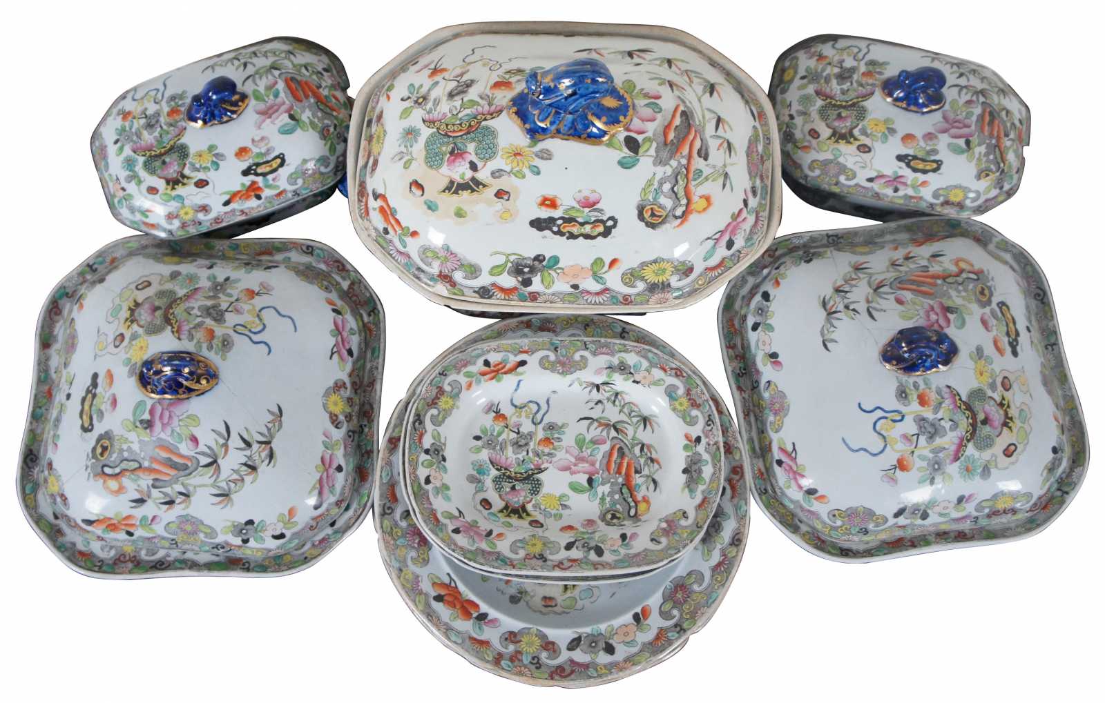 Each piece has a light grey-blue glaze and has been beautifully and carefully hand-painted in a chinoiserie pattern in bold colorful enamels over a transfer printed outline with a dark ochre outer rim.