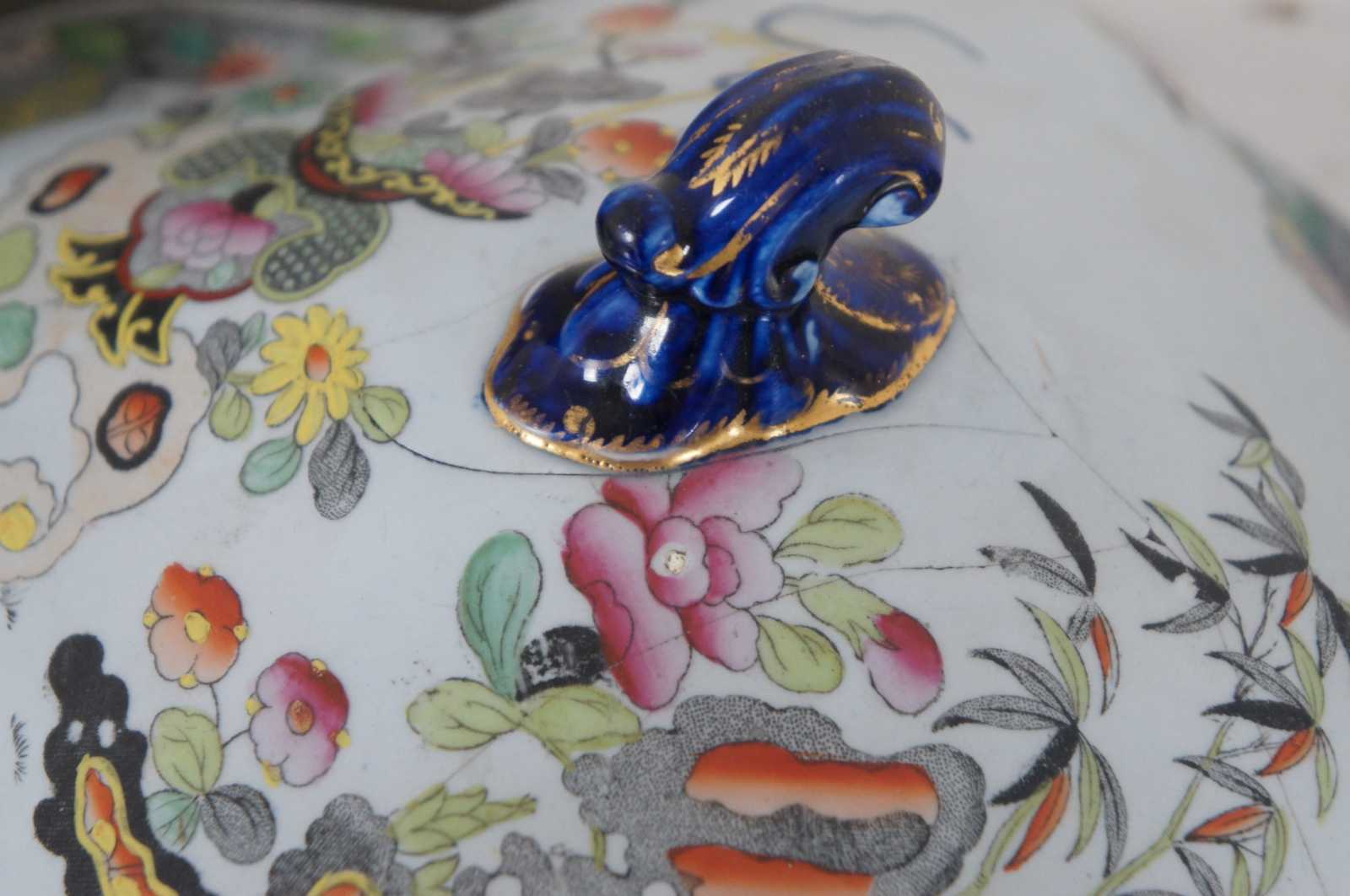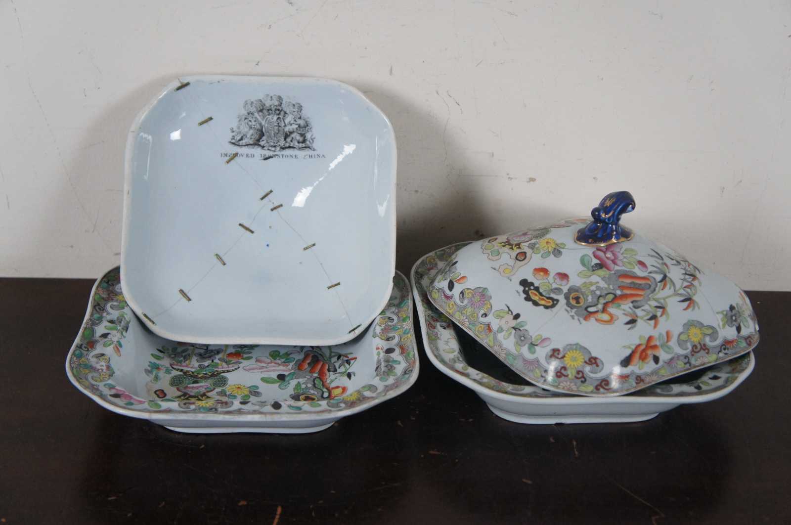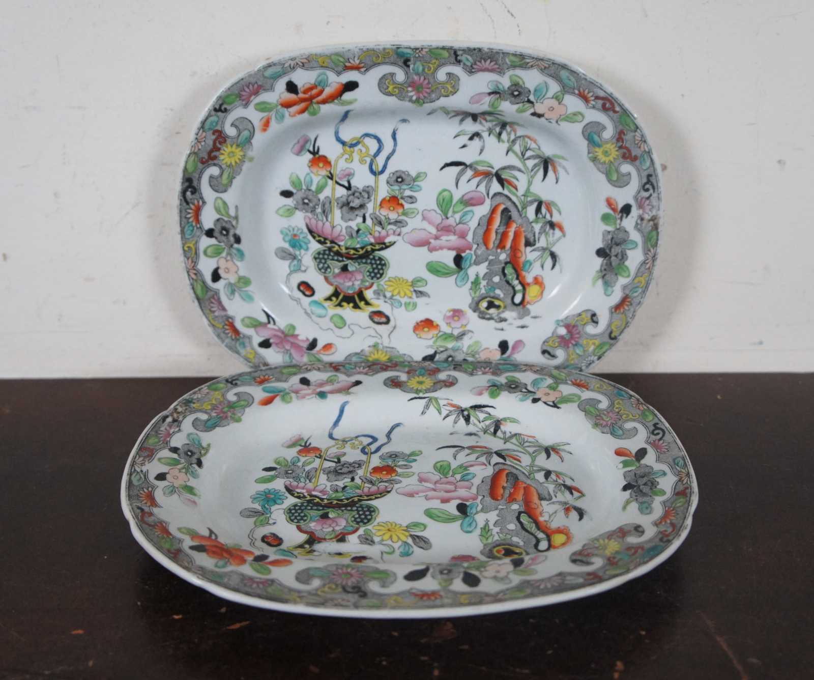 Each piece has a light grey-blue glaze and has been beautifully and carefully hand-painted in a chinoiserie pattern in bold colorful enamels over a transfer printed outline with a dark ochre outer rim.