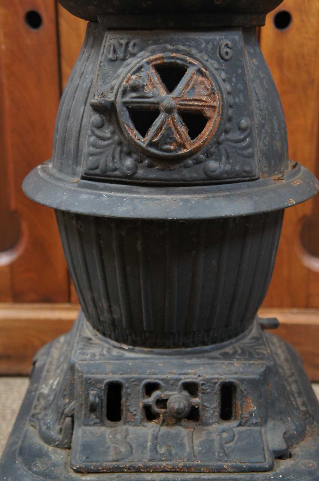 Small antique 19th century cast iron pot belly stove including flat iron and stove hook for the burner, sized for use in a railroad station or other small room. Marked slip on the lower plate, No 6.