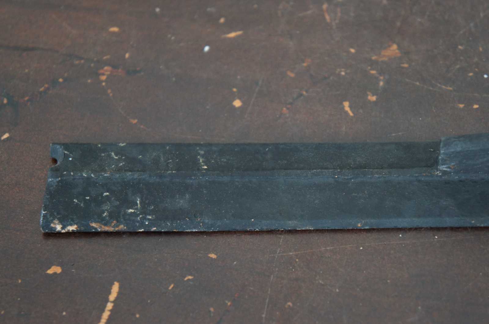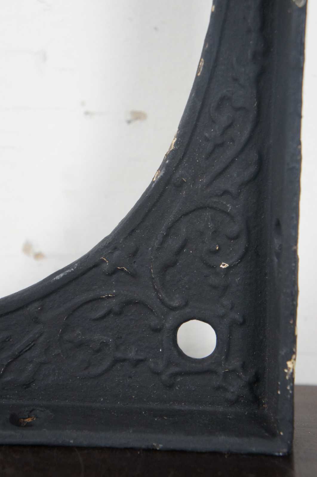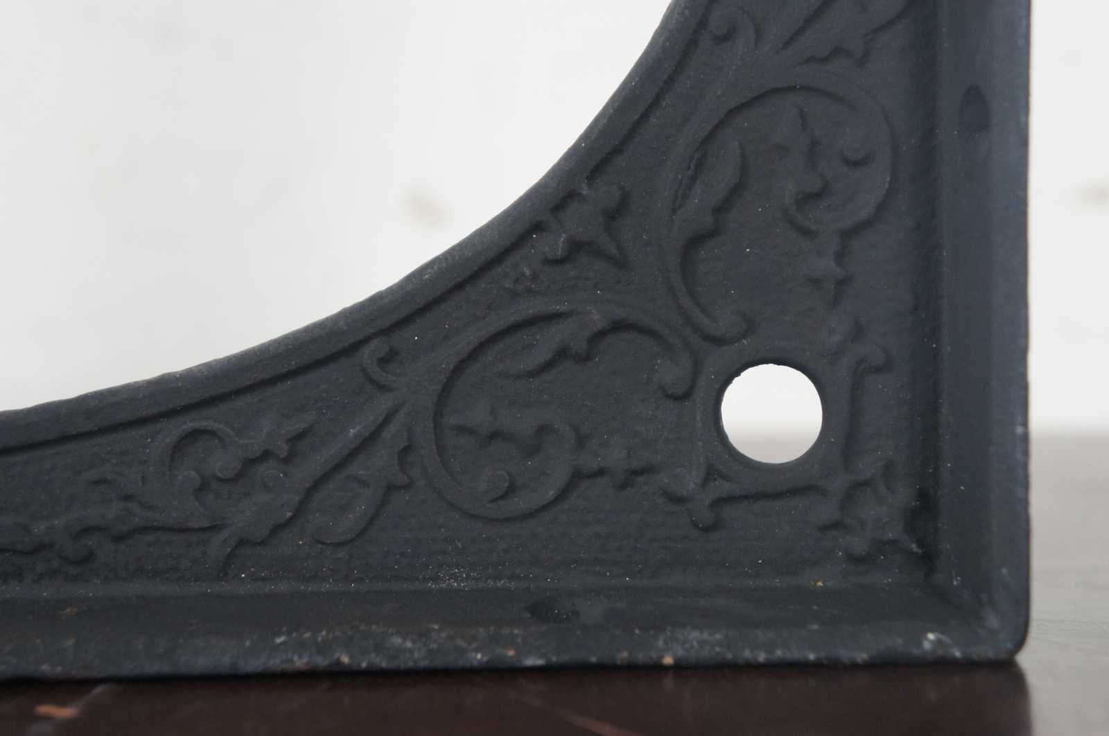 2 antique black painted cast iron right angle shelf brackets with low relief scrolling leaf accents.