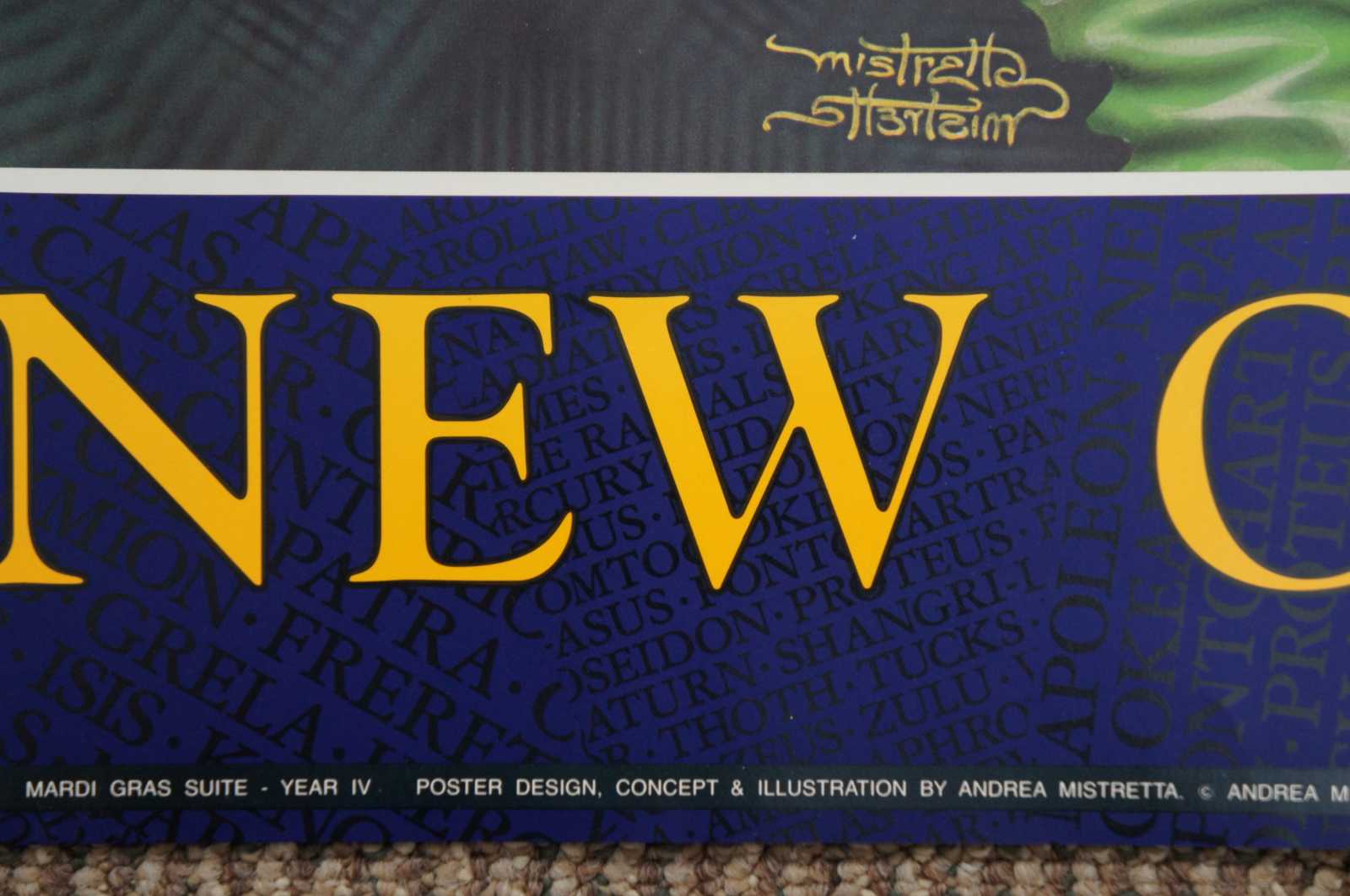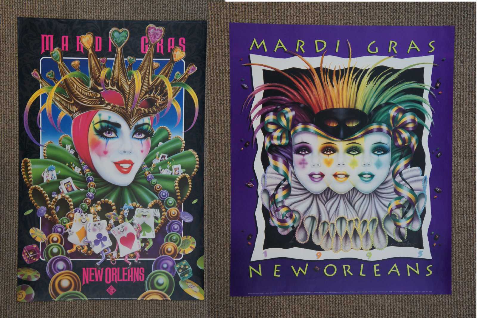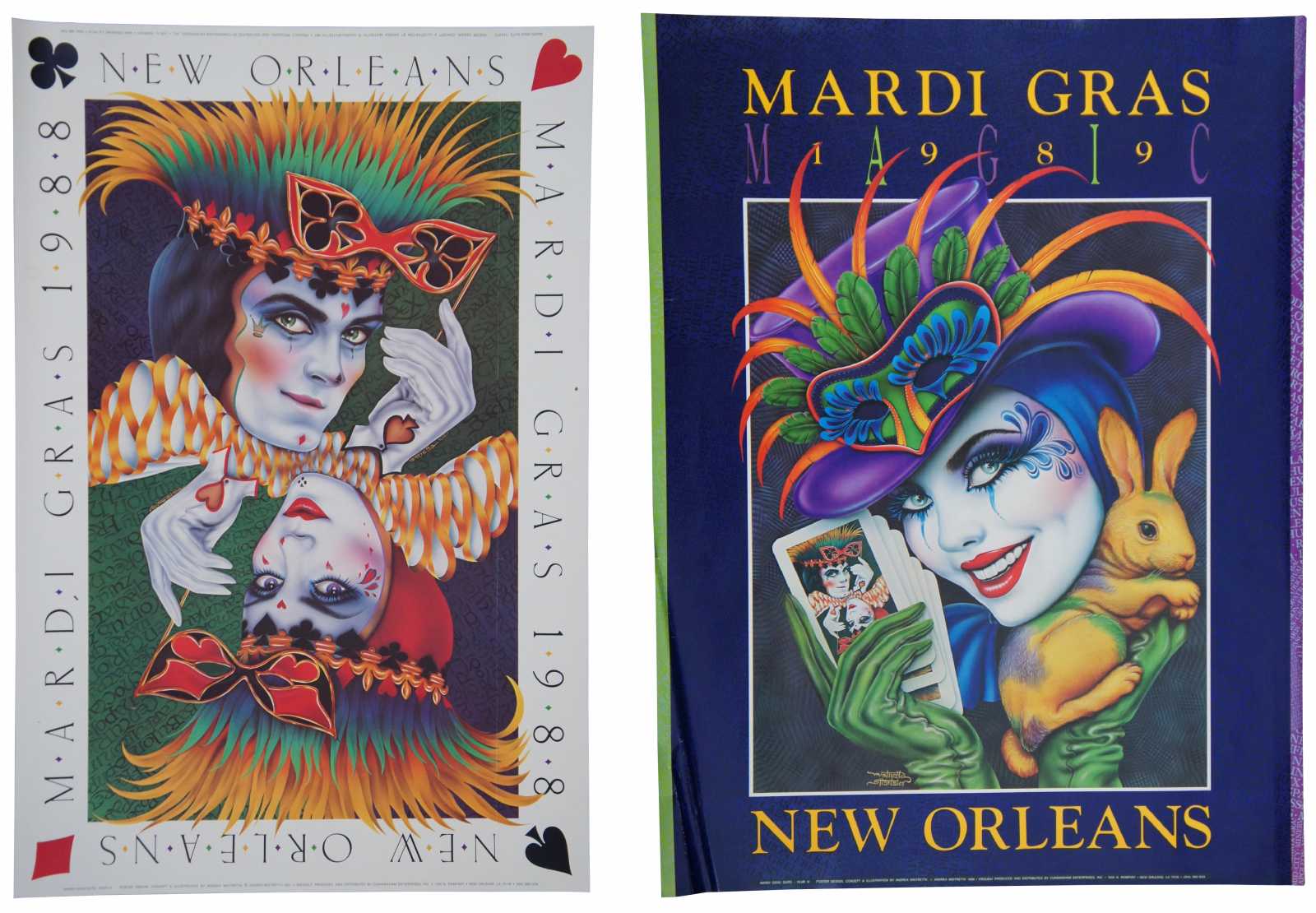 Lot of ten promotional posters for the annual Mardi gras celebration in New Orleans, spanning from 1988 to 1997, designed by Andrea Mistretta. Andrea Mistretta is a self-taught artist, illustrator, graphic designer and calligrapher. Drawing since age three, she worked with her parents in their small screen print shop during her teen years. A recipient of awards from Society of Illustrators, The Art Directors Club and the prestigious Vargas Award, she considers New Orleans citizenship bestowed by Mayor Bartholemy a very special honor. An activist for the protection artists’ rights, Andrea also works vigorously as an environmental activist and founder of Friends of White’s Pond where her studio is located.