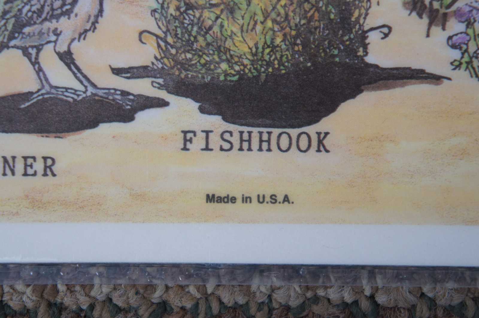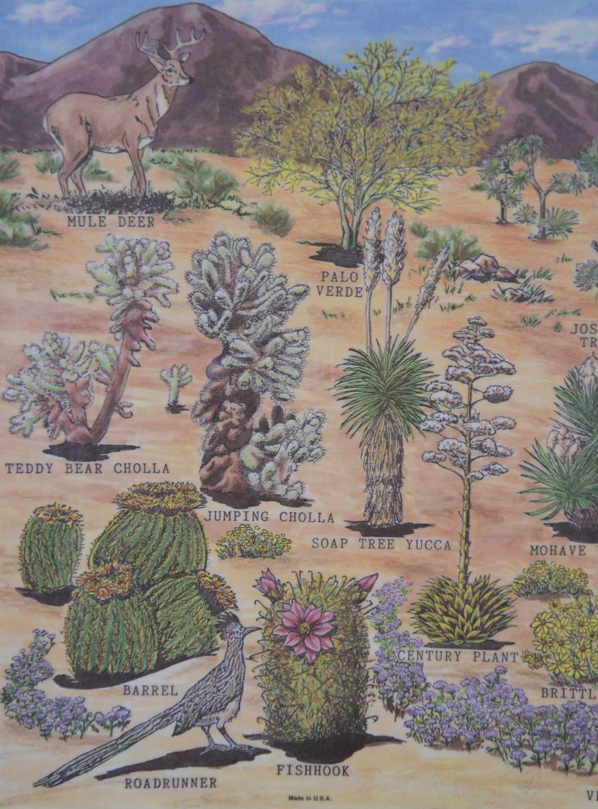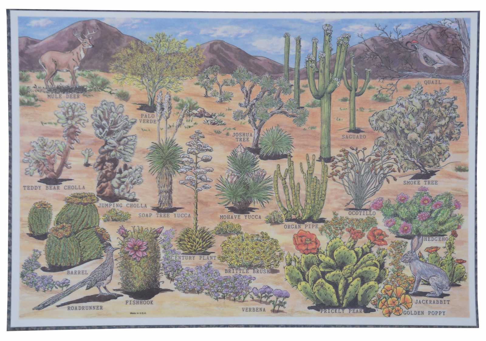 Double sided laminated print featuring a landscape photograph by Ray Manley on one side titled “Saguaro Sunset” distributed by Smith-Southwestern, Inc, and on the reverse an illustrated tableau of common desert plants and animals.
