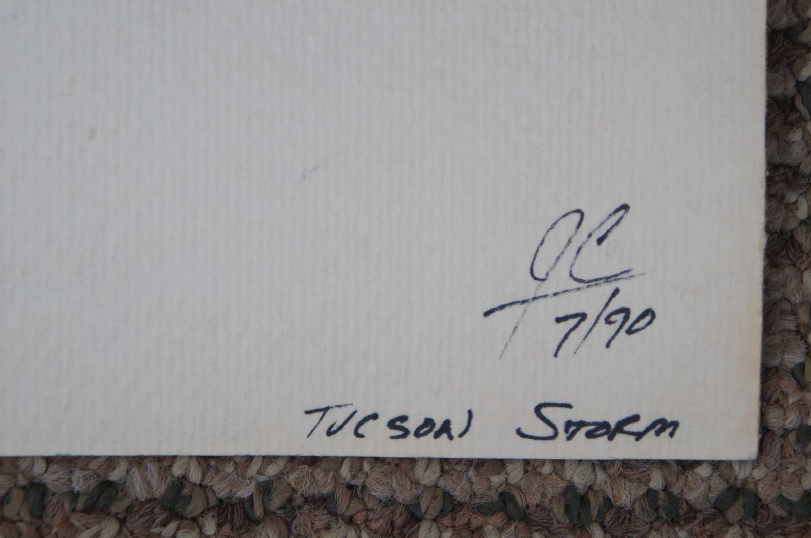 Vintage 1990 watercolor landscape painting titled “Tucson Storm,” featuring cactus scattered mountains at sunset with a thunderstorm rolling in. Initialed by the artist on the reverse.
