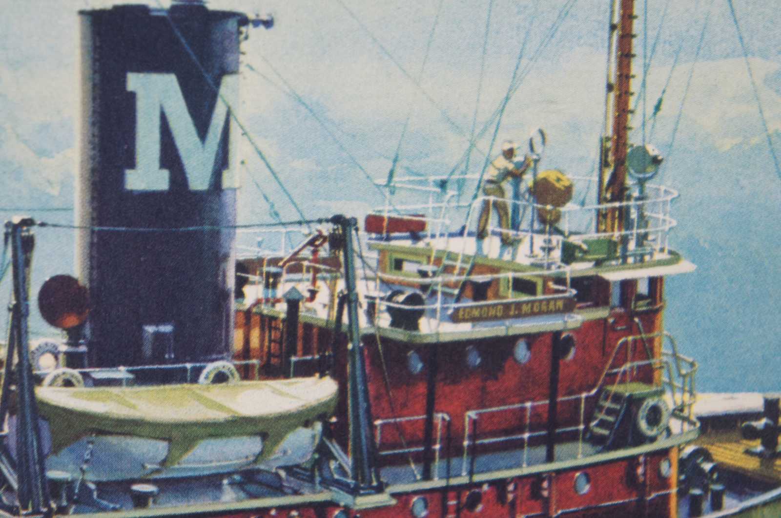 Vintage lithograph print of the Edmond J. Moran tug boat by Carl G. Evers. Carl Evers is a contemporary painter of maritime subjects, mostly in watercolor of tugs, freighters, liners, naval ships and ships in coastal waters. He was born in Dortmund, Germany and studied at the Slade School in London and in Sweden, before emigrating to the United States in 1947.