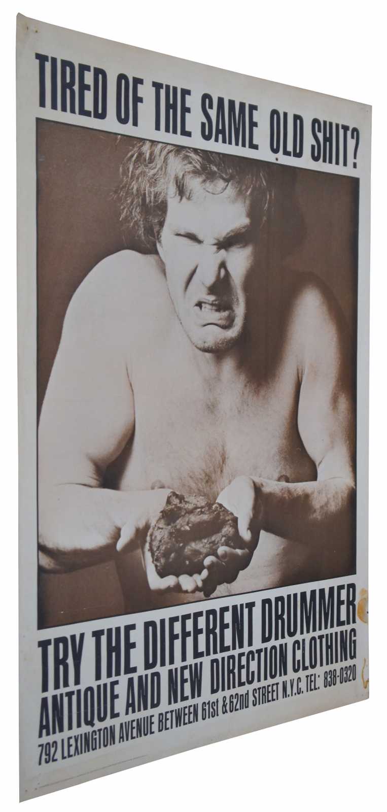 Vintage 1968 poster for The Different Drummer: Antique and New Direction Clothing of New York City, designed by J.C. Suares, photo by Bill English. Features a naked man holding a lump of feces under the words “Tired of the same old shit? Try the Different Drummer – Antique and new direction clothing.”
