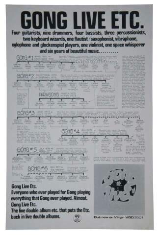 Gong are a progressive rock band that incorporates elements of jazz and space rock into their musical style. The group was formed in Paris in 1967 by Australian musician Daevid Allen and English vocalist Gilli Smyth. Gong Live Etc. is a live album by Gong, recorded between 1973 and 1975 and originally released in 1977. It is a set of live recordings, studio out-takes and BBC session recordings spanning the years 1973 to 1975. VGD3501