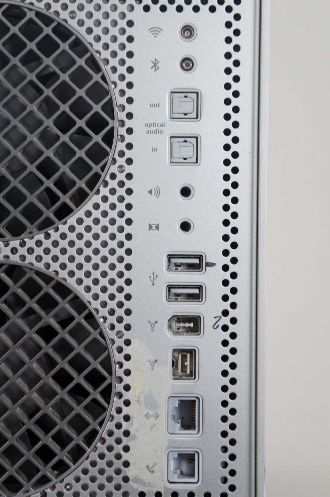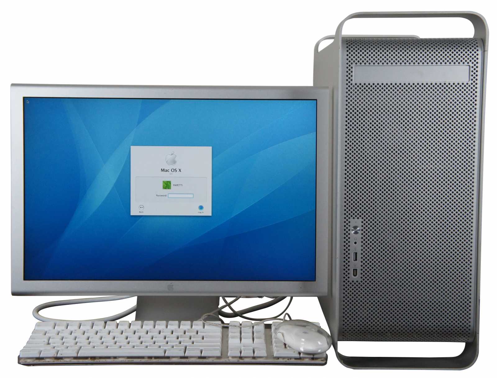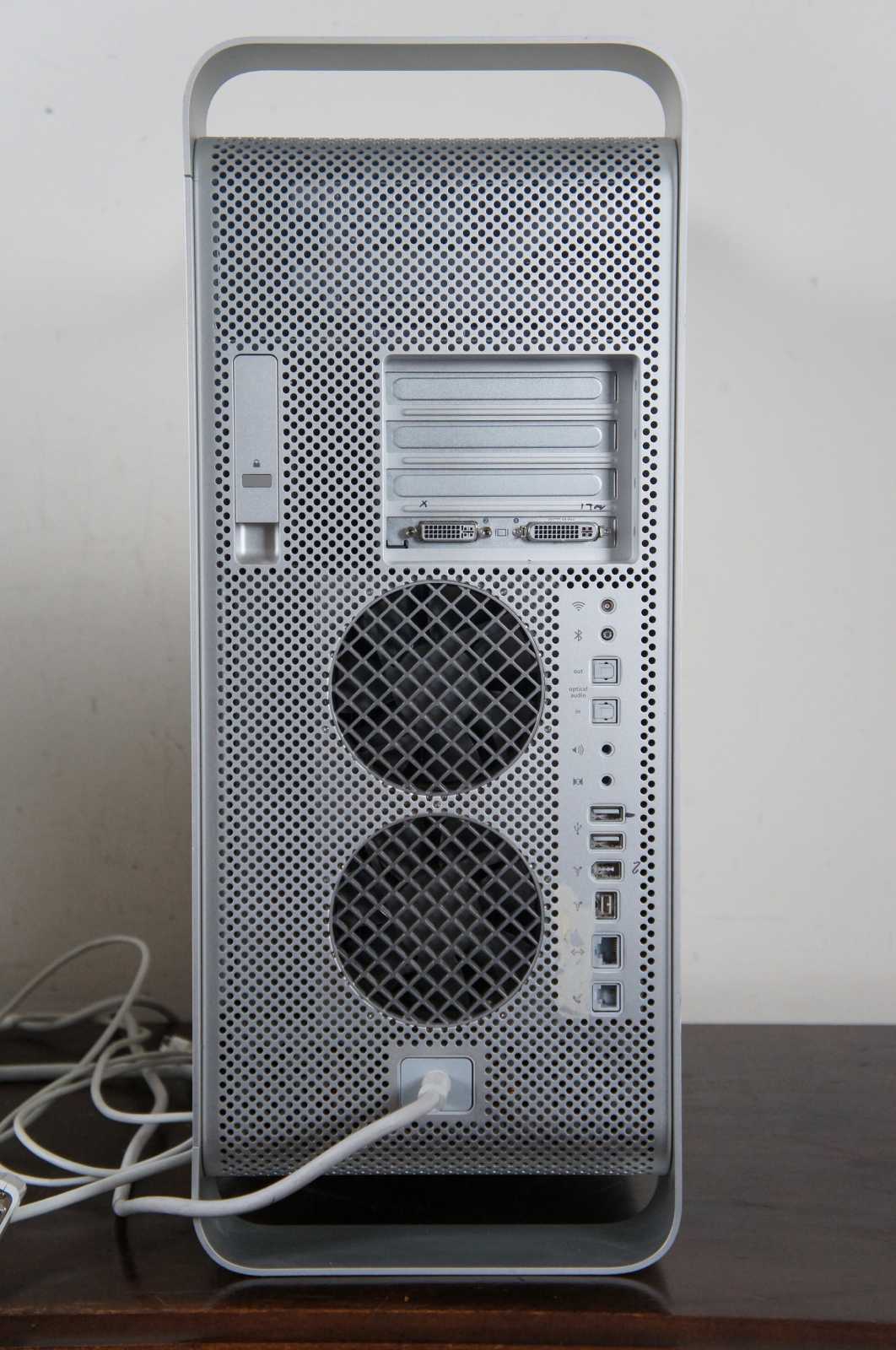 Apple Power Mac G5, model no: A1047 desktop computer, two Cinema Display 20” monitors, wired USB keyboard and USB optical mouse. Circa early 21st century.