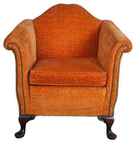 Early 20th century Queen Anne style arm chair. Made from Mahogany a camelback, flared arms and nail head trim. The chair is supported by cabriole legs with a slipper foot in the front and saber legs along the back.