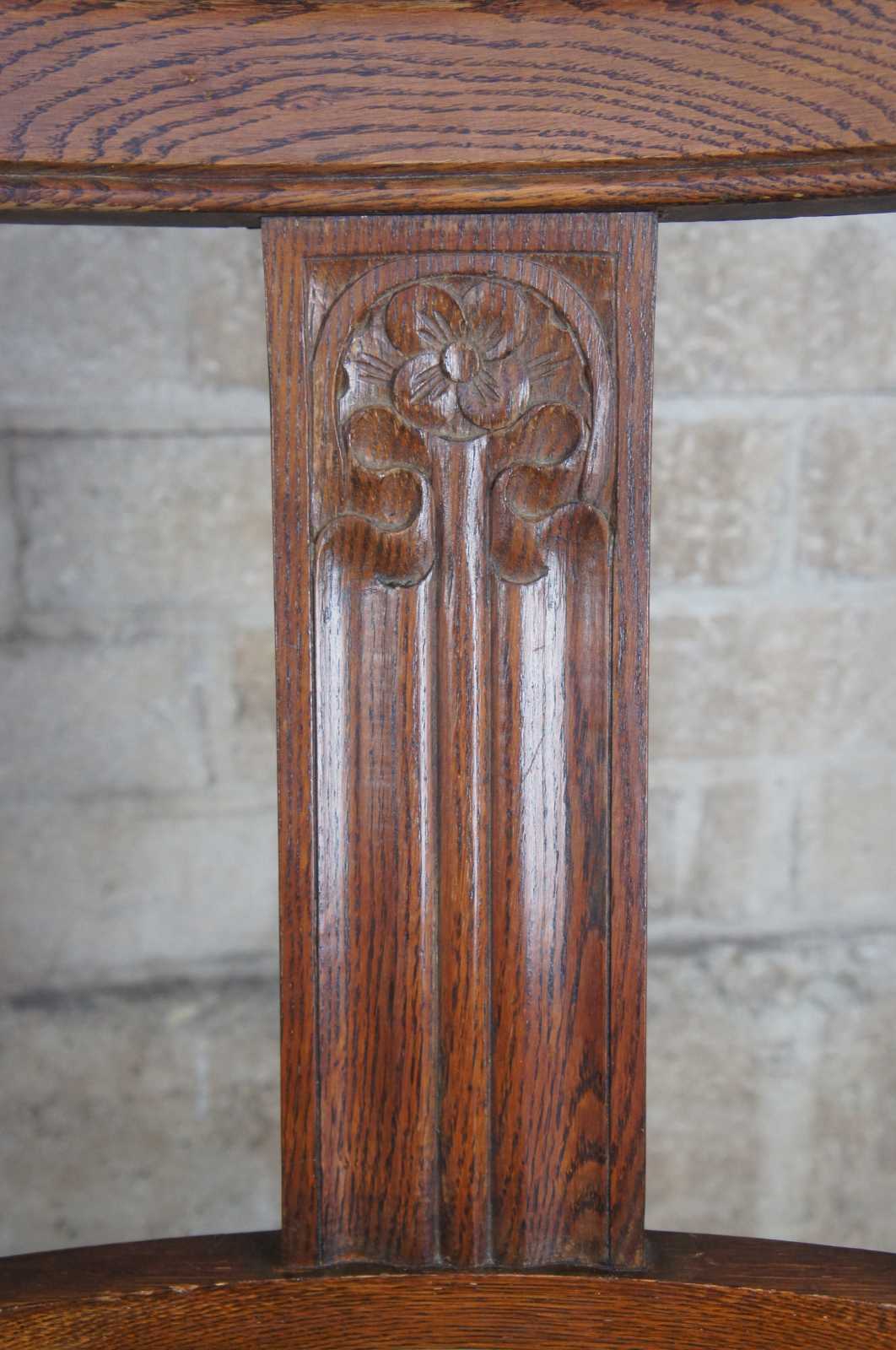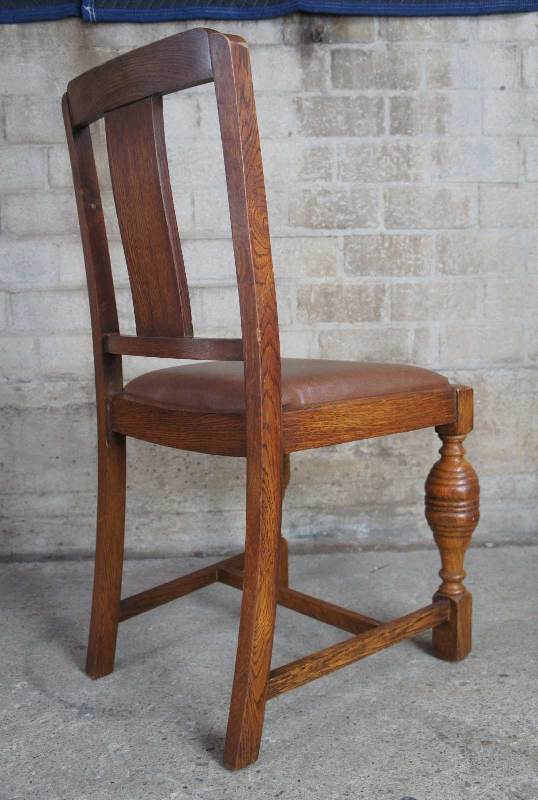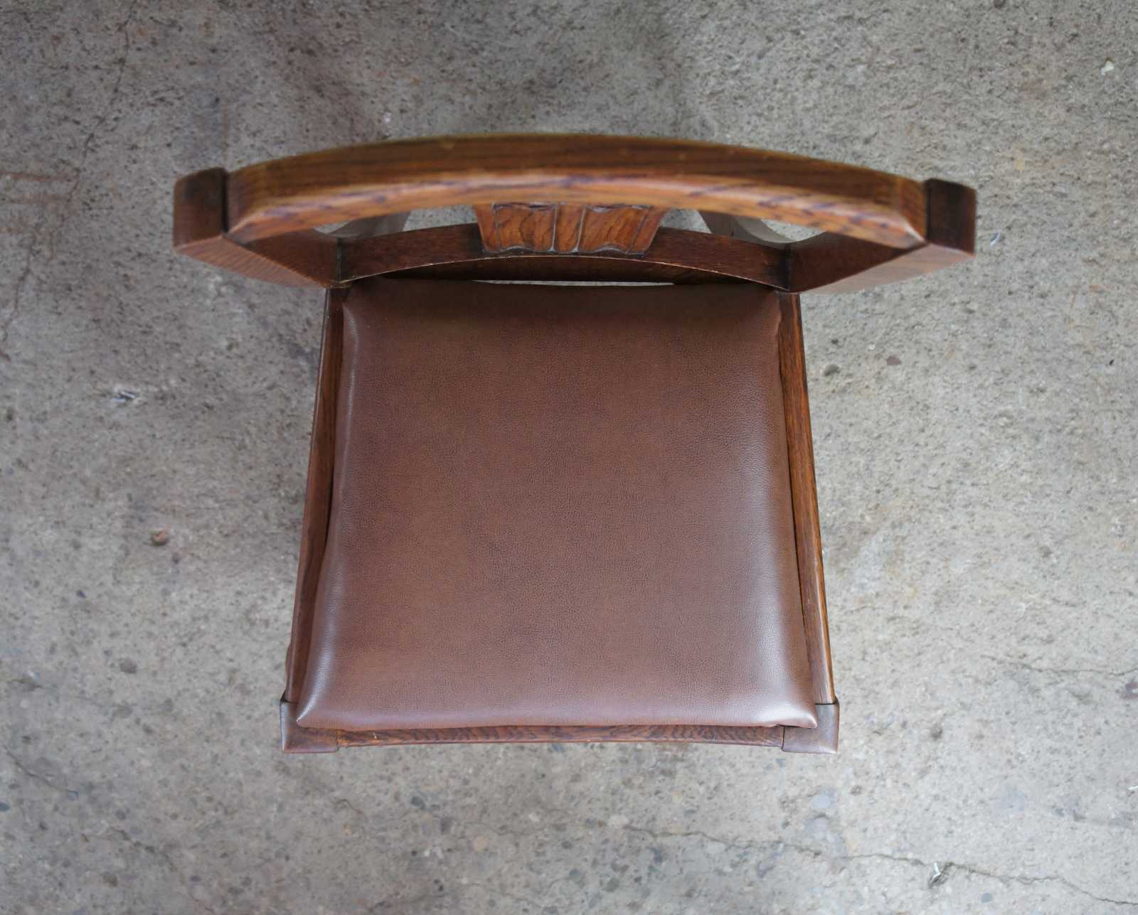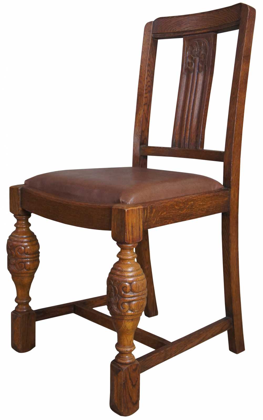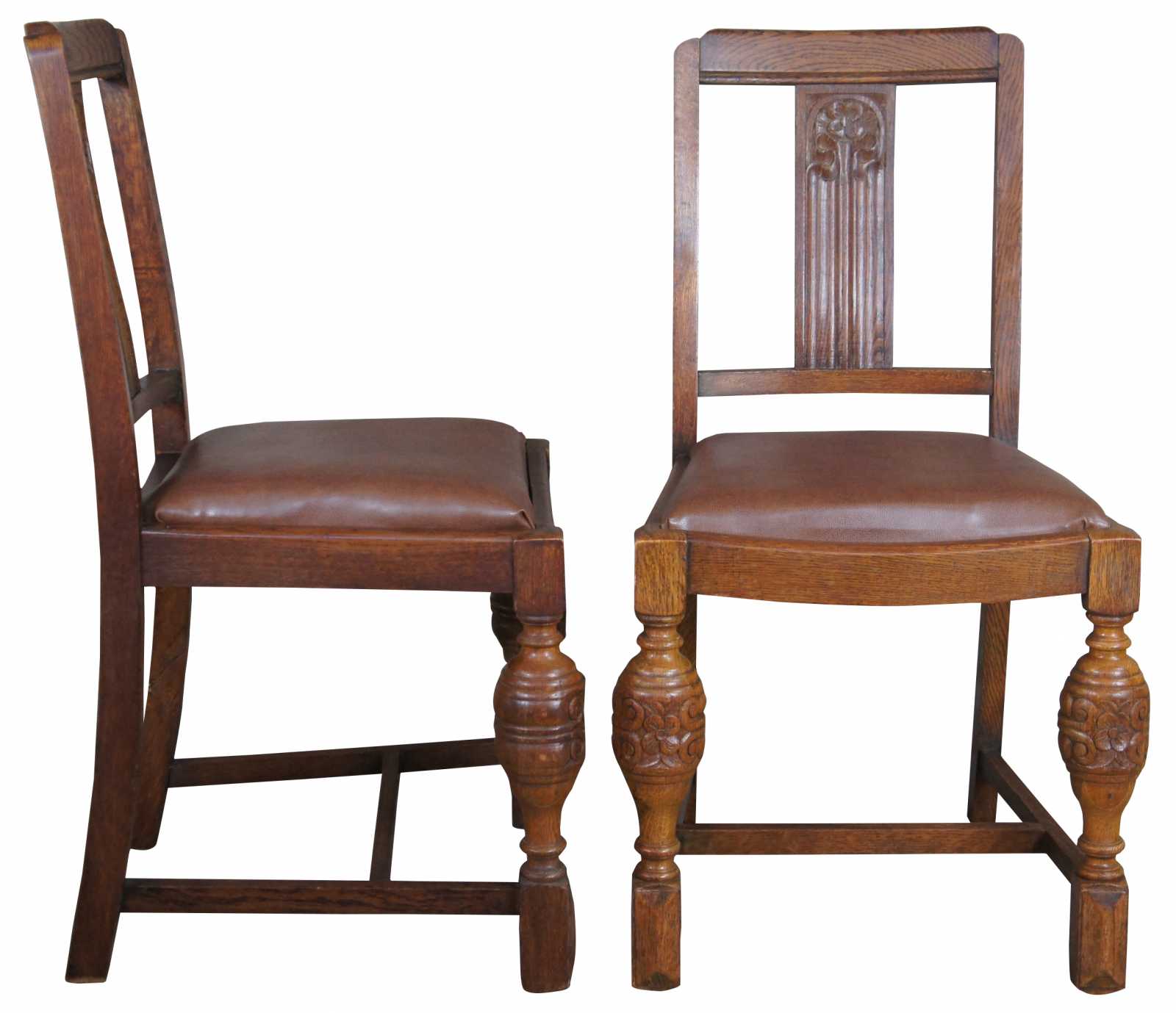 A lovely pair of 1930s Elizabethan revival dining side chairs by Jacob Summers & Sons. Part of their Hillcrest Suite as seen on page 18 of their catalog. Made from oak with a flower carved back, leather saddle seat and robust baluster shaped from legs. The company was founded by Jacob Summers in the 1880s and at the time these chairs were made, their factory was located in Tottenham, North London in the UK. Upholstered in leather made in British India. The British Raj was under rule by the British Crown in India from 1858 to 1947.