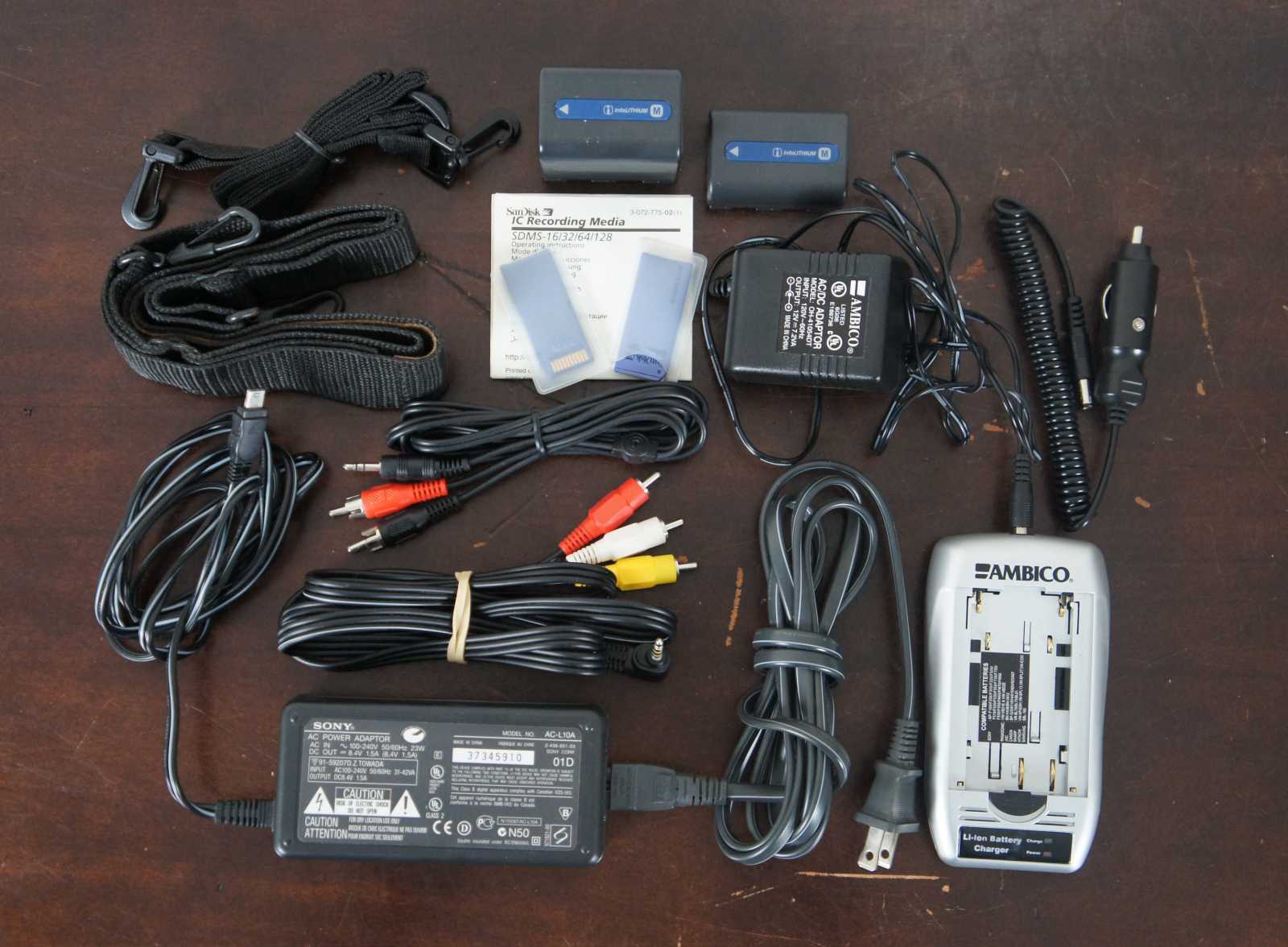 Sony Mini Handycam Digital Video Camera Recorder DCR-TRV17, Lens Cap & Manual; Tamrac camera bag & strap; Ambico Lithium Ion battery pack charger with power cord and car outlet adapter; Sony Lithium Ion Battery packs - NP-FM70 & NP-FM30; Audio/Video connecting cables; San Disc Memory Sticks - 64MB & 4MB; AC-L10A Power Adapter/Power Cord; 9 Digital cassette tapes. In working condition.