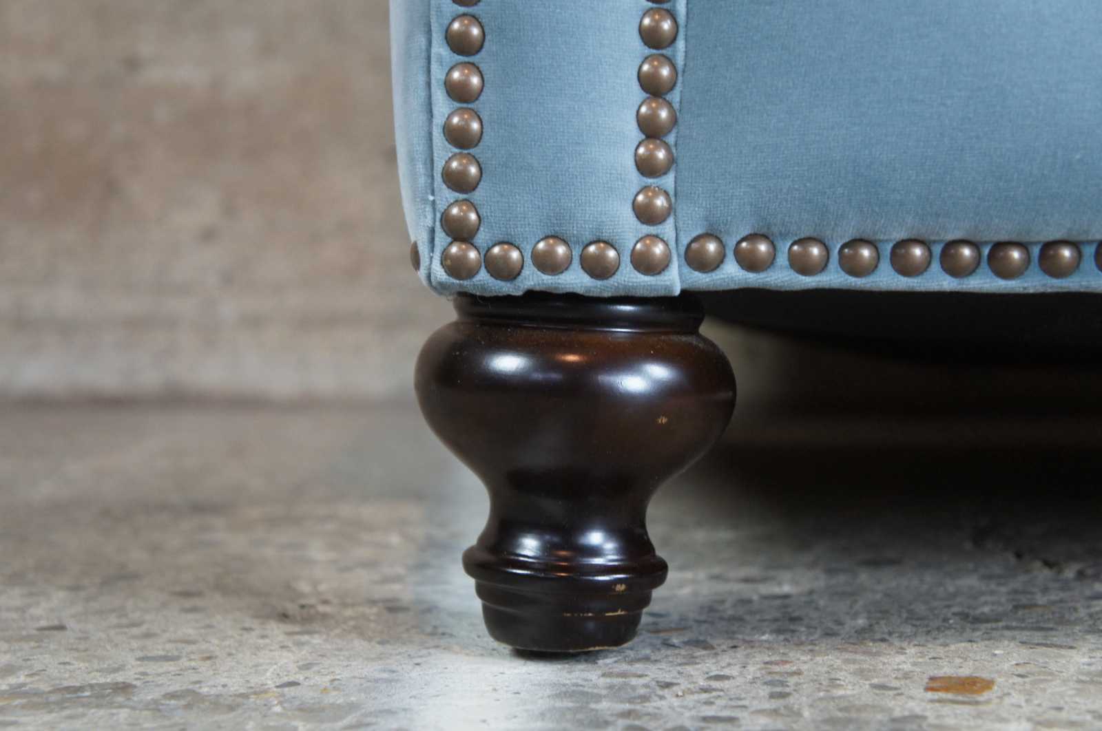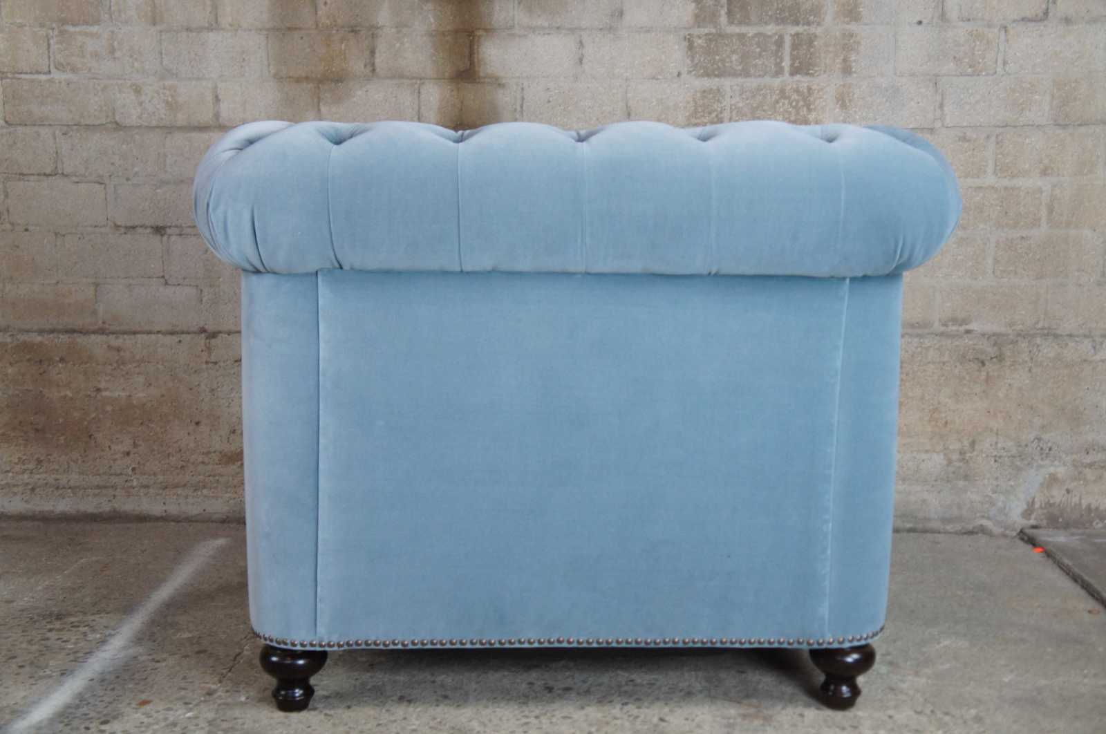 Dating back to the 18th century, the chesterfield was once the mark of class and stature. Today, it's symbolic of great style. Inspired by this iconic British design. The Small Barrow Chair byu Frontgate features a button-tufted back with a low, cushioned seat; rolled arms; hand-applied, brass nailhead trim; and the characteristic equal-height arms and back.