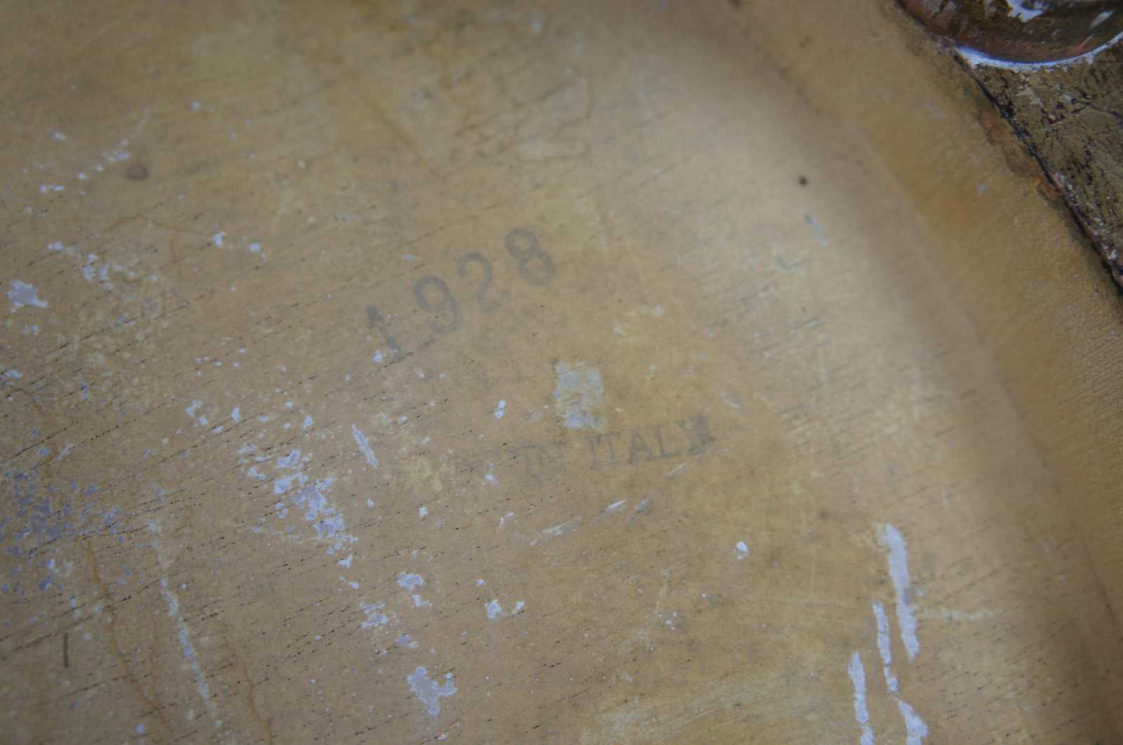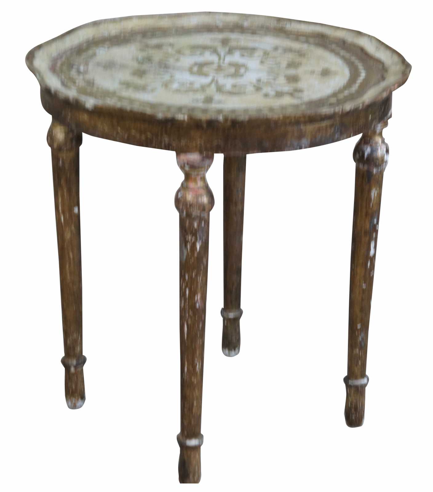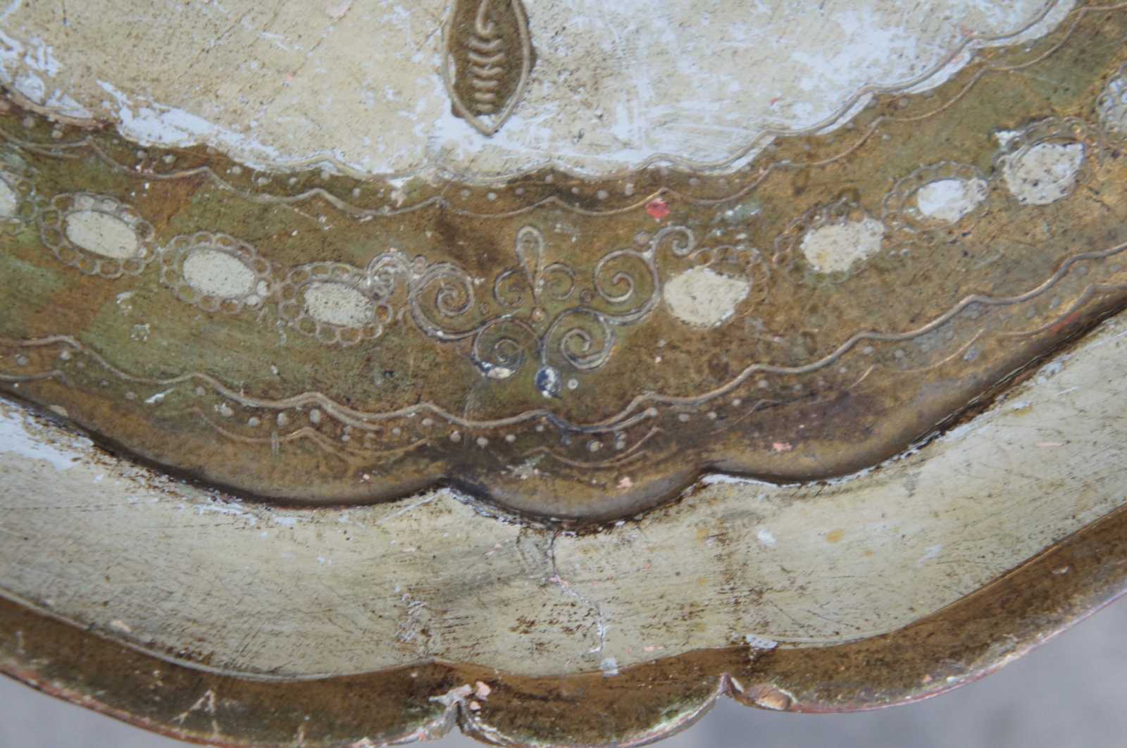 Circa 1928 antique Italian florentine toleware table. Features a scalloped top with fleur de lis design over four tapered legs.