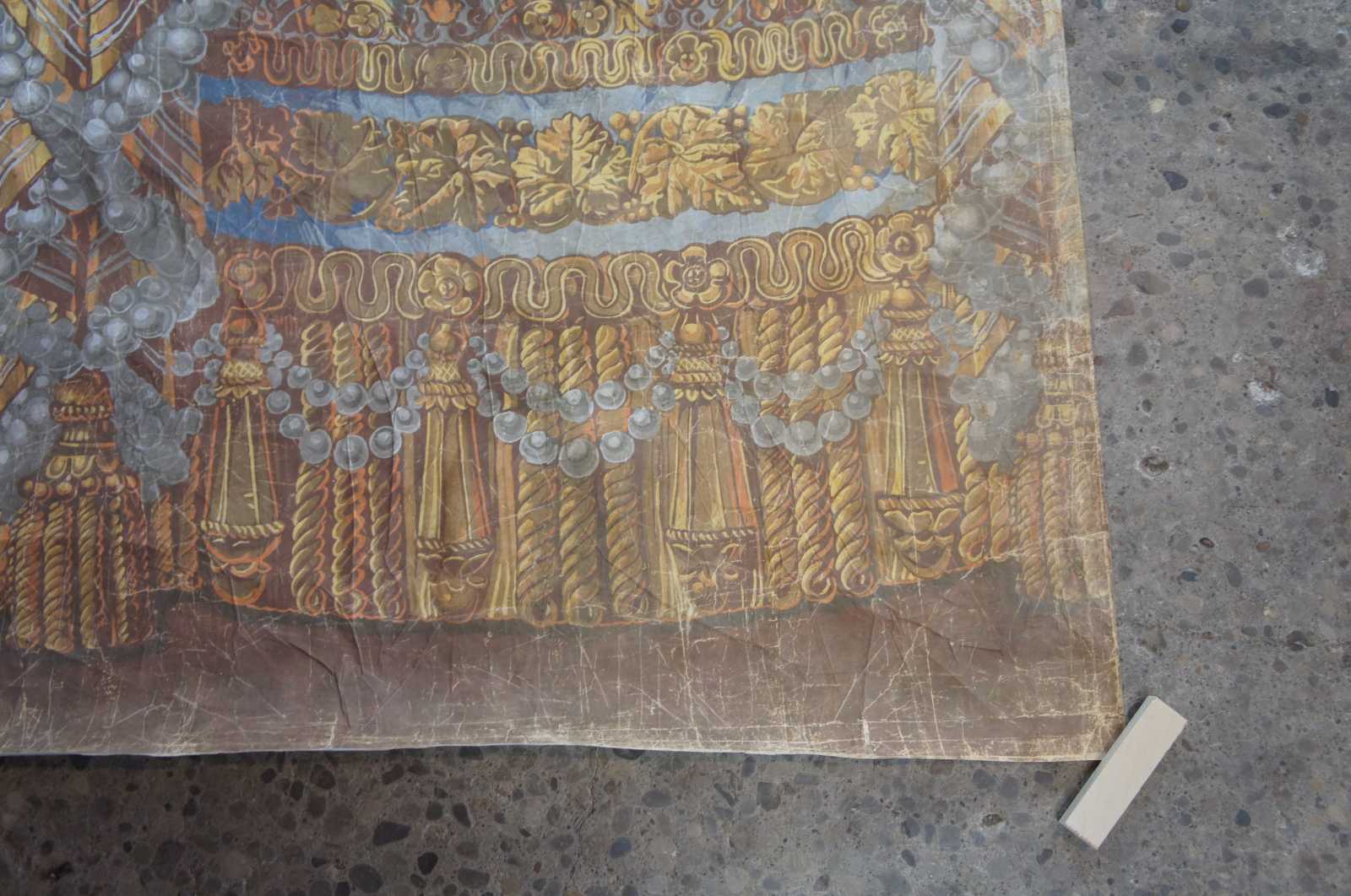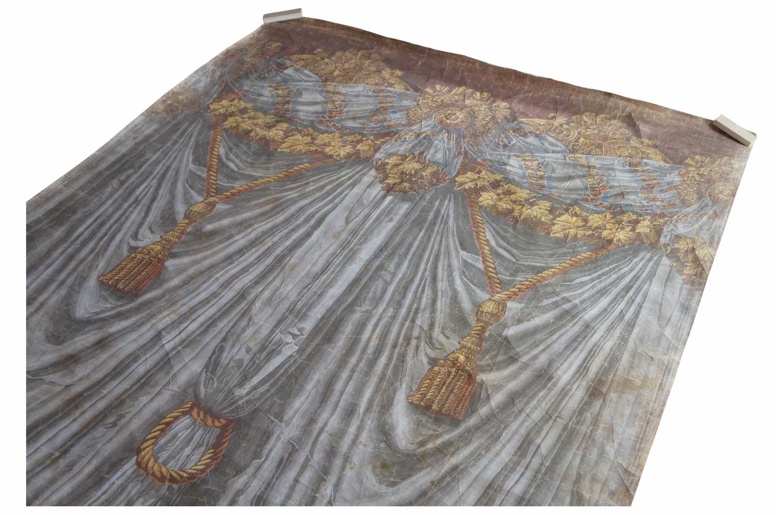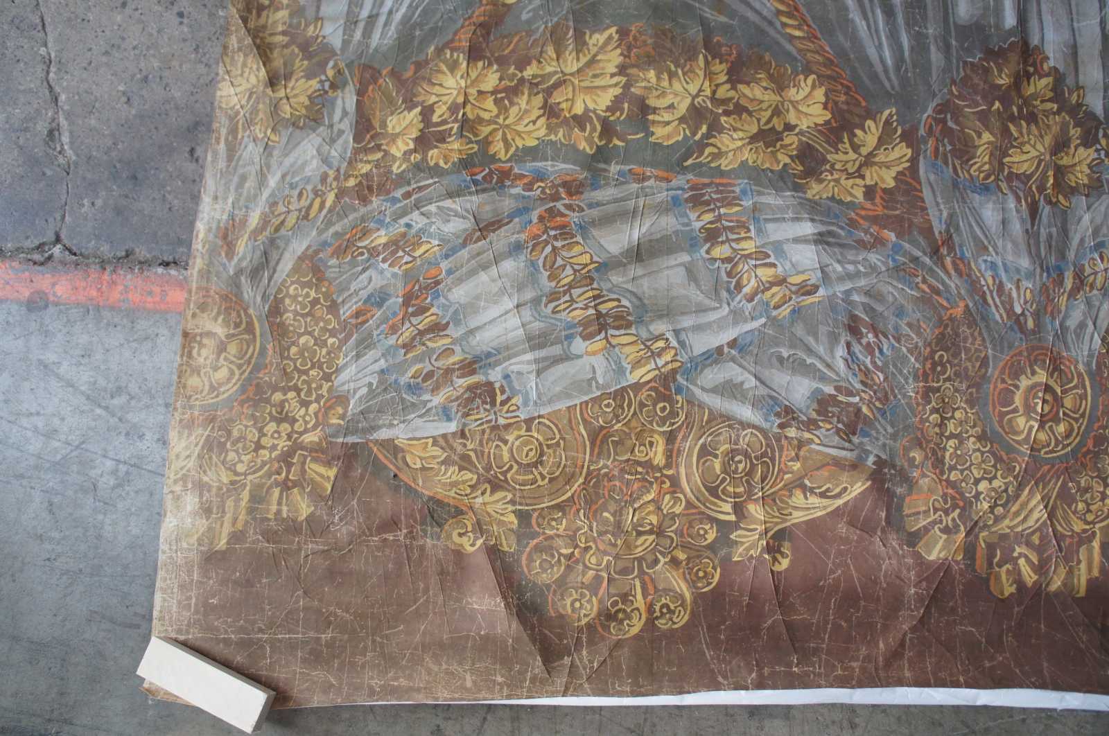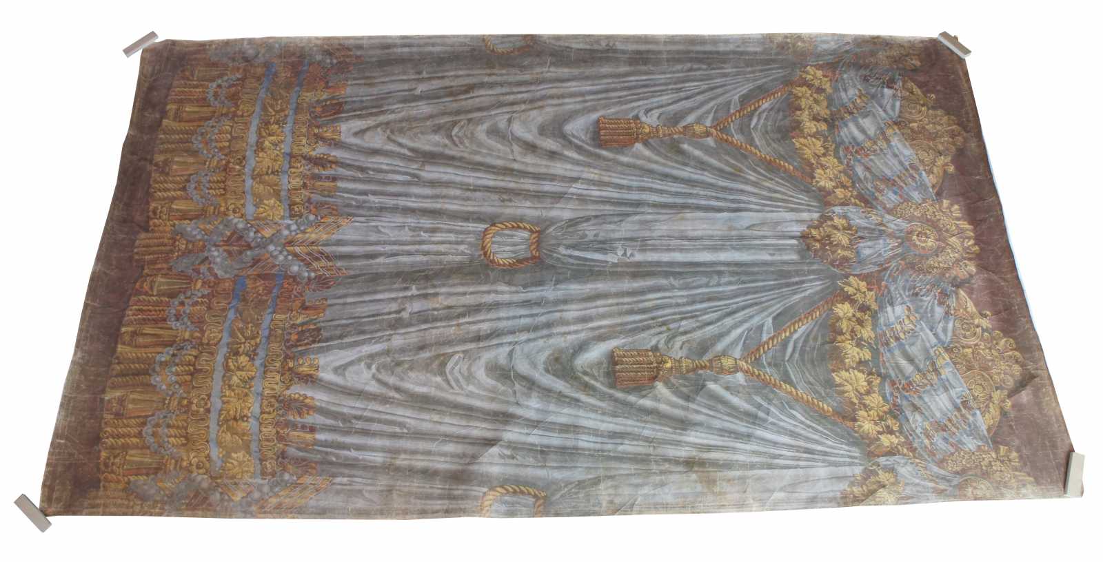 Vintage European Art Print. Resemblesa baroque or French theater curtains. Gray and gold with distressing.