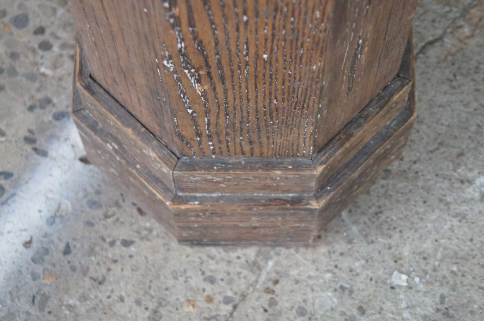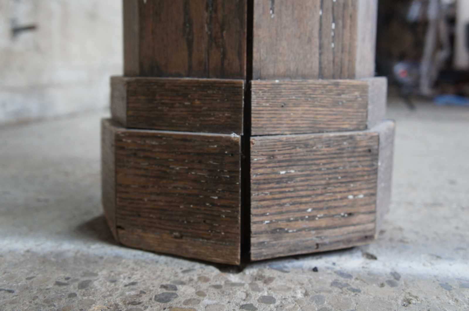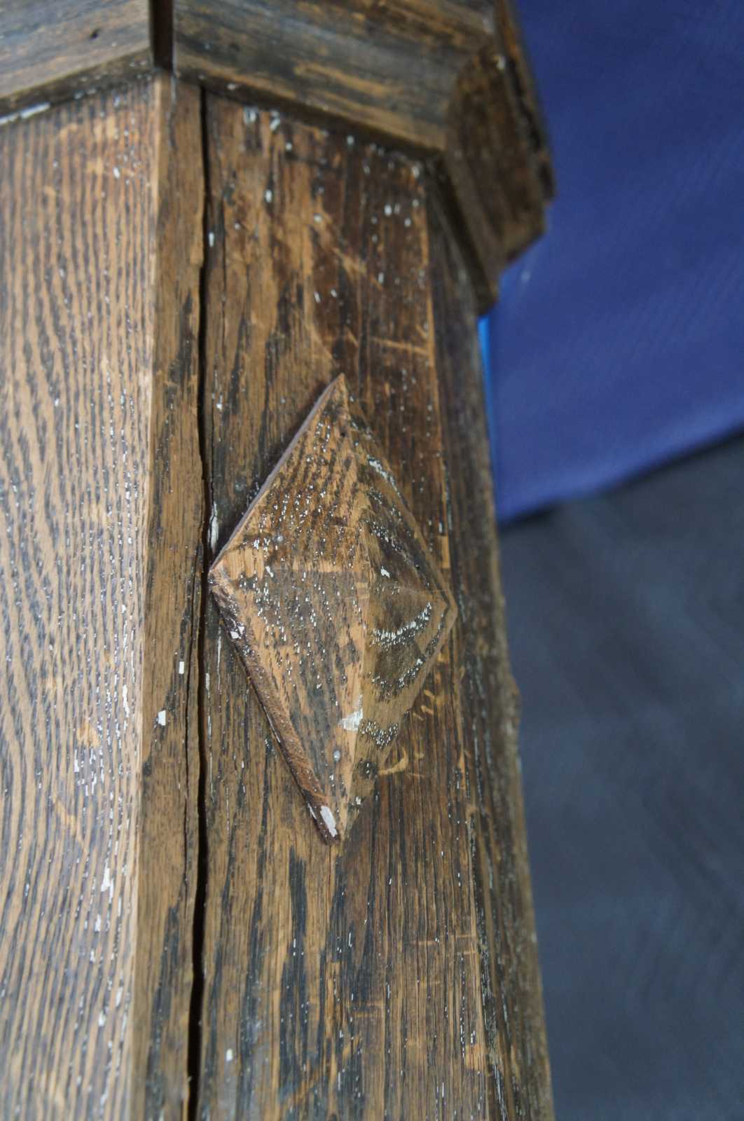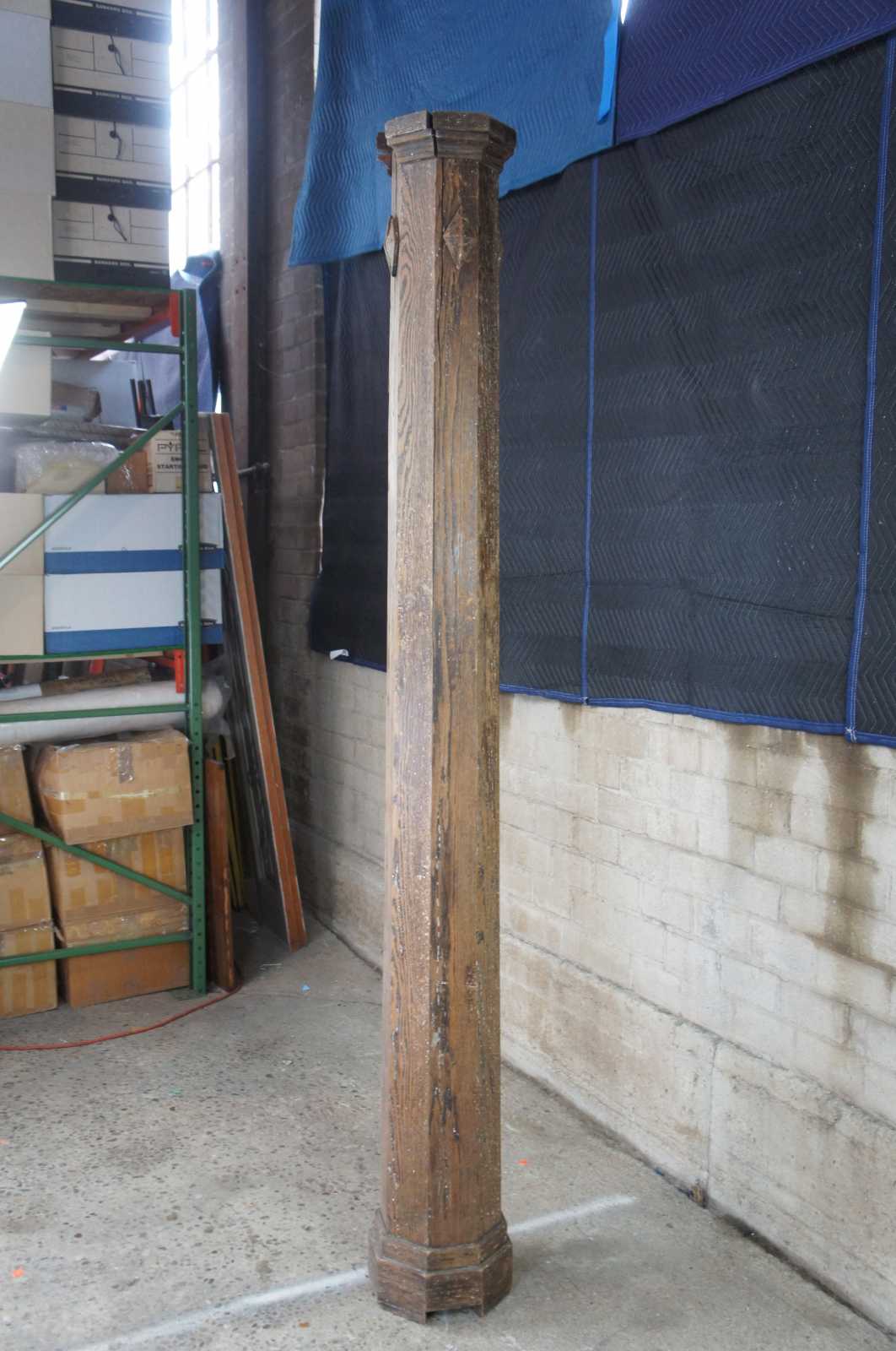 20th century relaimed architectural column or pillar. Made of oak, featuring eight sides with a slight taper from bottom to top and accented with diamond embellishment carvings.