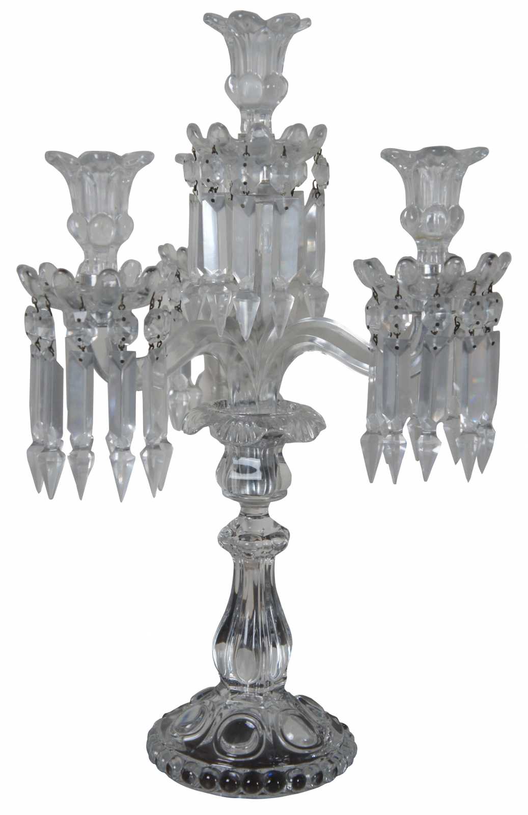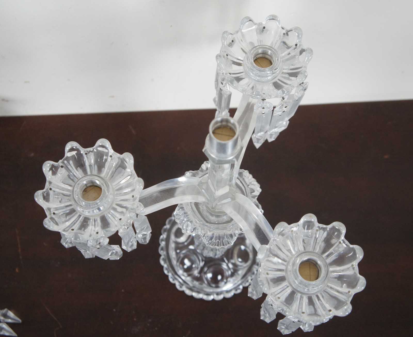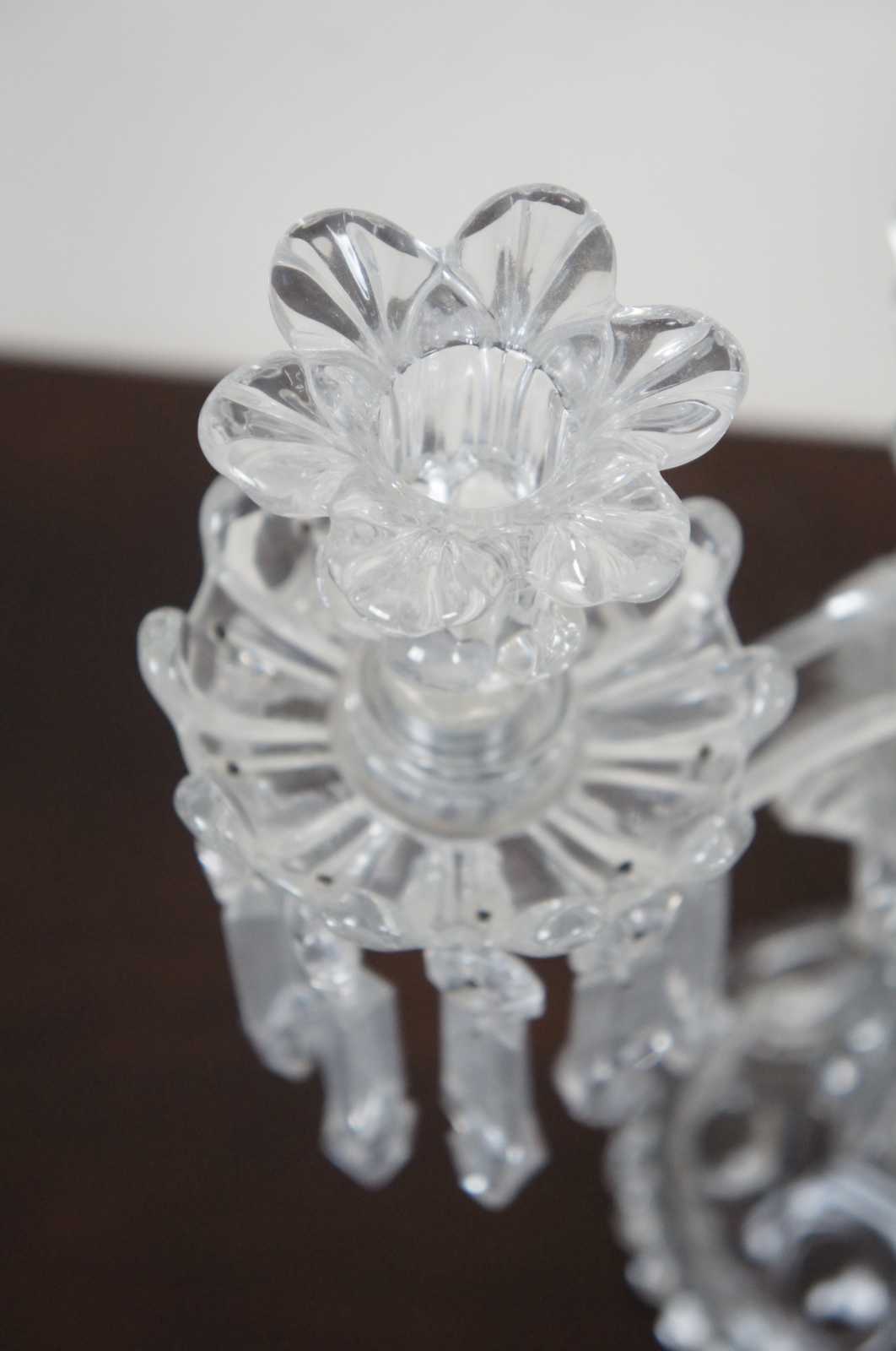 Pair of elegant Baccarat cut crystal candelabras with four flower shaped bobeches / candle holders surrounded by drop crystals / prisms. Marked on base. Made in France.