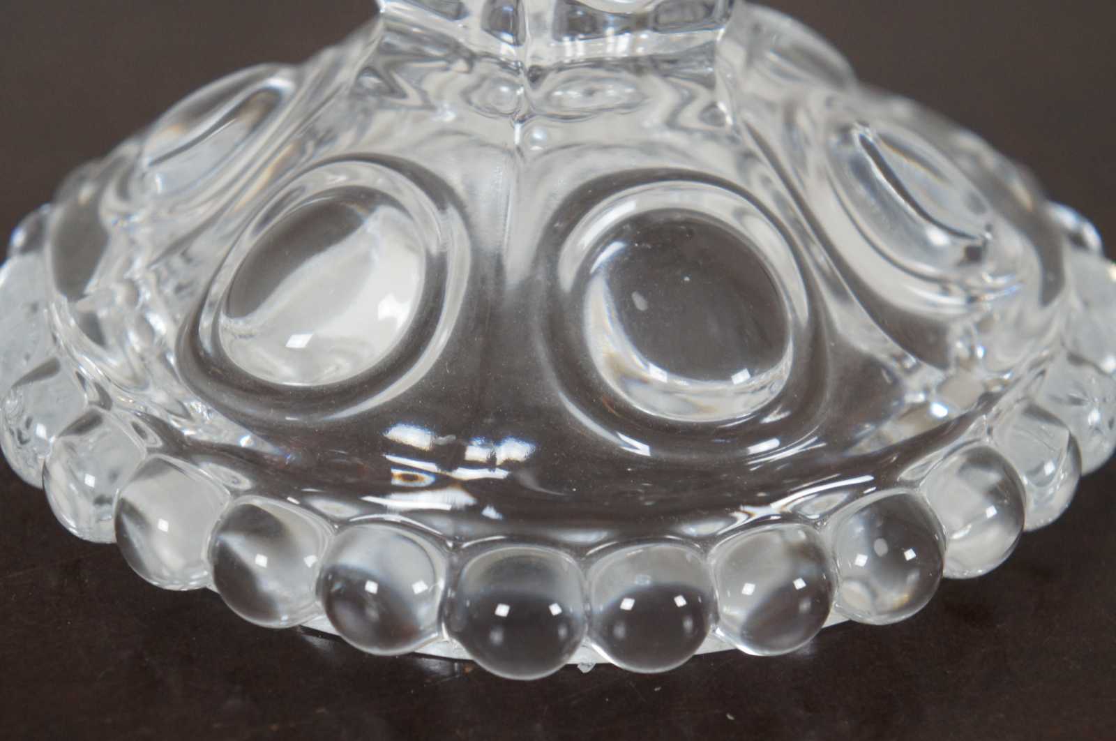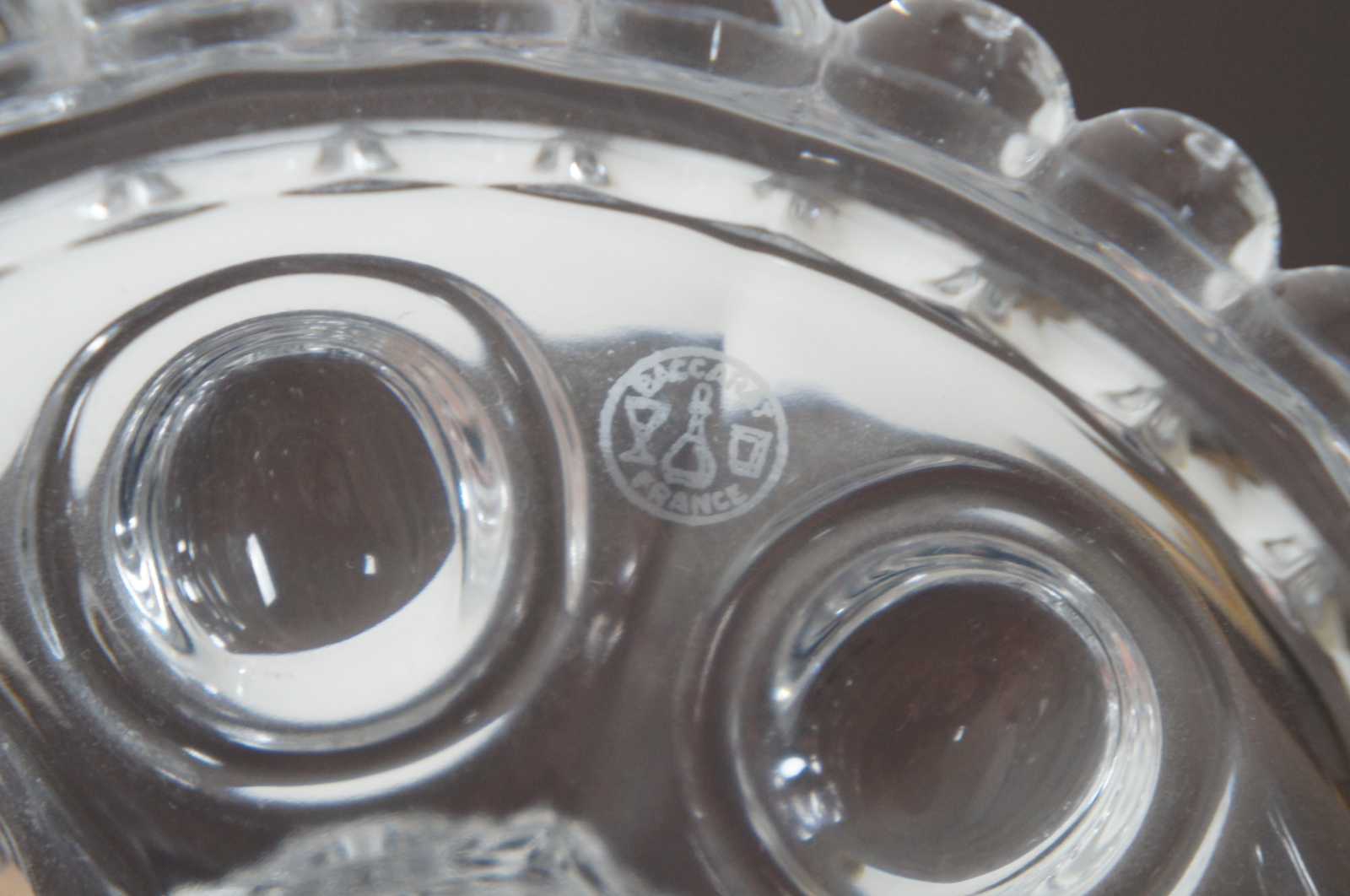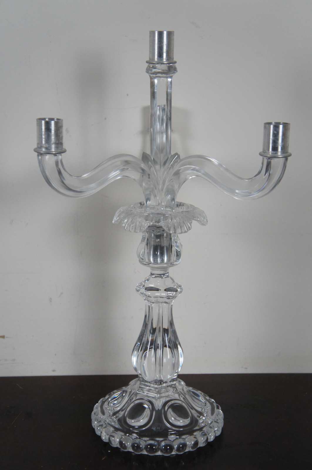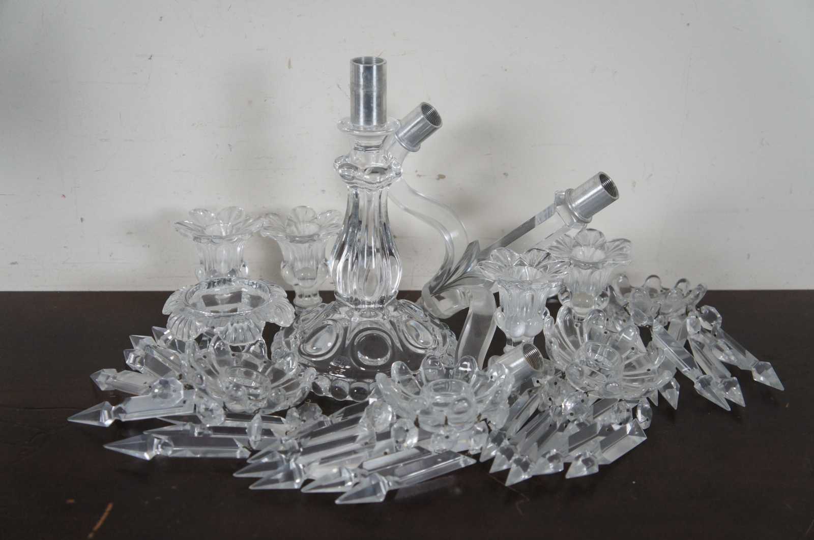 Pair of elegant Baccarat cut crystal candelabras with four flower shaped bobeches / candle holders surrounded by drop crystals / prisms. Marked on base. Made in France.