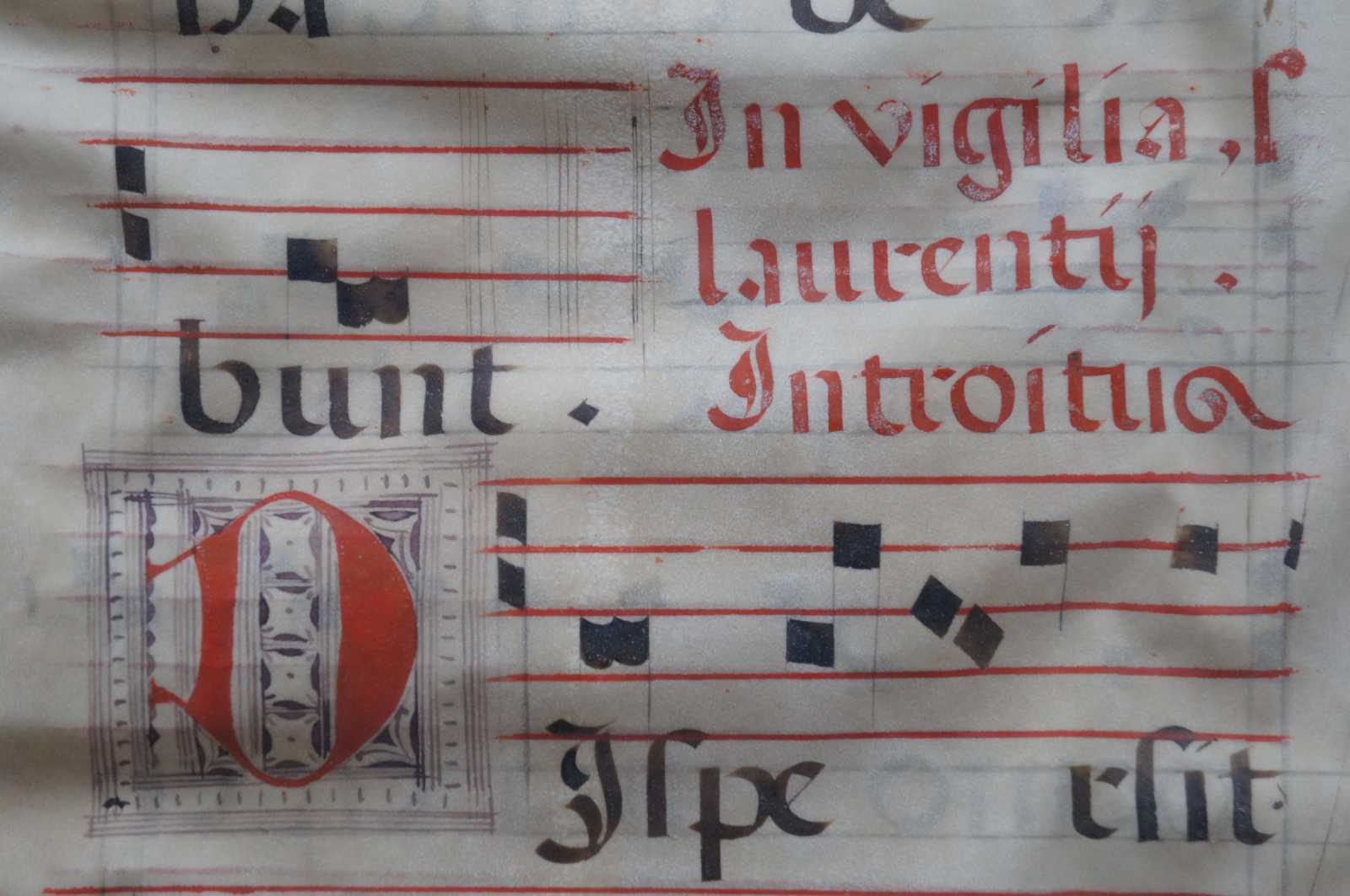 Framed 17th century Roman Catholic sheet music hand written in Latin on vellum in red and black ink.