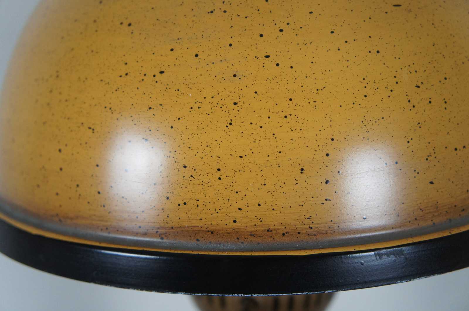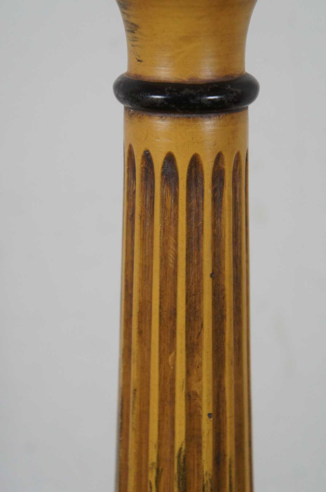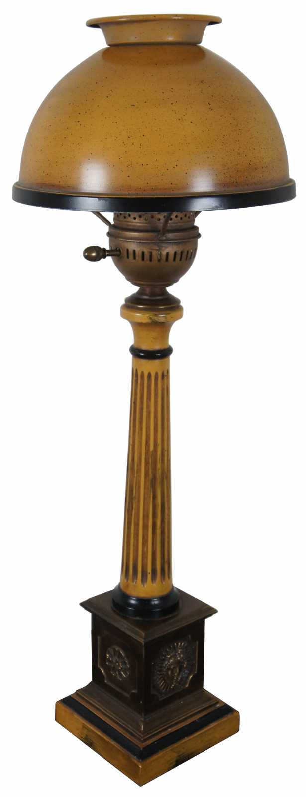 Vintage Grecian column shaped table lamp with neoclassical motifs around the base, oil lamp style top with hurricane and painted yellow metal toleware shade.